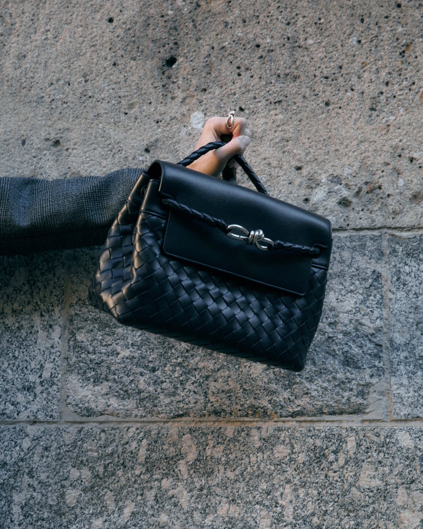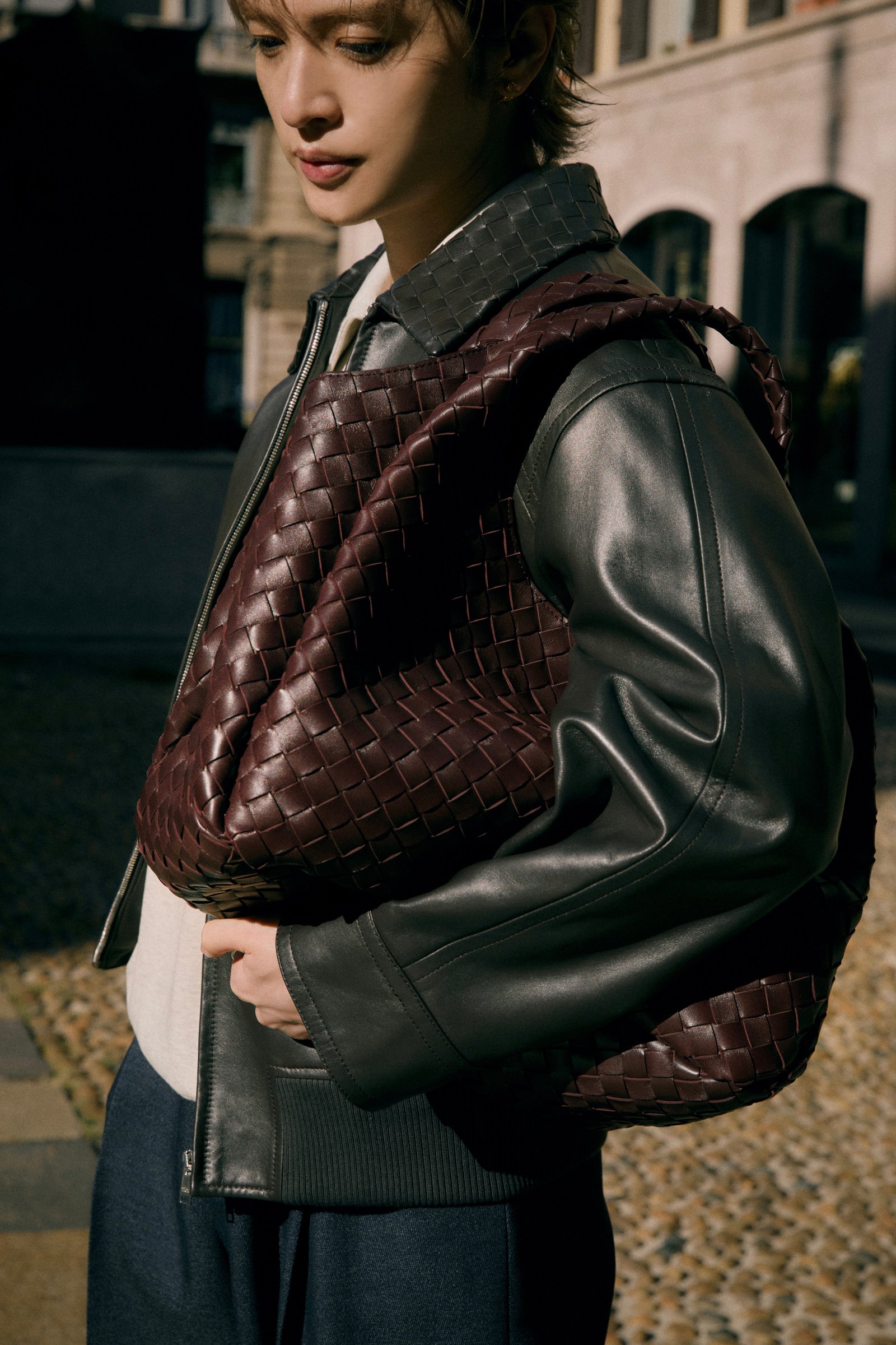 歴史の息づくミラノの街並みで、光を受けて浮かび上がる編み込みの陰影は、時とともに息づく手仕事の温もりが宿り、まるでアートピースのように深みを増す。