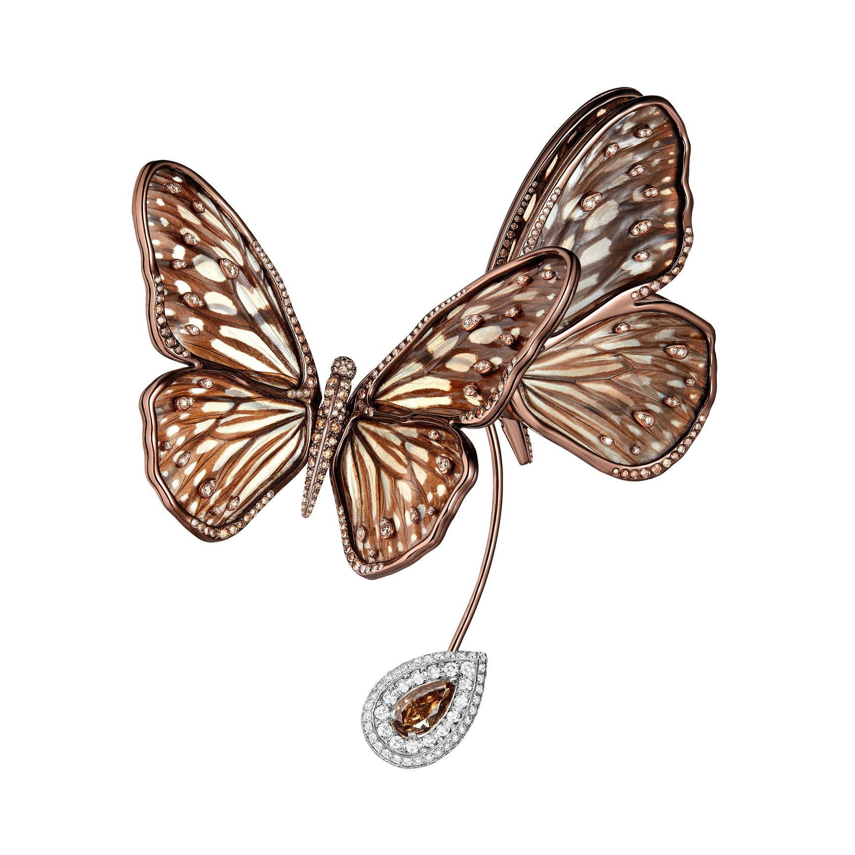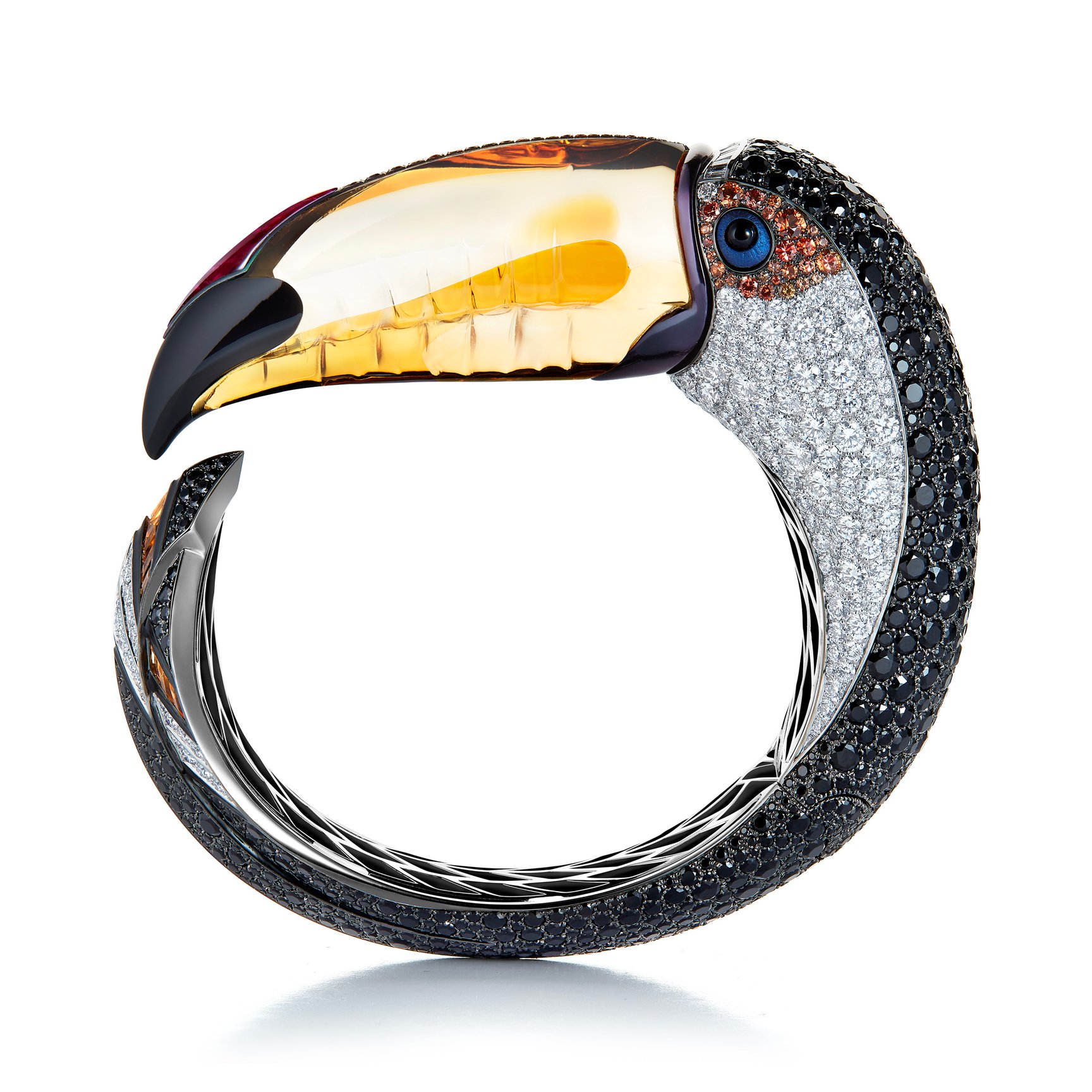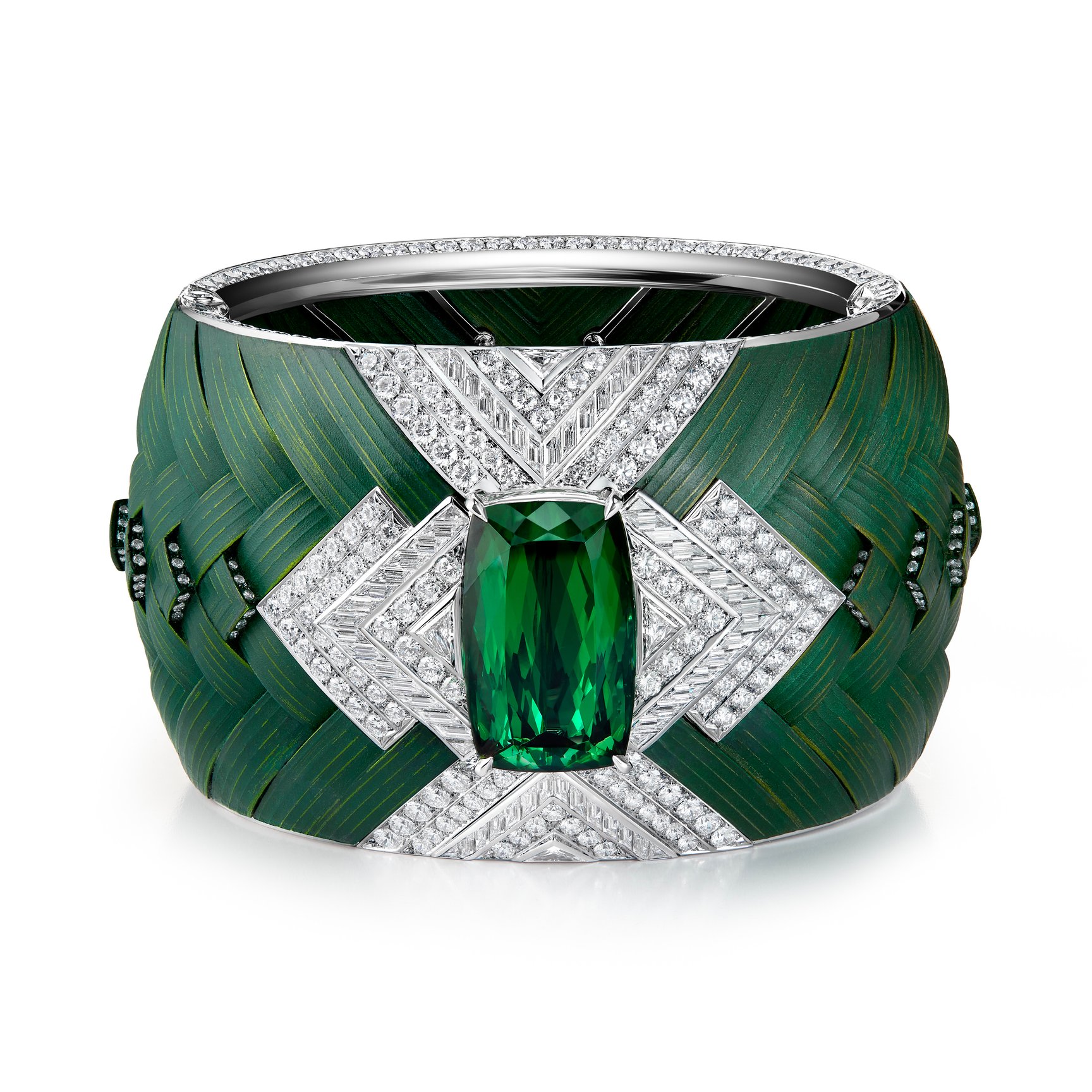 「LEAF WOMAN」のインスピレーション源は熱帯雨林。「フイヤージュ ディアマン カフブレスレット」は、アルミニウムをカタフォレシス(電気誘導)させることによって植物を織り上げたようなデザインを実現。中央にはグリーントルマリンをセットした。熱帯に生息する蝶ブルガリスアサギマダラの羽を用いた「パピヨンブローチ」、3石のシトリンを組み合わせて南米の鳥オオハシのクチバシを再現した「トゥカン ブレスレット」、スネークのしなやかさをチタンで表現した「セルパン ブレスレット」など、色彩豊かな南国の世界が広がる。