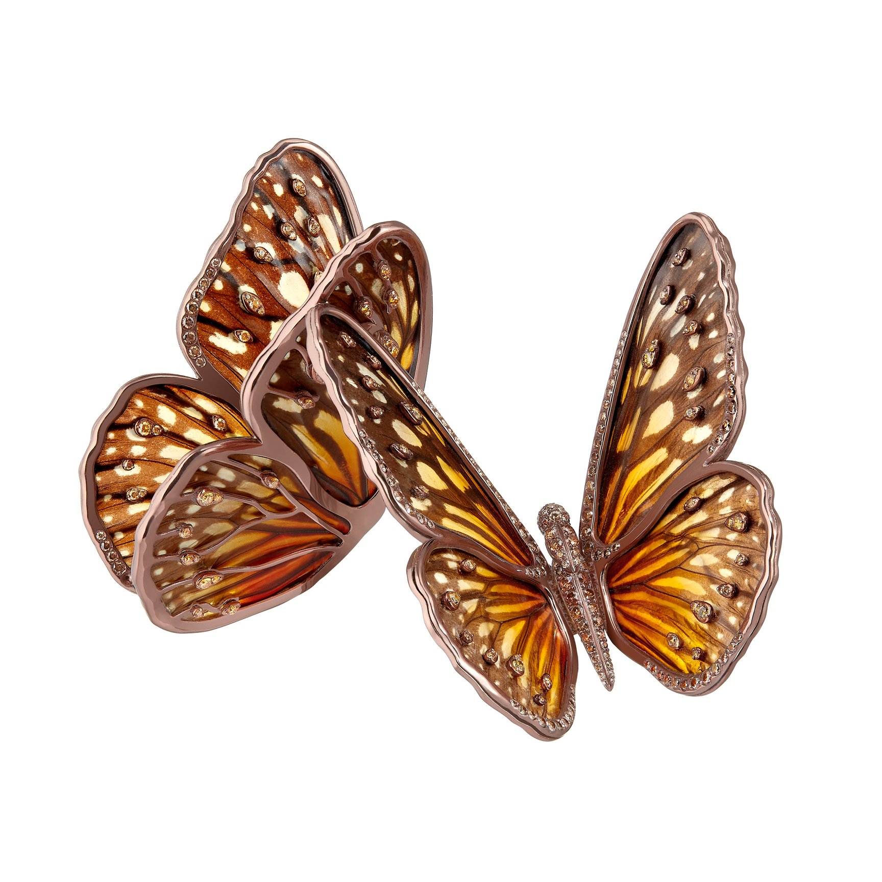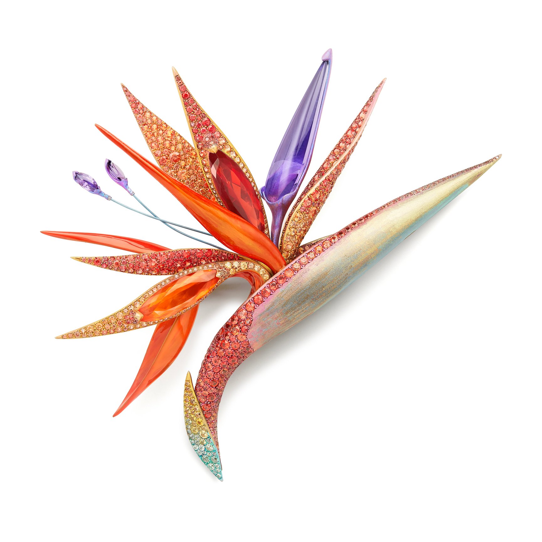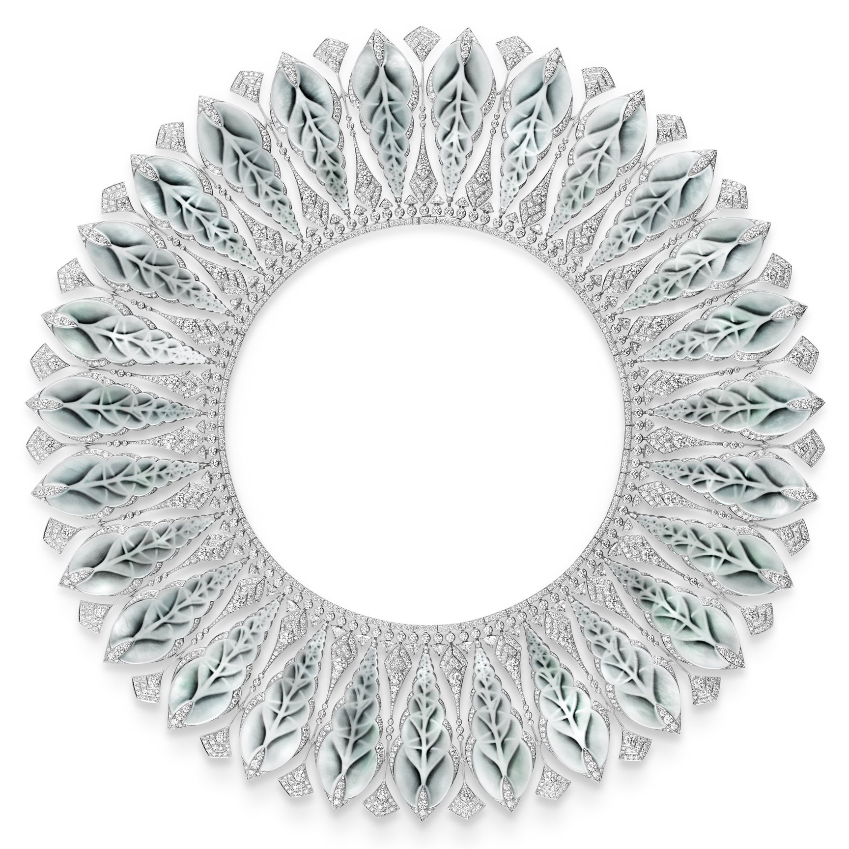 「LEAF WOMAN」のインスピレーション源は熱帯雨林。「フイヤージュ ディアマン カフブレスレット」は、アルミニウムをカタフォレシス(電気誘導)させることによって植物を織り上げたようなデザインを実現。中央にはグリーントルマリンをセットした。熱帯に生息する蝶ブルガリスアサギマダラの羽を用いた「パピヨンブローチ」、3石のシトリンを組み合わせて南米の鳥オオハシのクチバシを再現した「トゥカン ブレスレット」、スネークのしなやかさをチタンで表現した「セルパン ブレスレット」など、色彩豊かな南国の世界が広がる。
