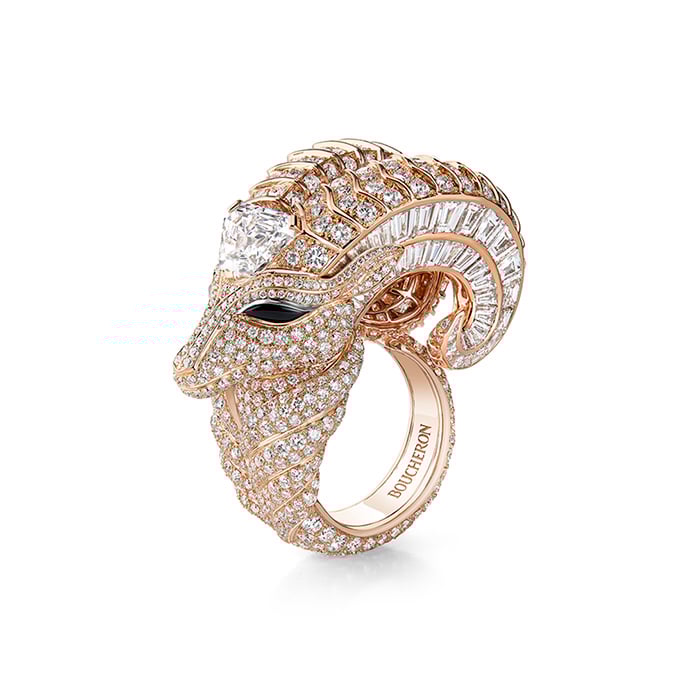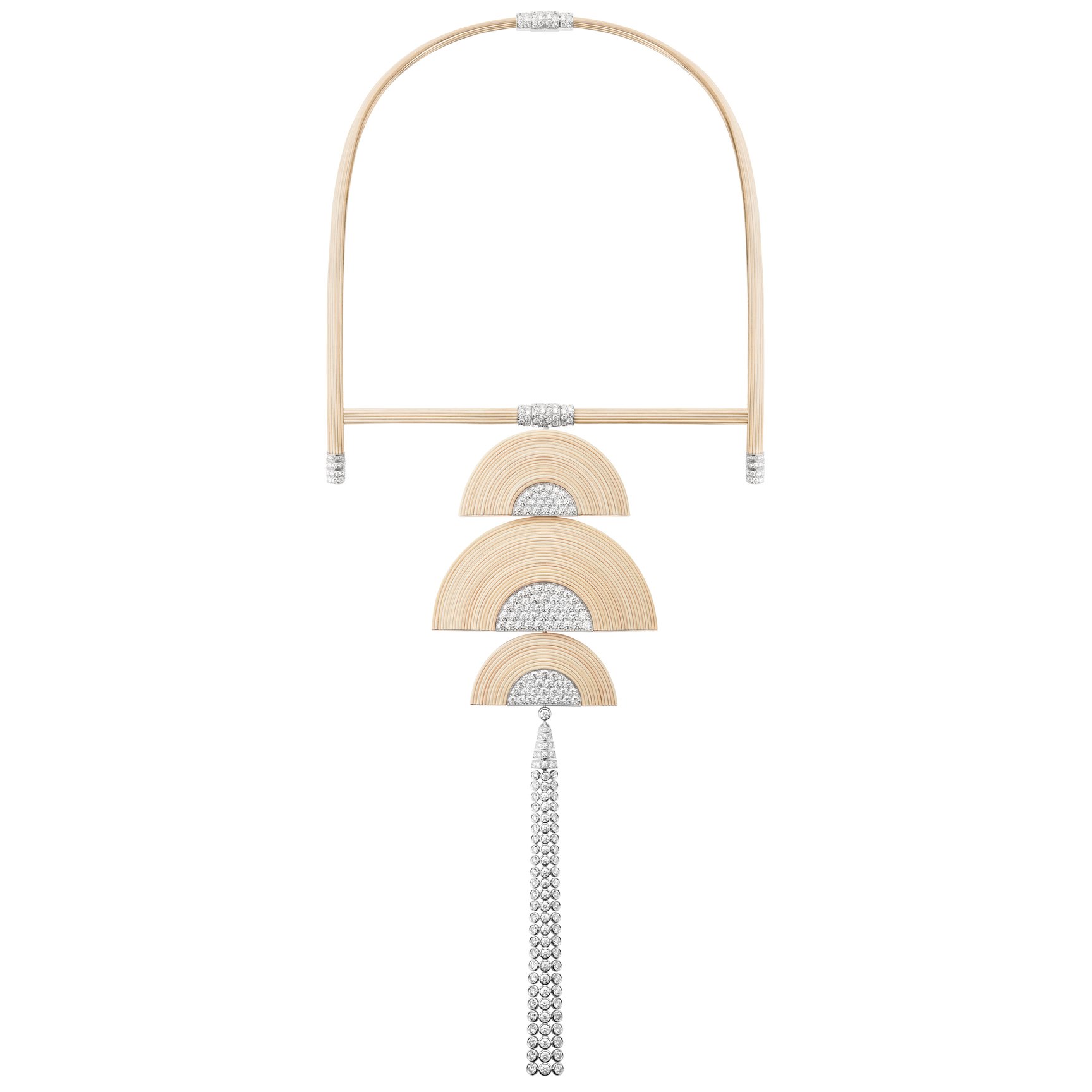 夢幻の砂漠へと誘う「SAND WOMAN」は、砂丘のベージュや曲線を取り入れたコレクション。「ロタン ディアマン ネックレス」は、籐をダイヤモンドと組み合わせた斬新で優美なデザイン。また、天然の巻き貝を用いた「コキヤージュ ディアマン イヤリング」、カササギの頭部を象った「ピー リング」、ツノが印象的な「ガゼル リング」といった、想像上の砂漠に住む生物がモチーフとなった。