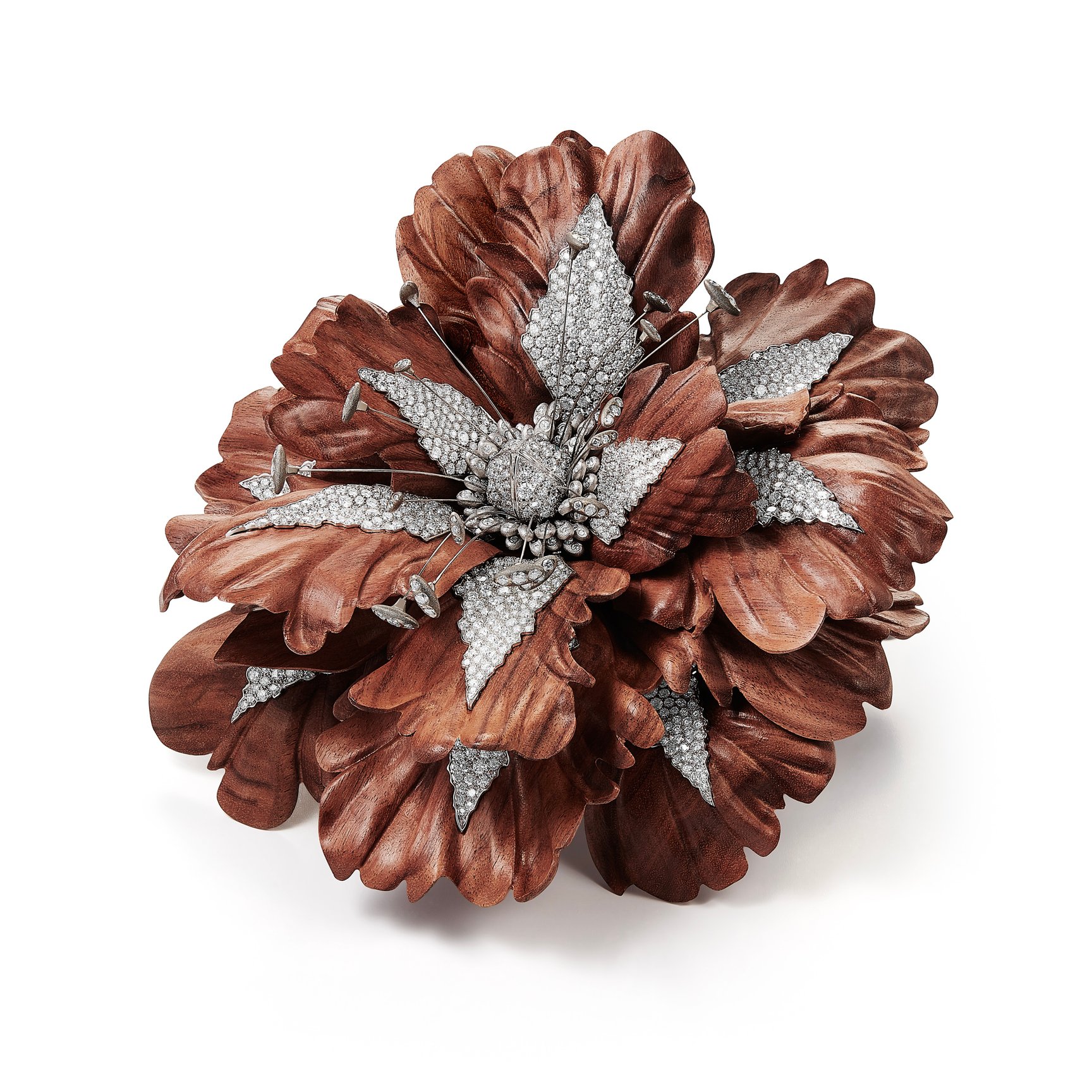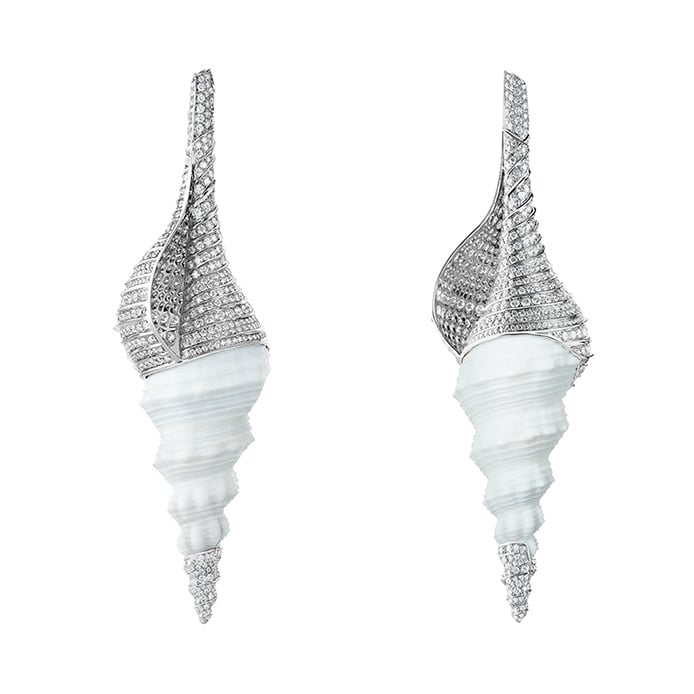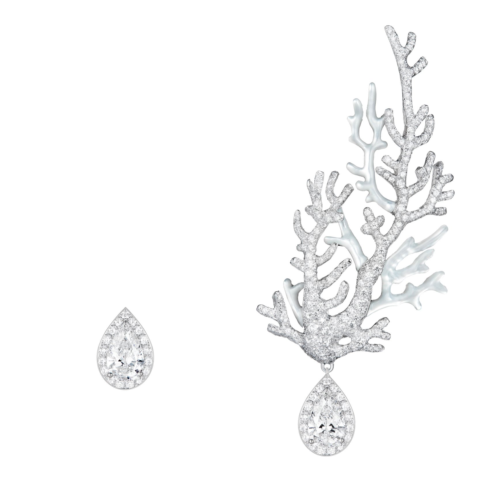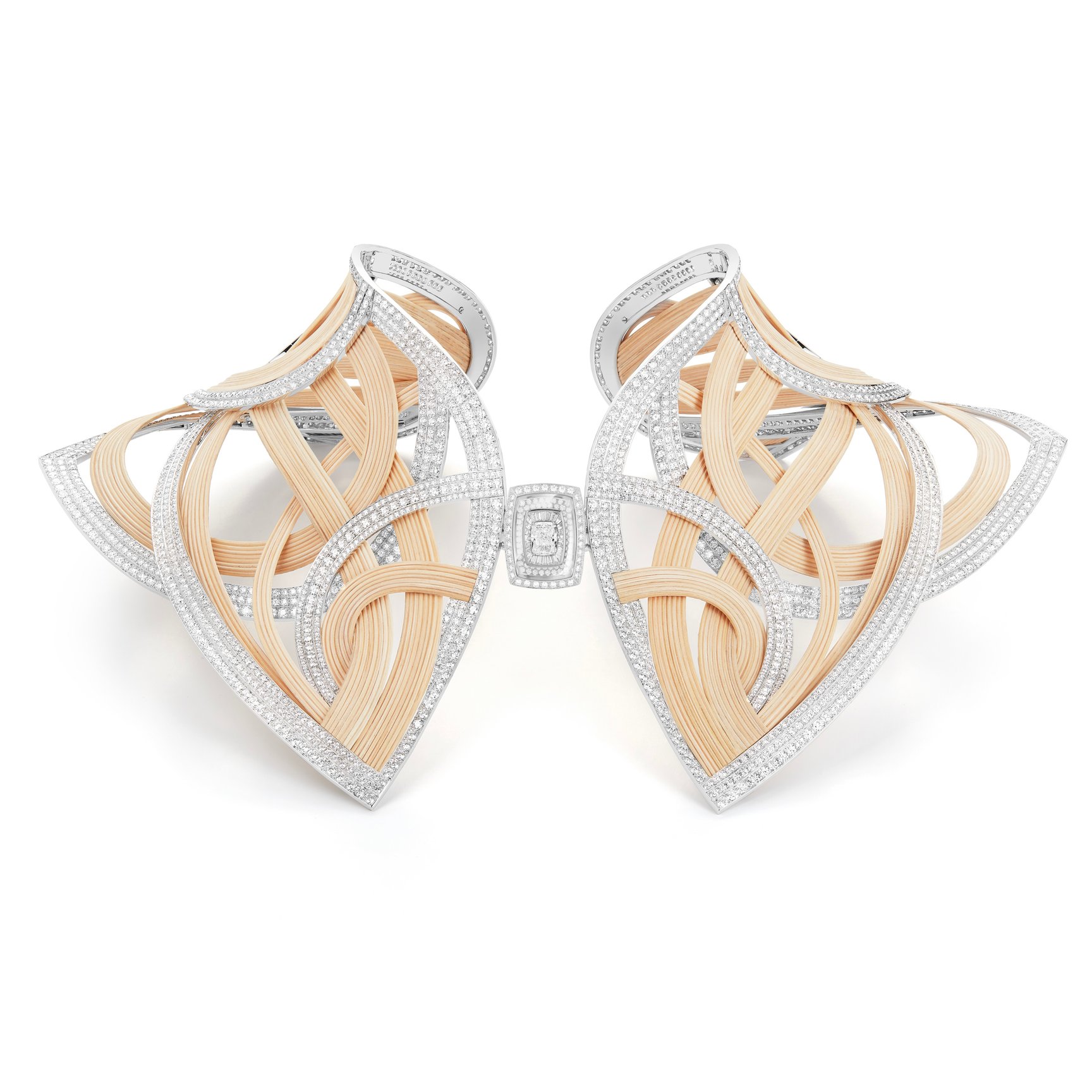 「EARTHAN WOMAN」は、オークル、ブラウン、クレイのカラーをメインに、植物や動物の有機的なフォルムを表現。磁石を用いて肩に留めるスタイルの「ボワ ディアマン ブローチ」は、ローズウッド(木材)で繊細な花びらを再現し、ゴールドとダイヤモンドを組み合わせた。地球の深い場所に存在する結晶から着想を得た「クリストー イヤリング」、2つの巻貝を組み合わせた「ジャック コキヤージュ ブローチ」など、大地の力強さを讃えるコレクションとなっている。