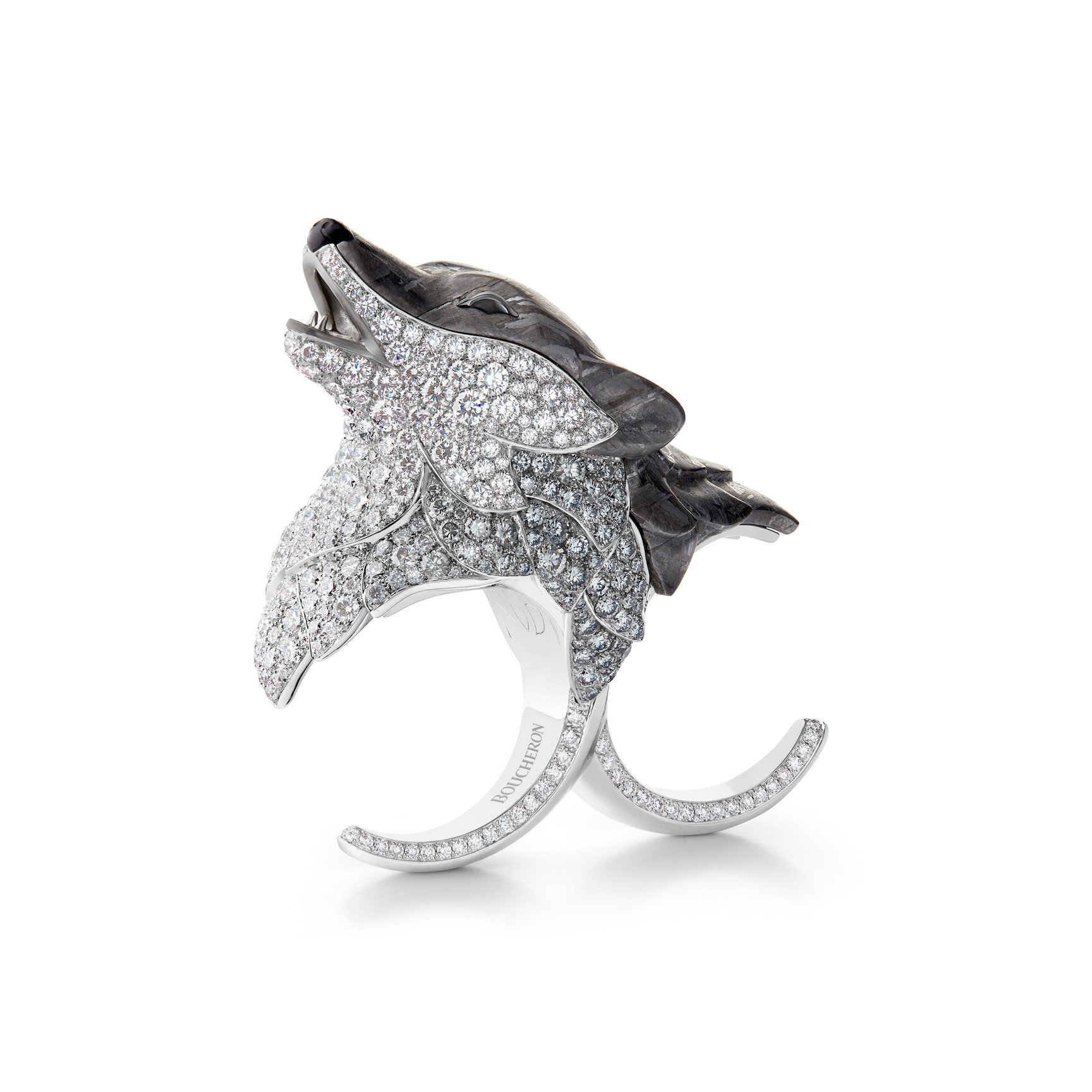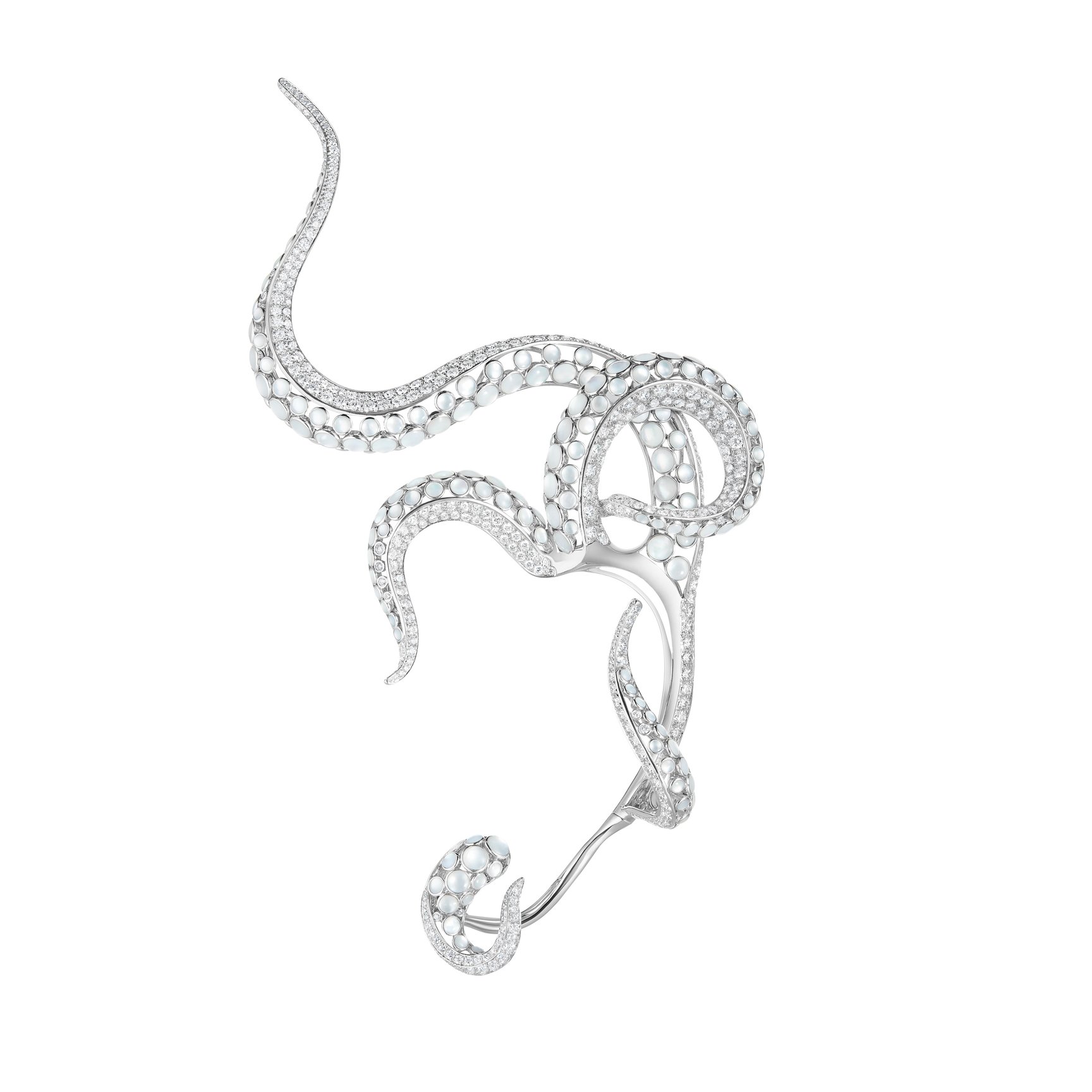 今回のコレクションで唯一、男性をイメージした「VOLCANO MAN」は、地球の奥深くの極限の世界を支配するマグマのような力を探る。X線を通したような貝の内側の螺旋構造をエアブラシで描いたマザーオブパールとホワイトゴールドの「コキヤージュネックレス」は、見る人に立体的な錯覚をもたらす。「ボワ ブリュレ ディアマン ネックレス」は、日本の焼杉の伝統技法を用いて炭化させたオーク材とダイヤモンドを組み合わせた。月に吠えるオオカミの姿を表現した「ルウ リング」にはメテオライト(隕石)を用いている。マザーオブパールを用いた「オクトパス イヤリング」は、タコの足が耳に絡まるような大胆なデザインとなっている。