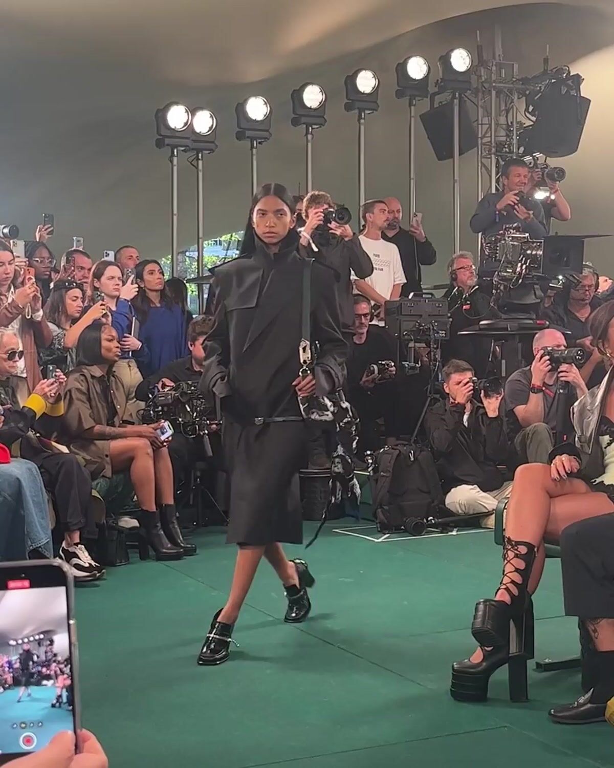 犬の鳴き声が響き、ブランドを象徴するトレンチコートのルックでショーは幕を開けた。バッグ以外は黒一色のコーディネートは、前回のファーストコレクションで見せたオーバーサイズやカラフルさとは異なる方向性を強く打ち出した。簡素化されたトレンチコートのディテールでは直線的なラインが強調され、ヒップラインまで下がったベルトが新鮮なプロポーションを生み出している。ダニエル・リーらしい構築的ソリッドさが実現され、ブランドから課された"トレンチコート"という命題に独自の解答を見い出したようだ。