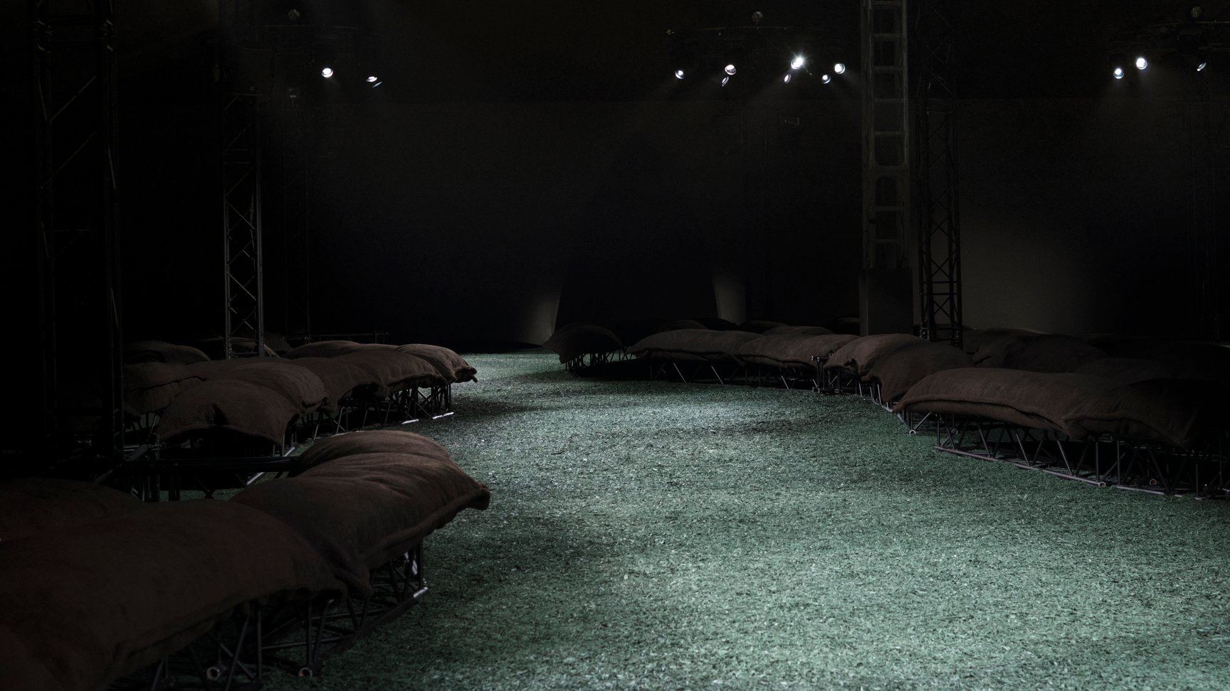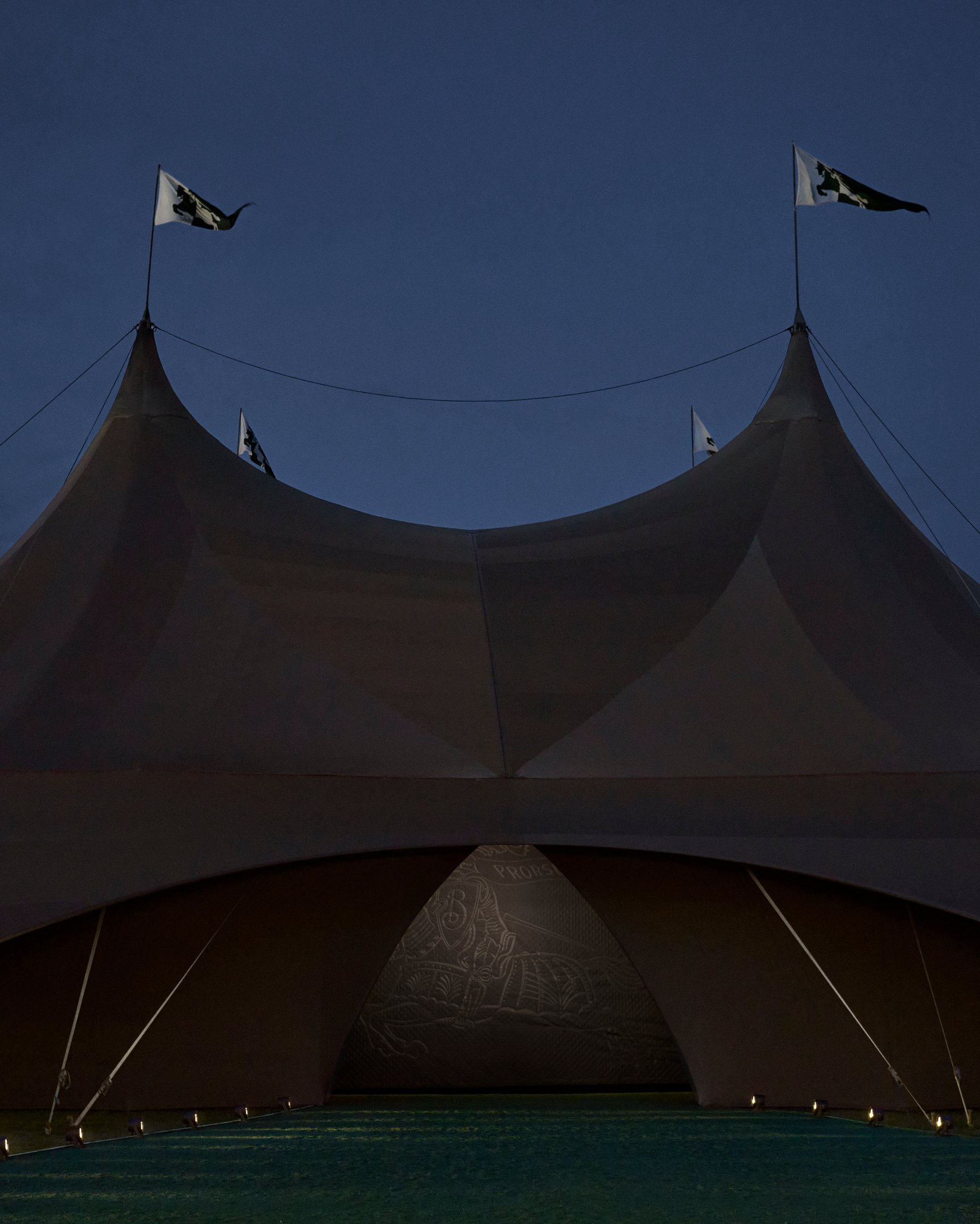 ショー会場となったのは、ロンドン東部のヴィクトリアパークに設置された、ブラウンカラーの特設テント。ダニエルのデビューコレクション以来、3回連続で公園でのコレクションを発表となり、ブランドの原点であるアウトドアのレガシーを印象づける戦略的な選択だ。床はモスグリーンのチップで覆われ、ゲストの席には厚手の茶色のクッションが用意された。前回までは、タープやブランケットなどにチェック柄が配されていたが、今回はモノクロームのアースカラーで統一され、落ち着きが感じられた。