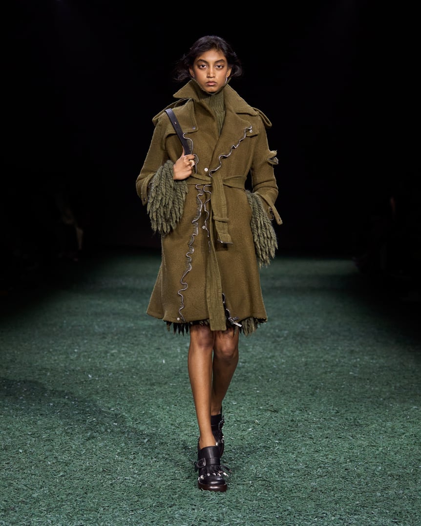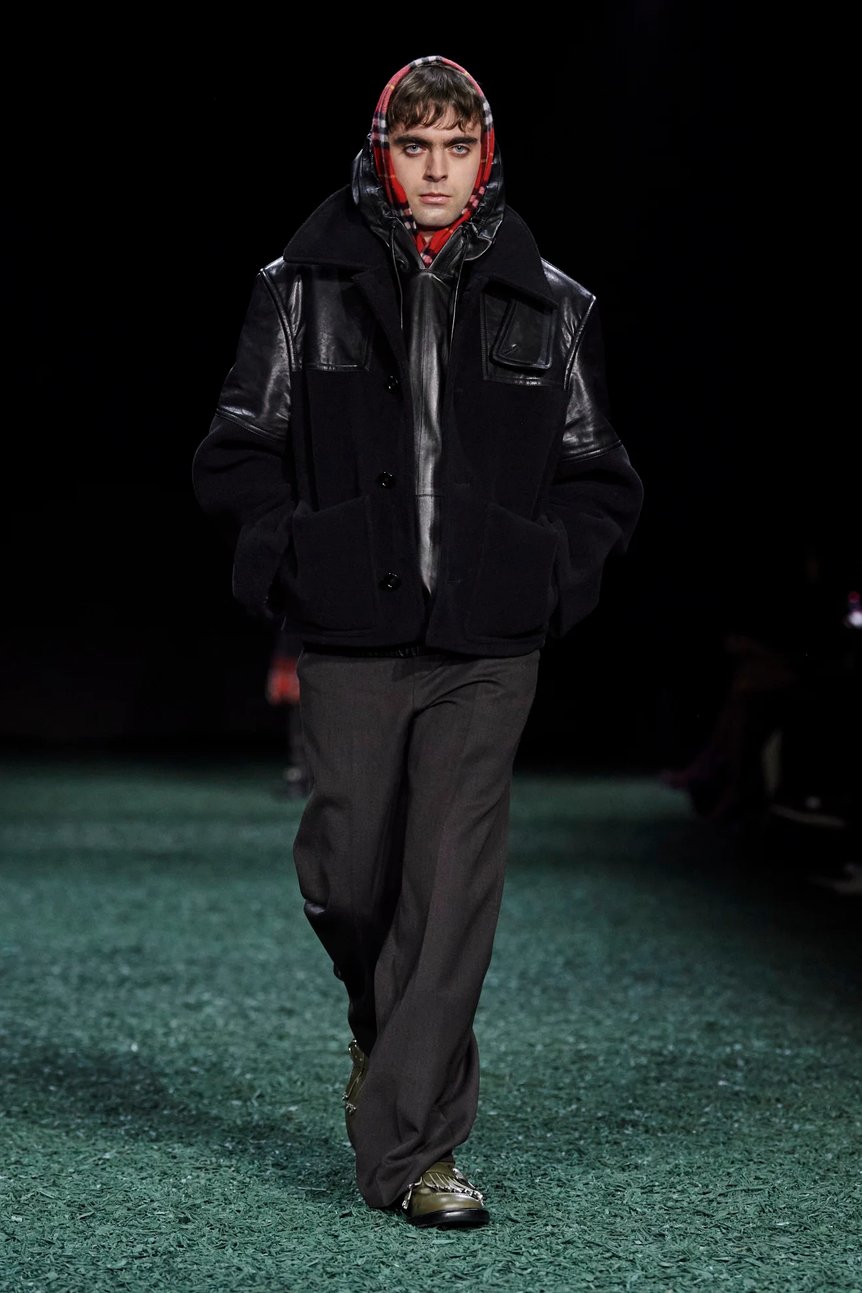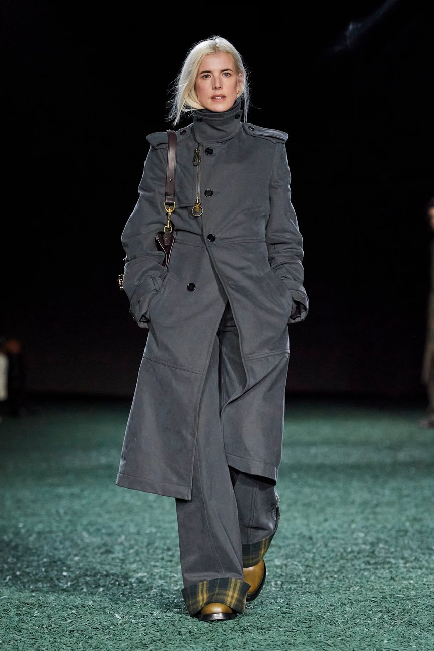 Iラインのトレンチコートをまといファーストルックとして歩いてきたのは、かつてのスーパーモデル、アギネス・ディーン(Agyness Deyn)。のちにナオミ・キャンベル(Naomi Campbel)やリリー・コール(Lily Cole)、リリー・ドナルドソン(Lily Donaldson)といった英国を代表するモデルのほか、リアム・ギャラガー(Liam Gallagher)の息子のレノン・ギャラガー(Lennon Gallagher)やフィービー・ファイロ(Phoebe Philo)の娘のマヤ・ウィグラム(Maya Wigram)など2世モデルもランウェイを闊歩した。トレンチコートは、沈んだチェック柄のワックスドコットンやレザーなど豊富なバリエーションが見られ、ダニエルが「ボッテガ・ヴェネタ(Bottega Veneta)」時代から好んでいるモップのようなディテールも多く登場。フロントに配されたオーバーパンツ由来のロングジップやスタッズなど、パンク要素も随所に取り入れられている。