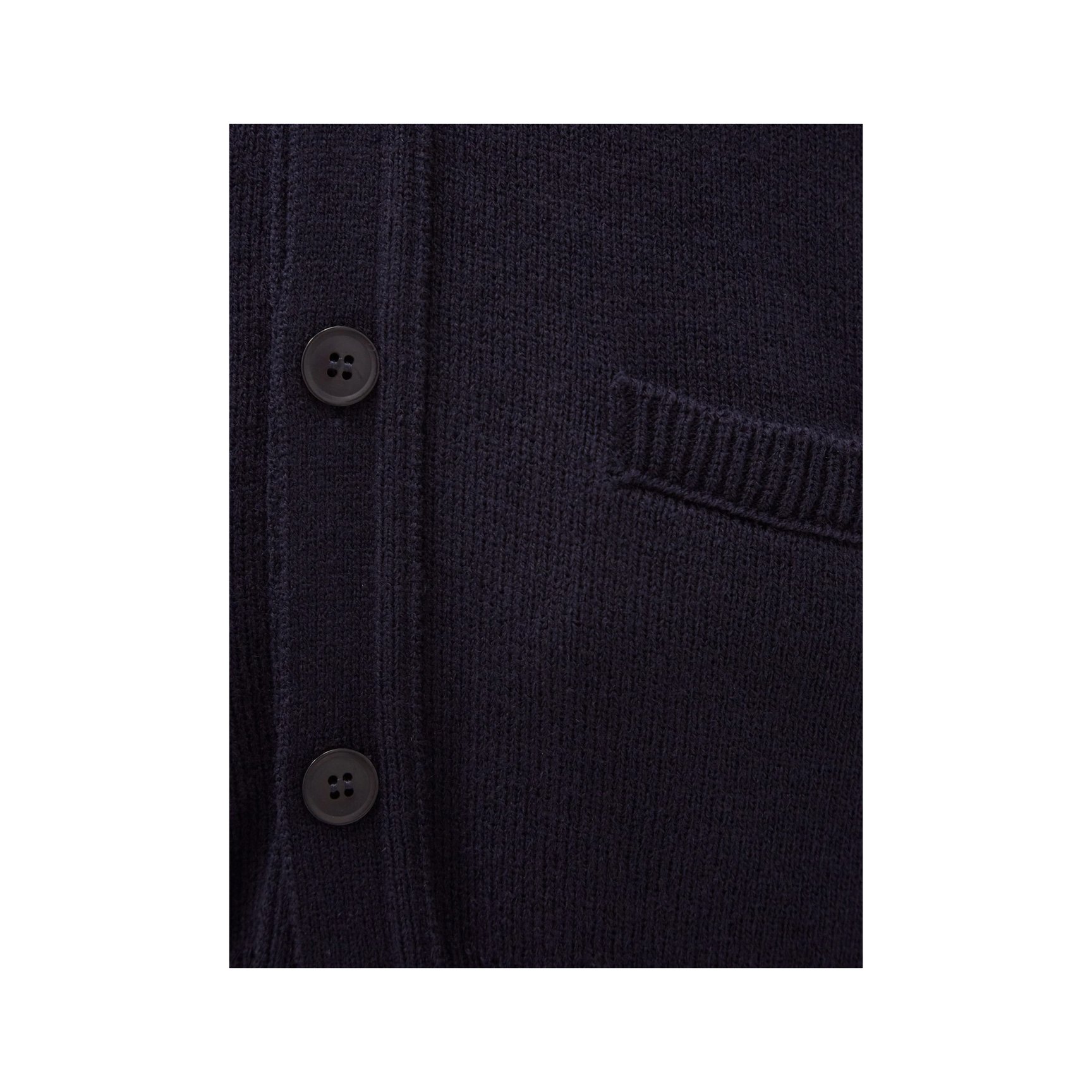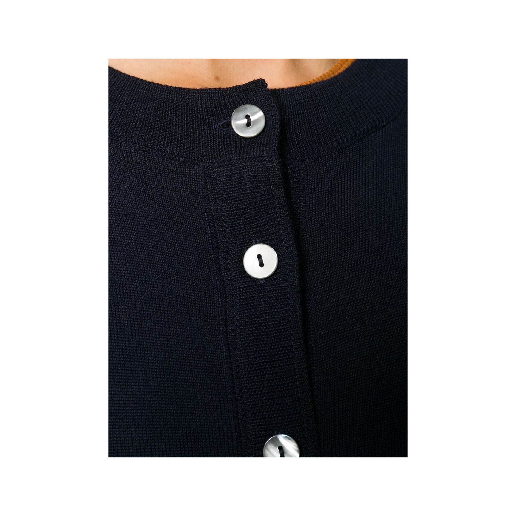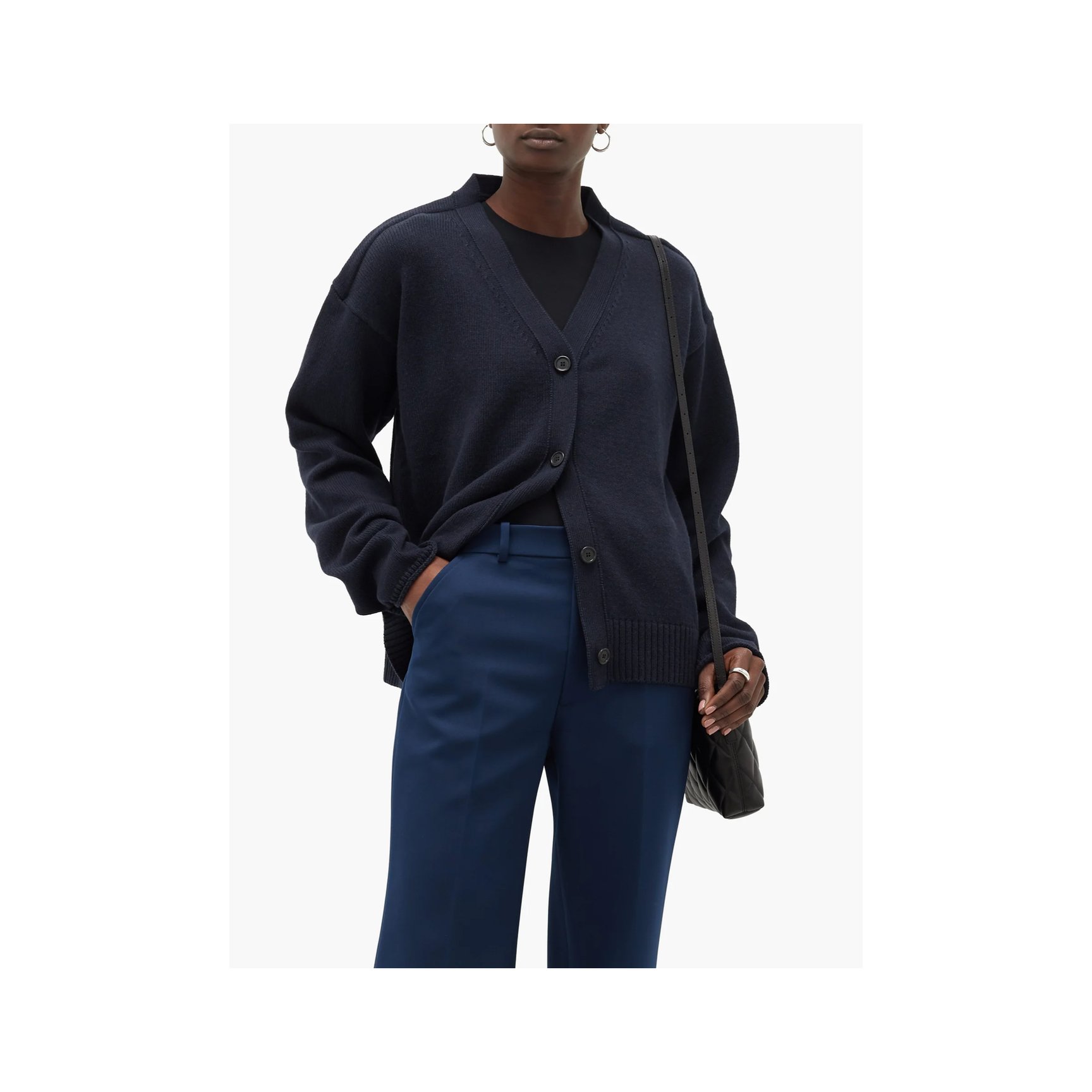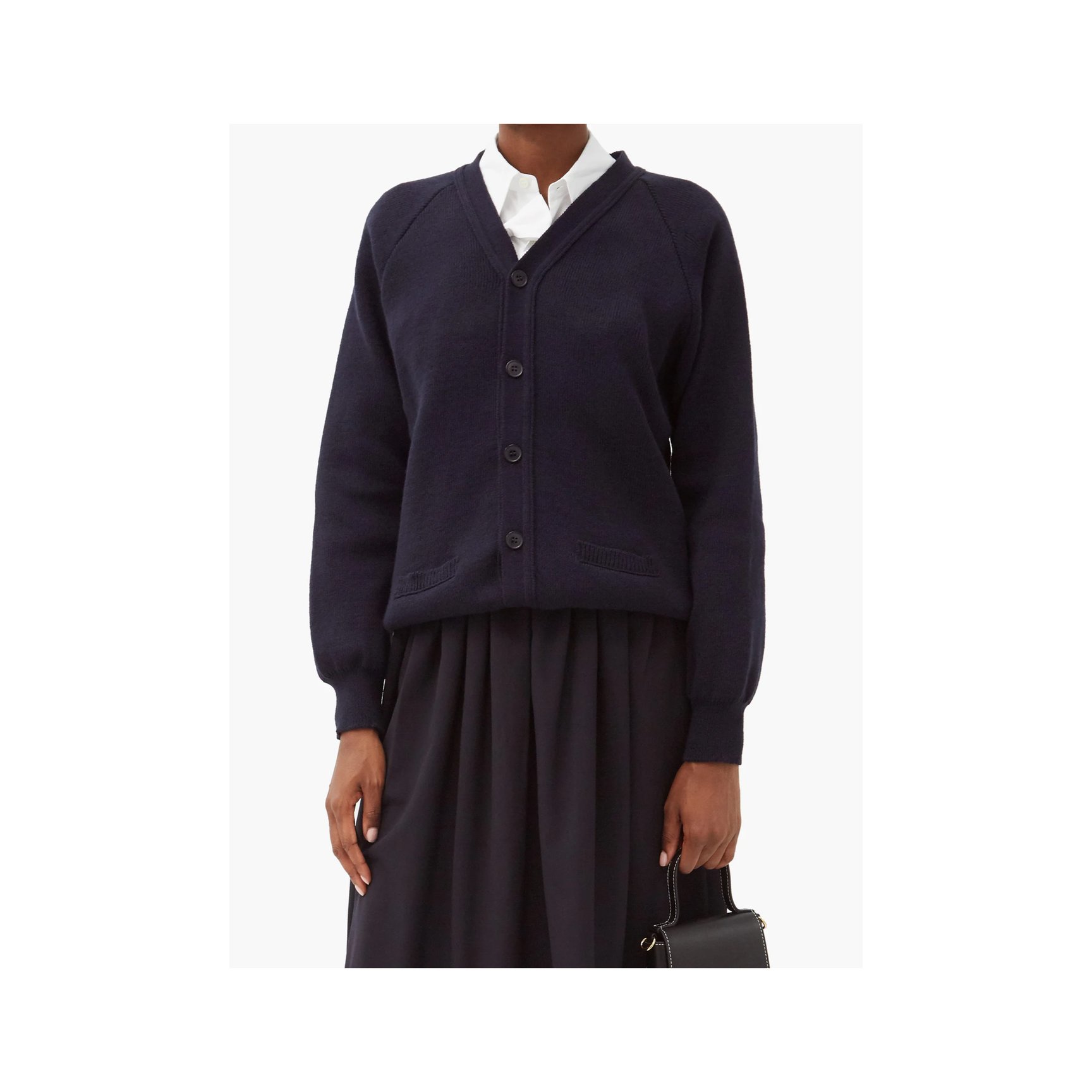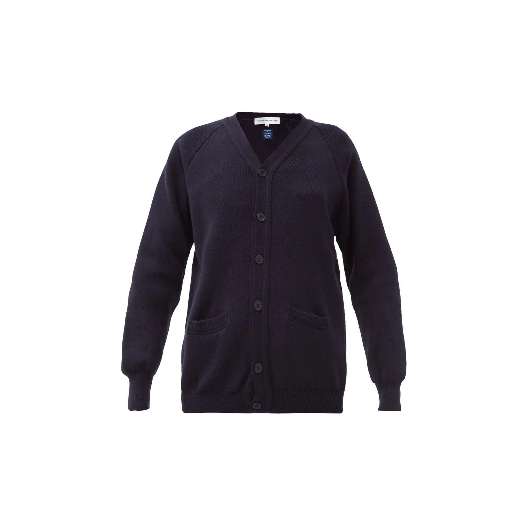 まずは定番から。ネイビーのオーソドックスなカーディガンは「コム・デ・ギャルソン・ガール(COMME DES GARÇONS GIRL)」のもの。ファインゲージニットを使用したオーバーサイズのシルエットにラグランスリーブとパッチポケットを配したデザインで、Vネックは正統派なイメージです。シャツスタイルにぴったり。