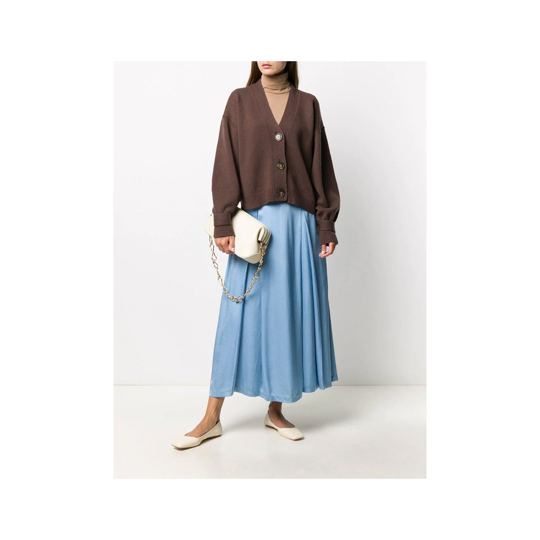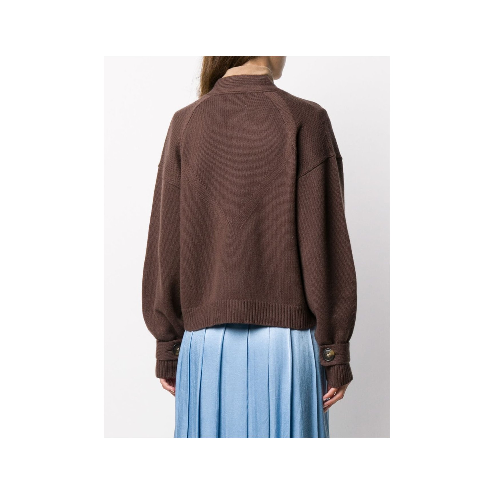 こちらは丈は短め、3つの大きめボタンがキュートな「ルル スタジオ(Loulou Studio)」のブラウンカラーのカーディガン。ドロップショルダーですが、袖にはカフスがボタンで留められておりメリハリがあるデザインなので、きれい目コーデにも使えます。カシミヤ入りウール素材のカーディガンです。