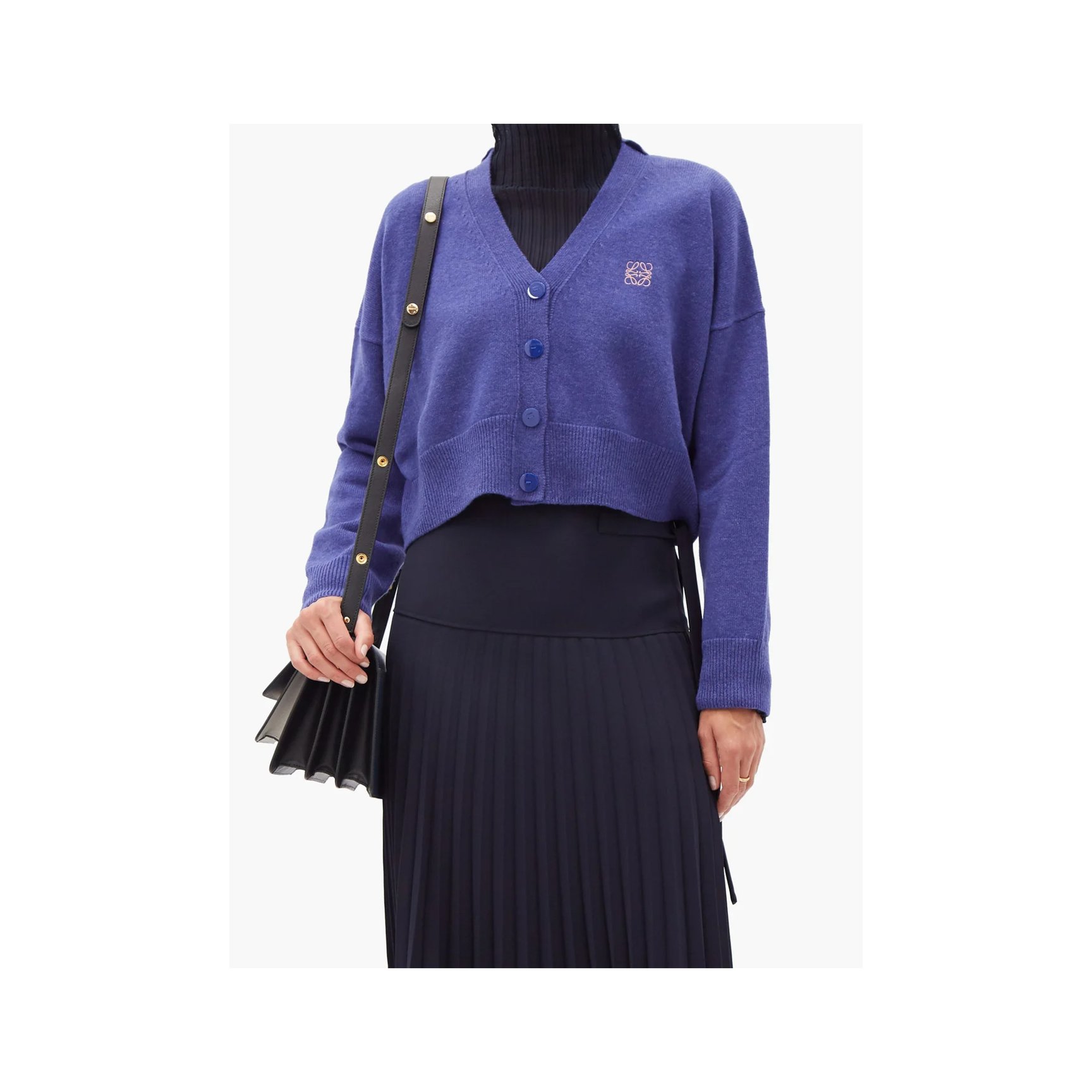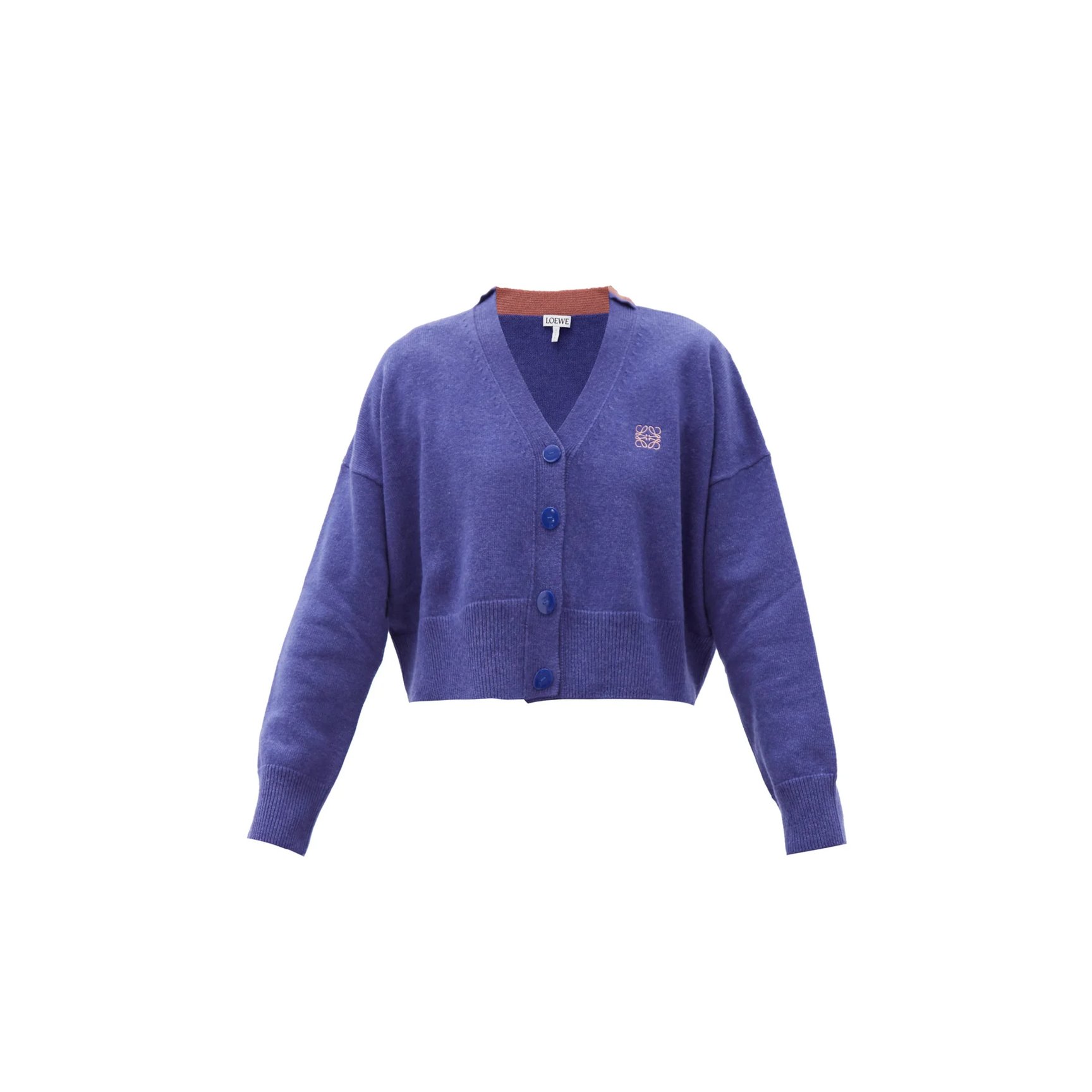 クロップド丈がおしゃれ度数高めの「ロエベ(LOEWE)」のウールセーター。バイオレットのカラーにはブルーの大きめボタンが取り付けられ、胸元に施されたブランドのアナグラム刺繍がポイントに。またネックの後ろの襟のように取り付けられたブラウンのパネルがコントラストを効かせています。