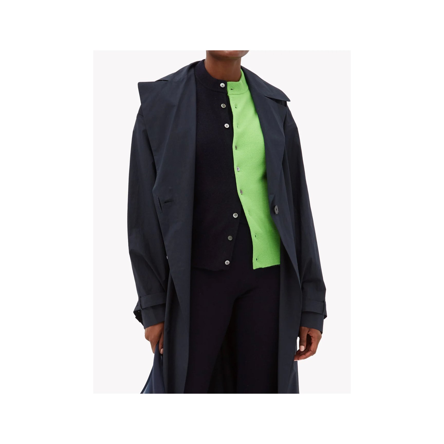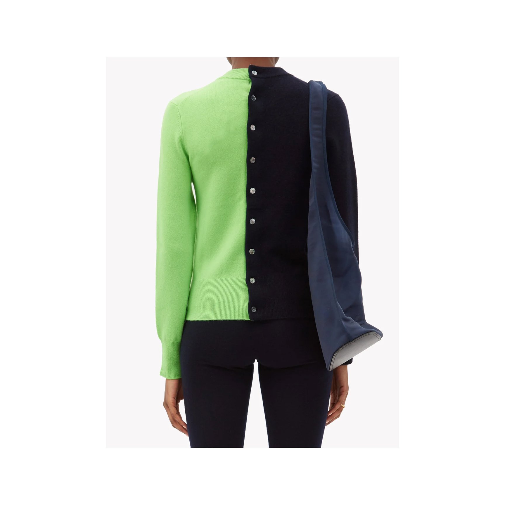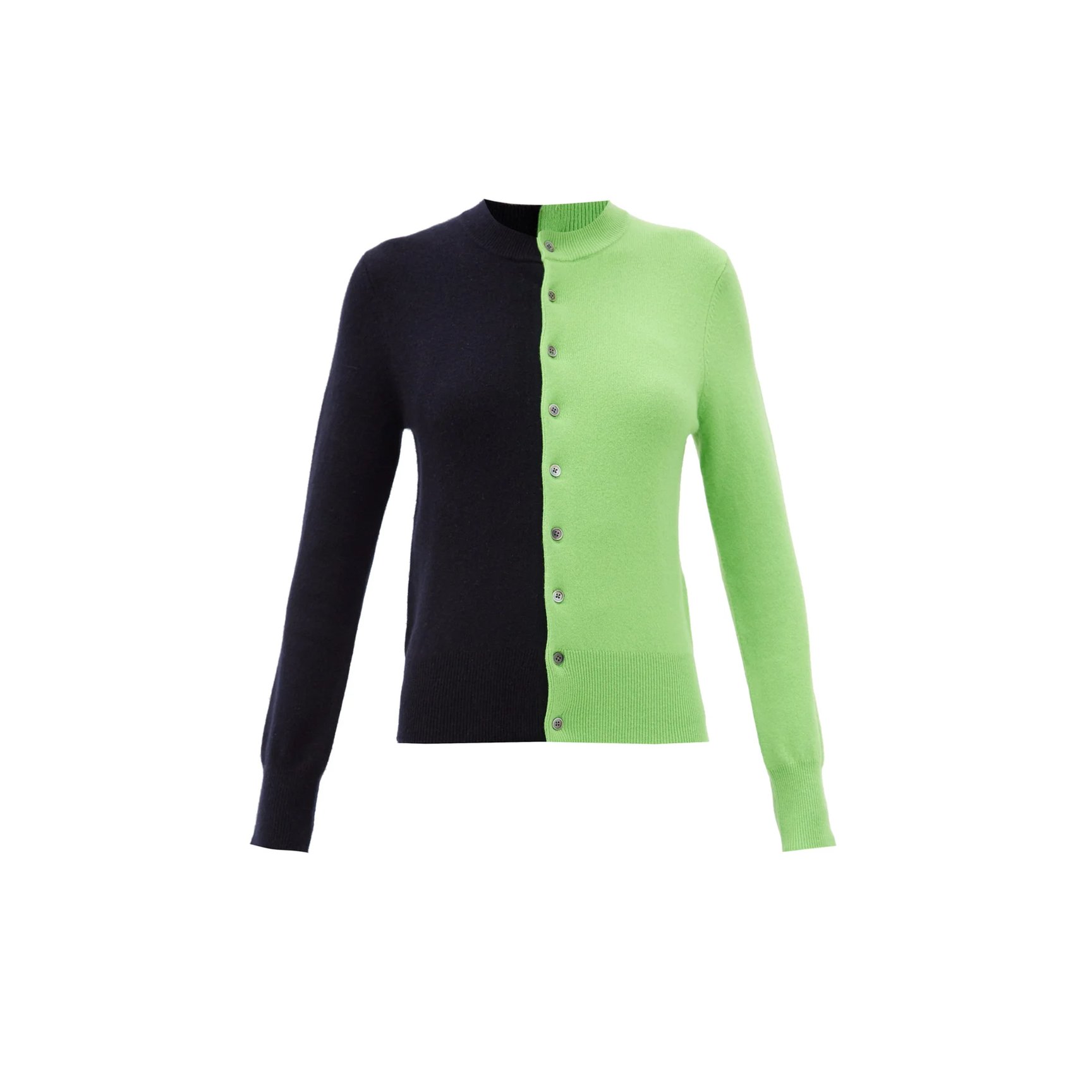 眩しいネオングリーンとブラックのコントラストがモード感満載なカーディガンは「ジョゼフ(JOSEPH)」出身の2人が立ち上げた「エクストリーム・カシミア(EXTREME CASHMERE)」のもの。柔らかなストレッチの効いたカシミアを使用し、前面・背面はどちらもボタンダウンというユニークなデザインです。ボタンはマザーオブパールを使用するなどディテールにもこだわりが見て取れます。