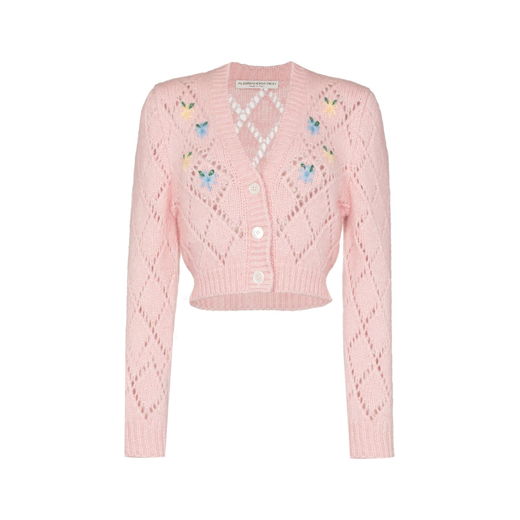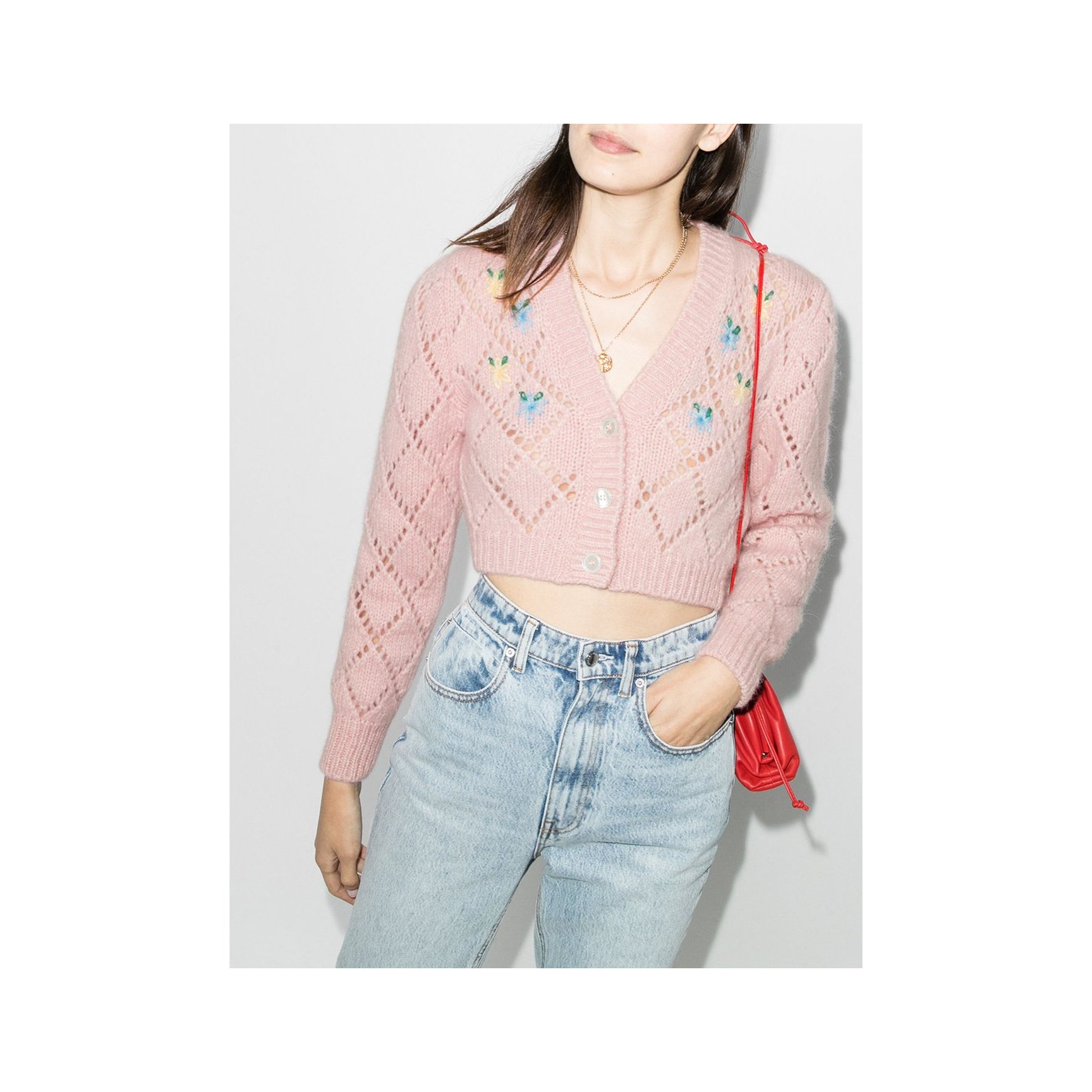 最後は思いっきりキュートな「アレッサンドラ・リッチ(Alessandra Rich)」のクロップドカーディガンを紹介。ドリーミーなピンクとフラワーエンブロイダリーがどこか懐かしさを感じさせるデザインです。羽織るというよりこの一枚でスタイルが完成するような一着。ジーンズとの相性がバッチリです。
