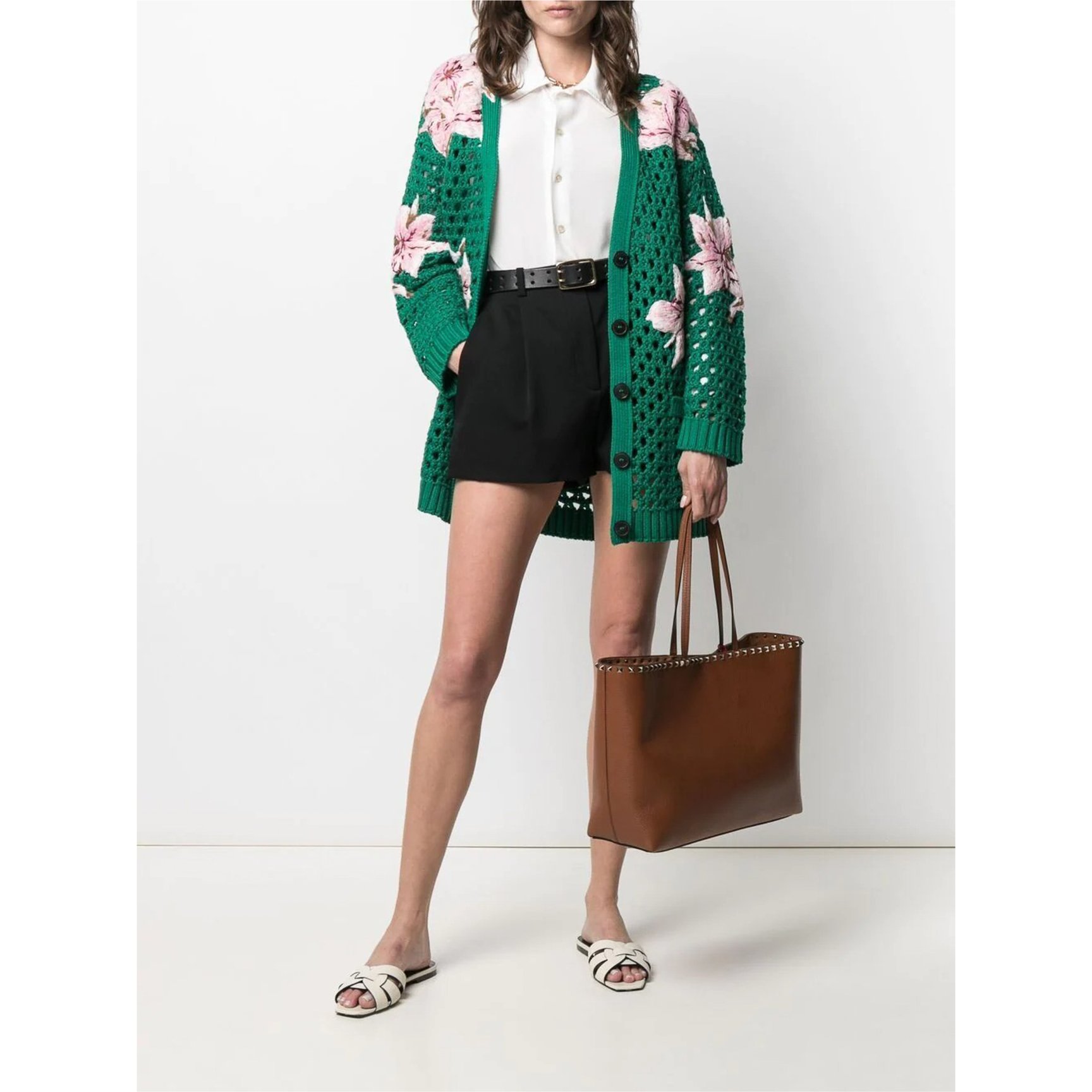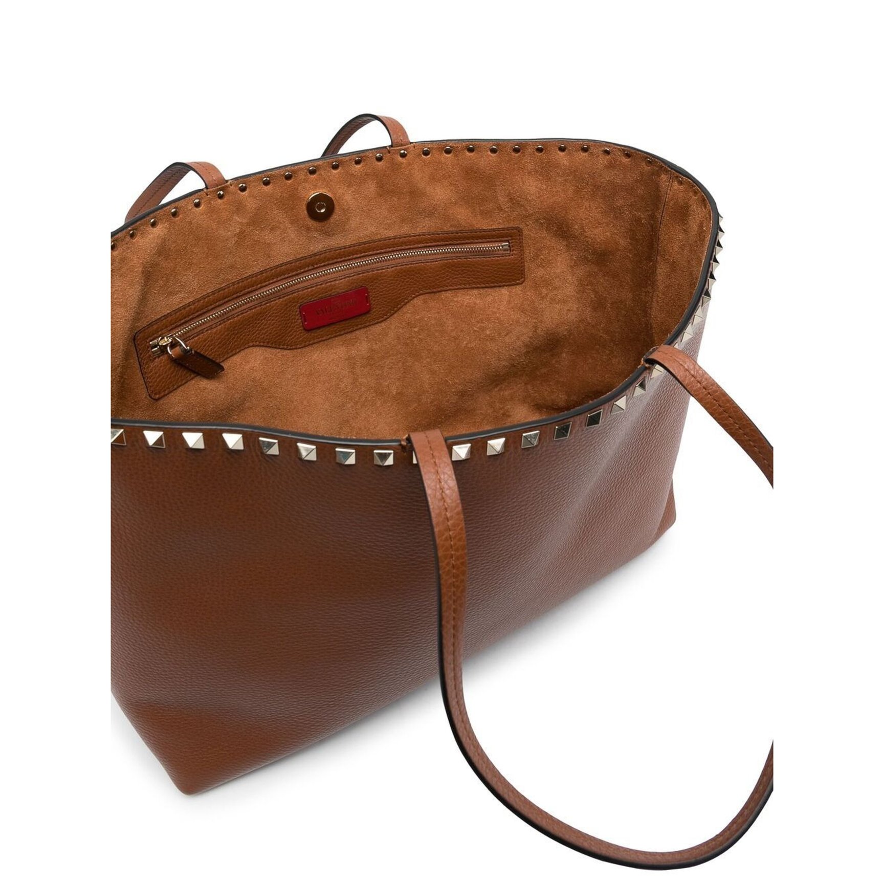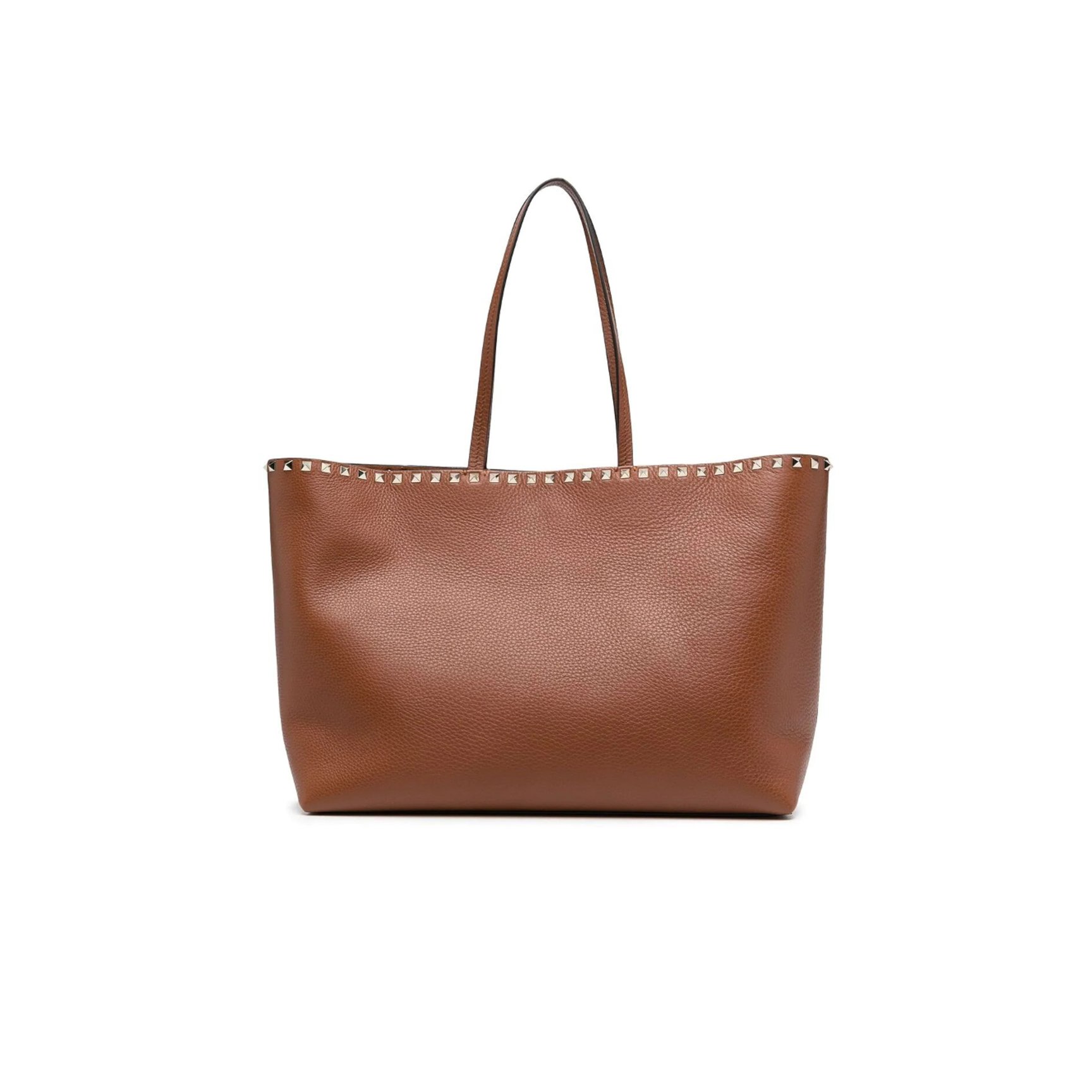 パンチのある力強さを感じる、「ヴァレンティノ(VALENTINO)」のロックスタッズが均等に並んだバッグ。明るく軽やかなブラウンに、ちらりと覗くシグネチャーのスタッズがアクセントになった、柔らかく扱いやすいカーフレザーの質感も嬉しいアイテムです。ピンクやダークブラウンなど、色違いの展開もあり。