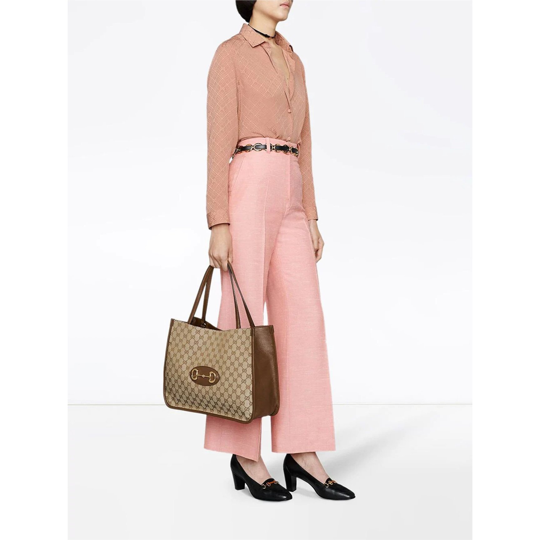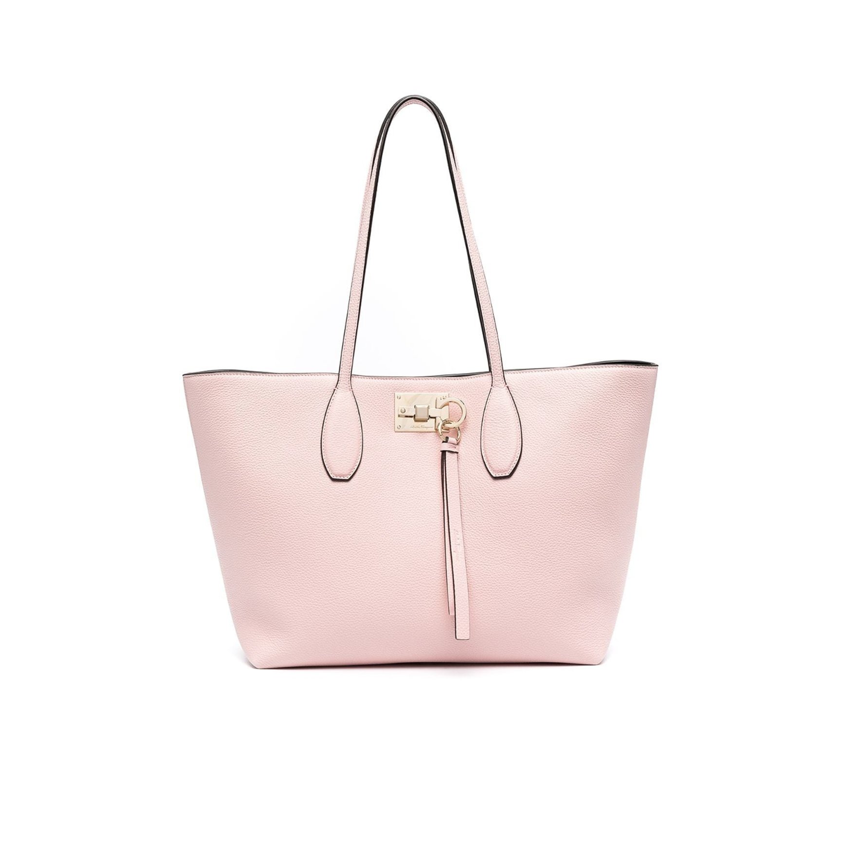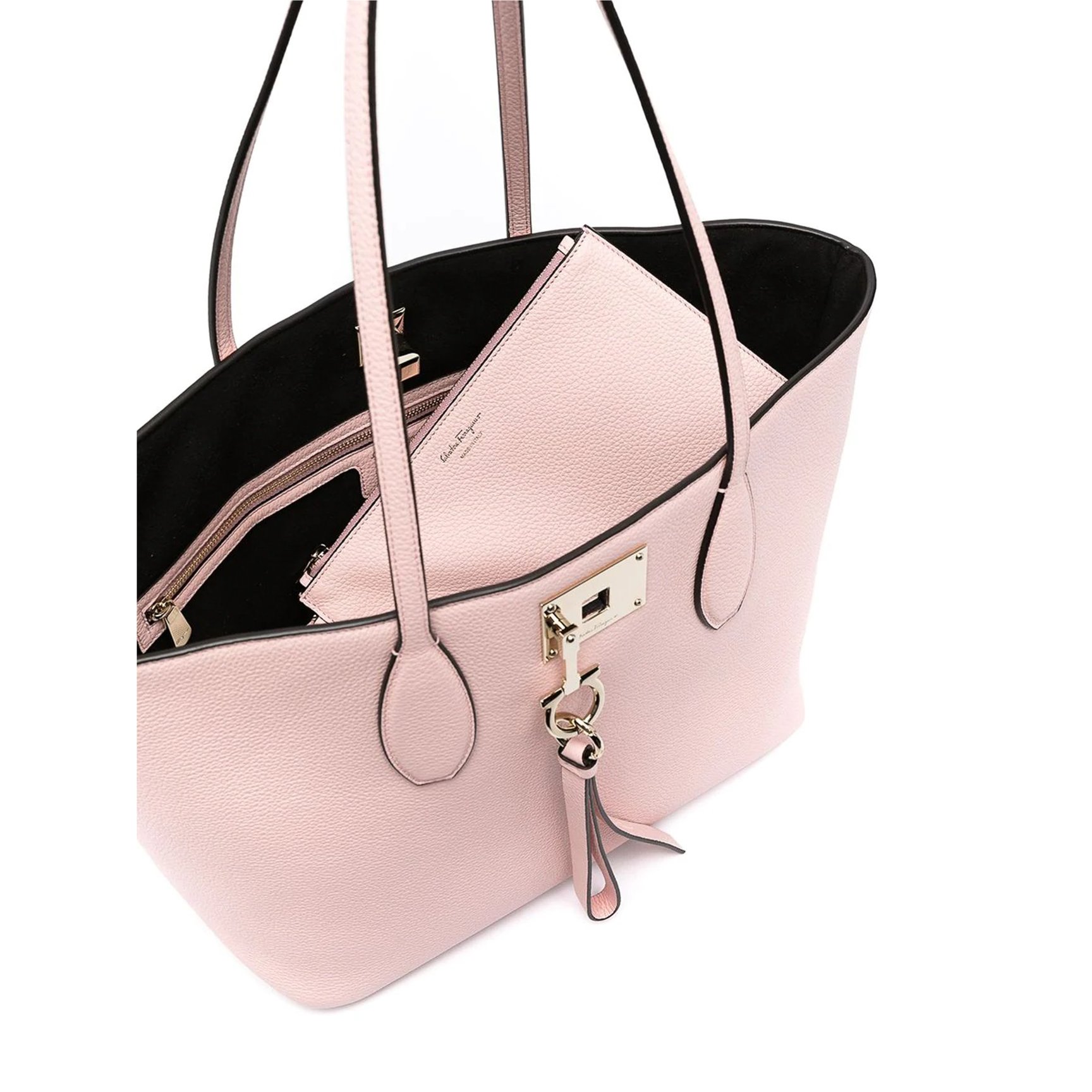 春に似合うレディなピンクに気分が上がる、「サルヴァトーレフェラガモ(Salvatore Ferragamo)」の底鋲つきトートバッグ。ガンチーニバックルで鍵をするようにしっかりとトップを閉めることができる、デザインアクセントも安心感も兼ね備えたアイテムです。ジッパー付きポケットと取り外し可能なポーチもセットになっているので、実用性も抜かりなし。