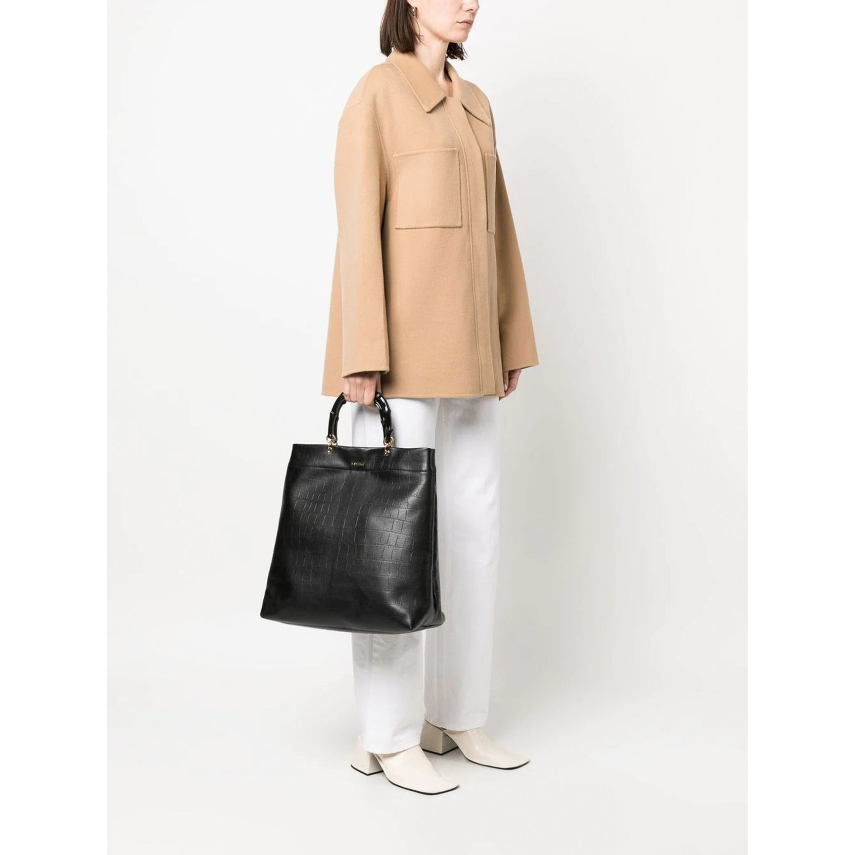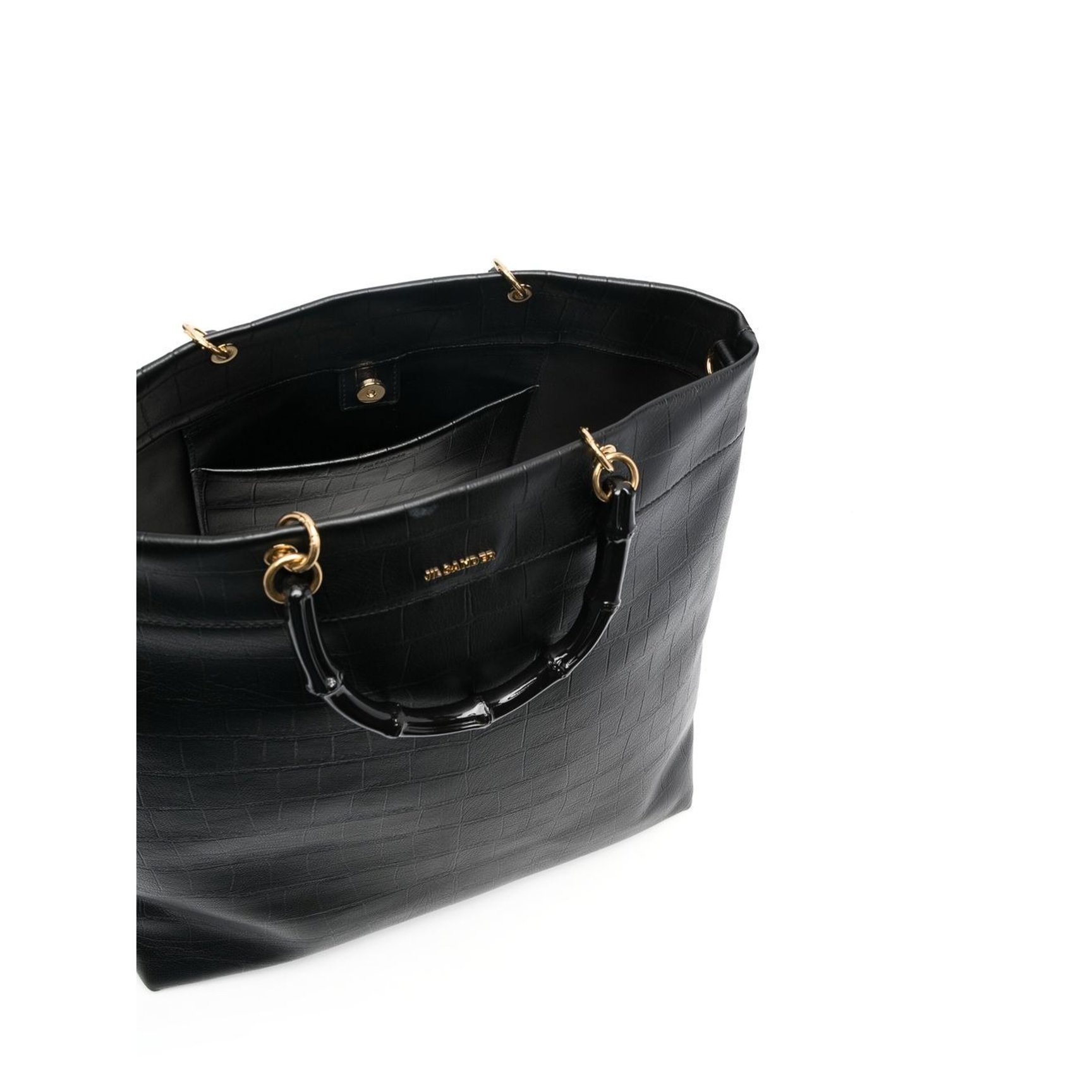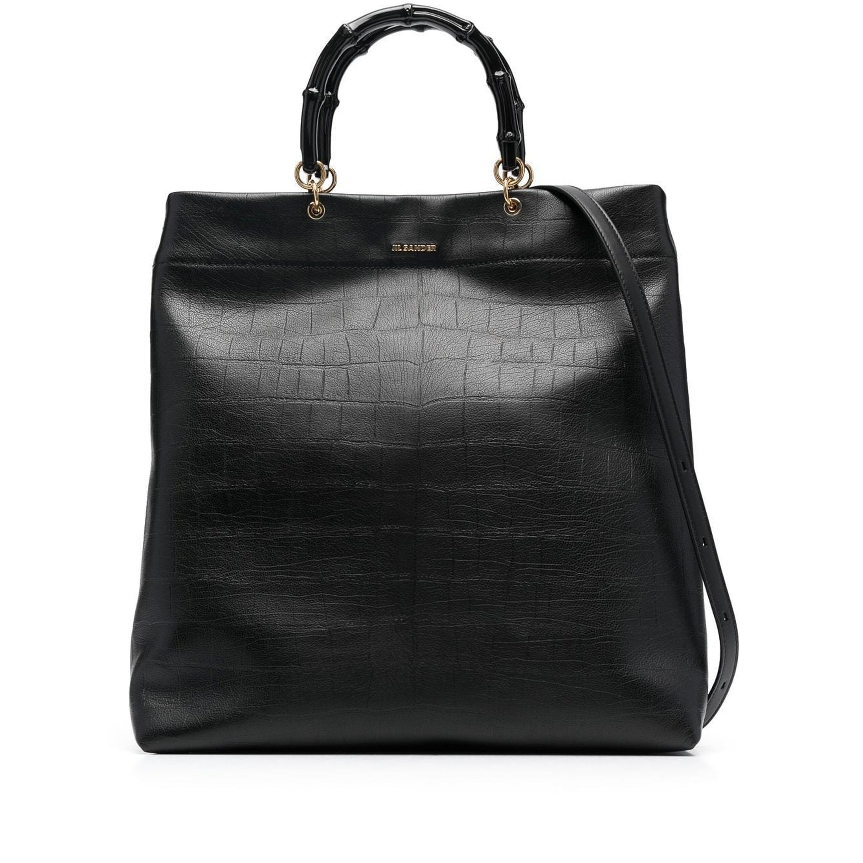 マチュアなルックを完成させる、「ジル サンダー(JIL SANDER)」の縦長ハンドバッグ。滑らかな光沢感を放つクロコの型押しレザーと、さらりと肌に馴染むバンブーハンドルが決め手。A4サイズのファイルやノートPCの持ち運びに加え、マチも17cmと広いのでお弁当やタンブラーもすっきりと収まります。