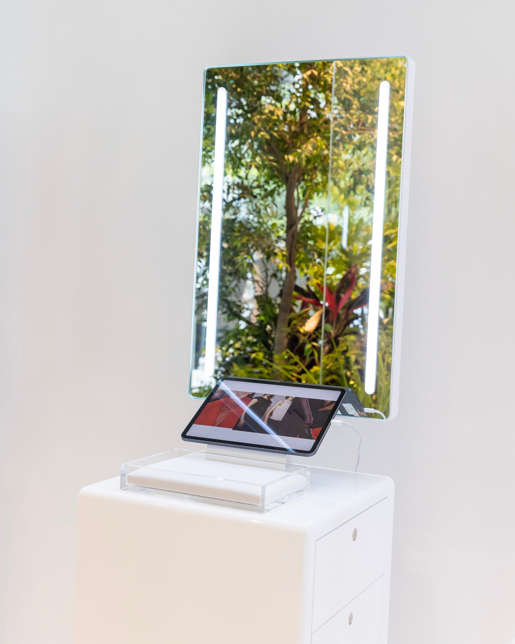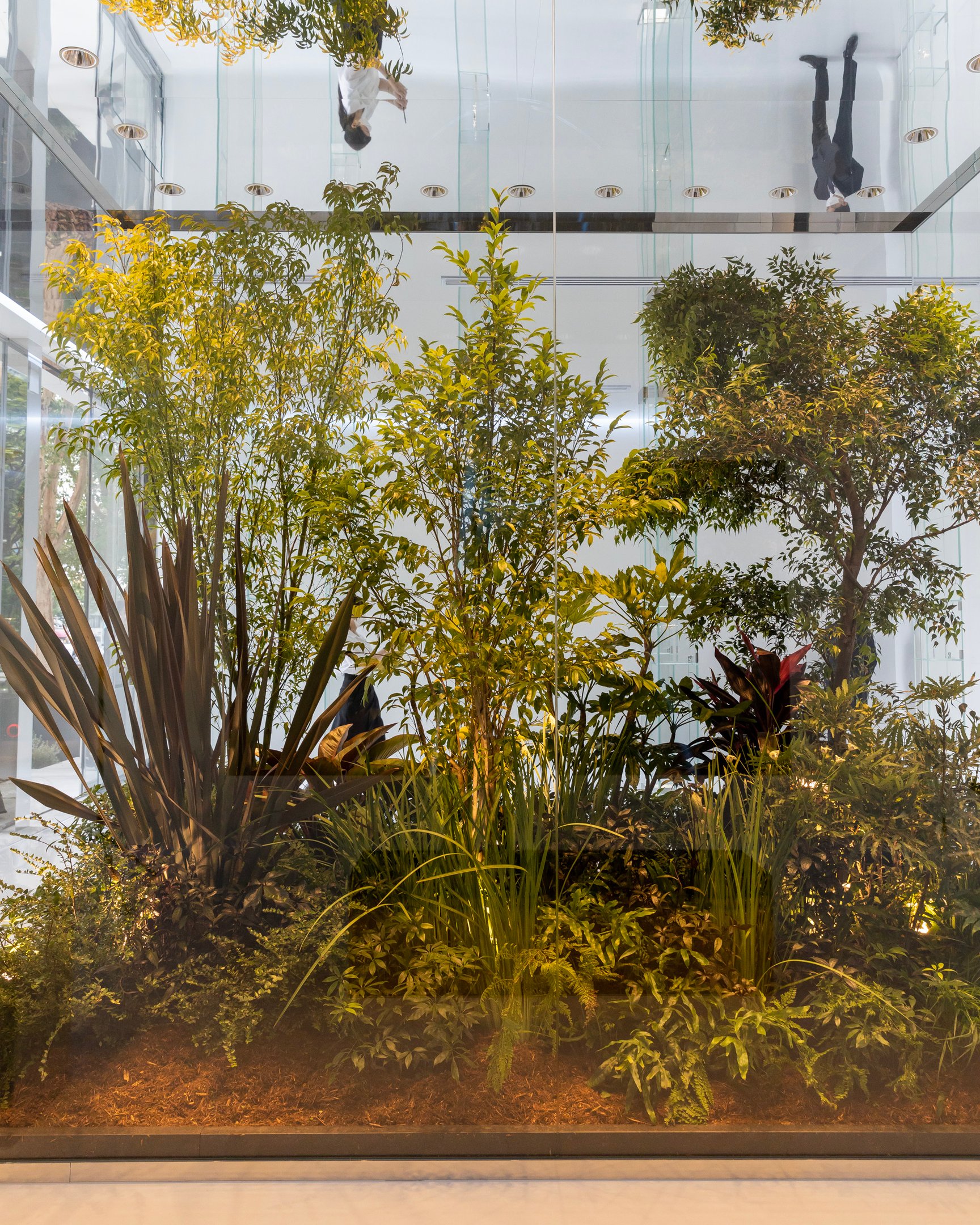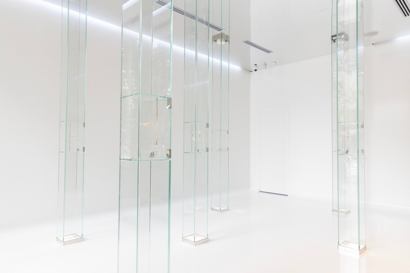 ポップアップストアは建築家 藤本壮介によってデザインされた空間。コレクションのテーマである、"安心と裏切り"、"相反する価値観"を、自然と人工、 内部と外部、都市と森、現実と夢、自分と他者、伝統と未来といった対比で表現している。白が基調の室内の中央の空間にはガラスに囲われた植物が植えられ、透明な柱に6つのコレクションが浮かぶようにディスプレイされている。