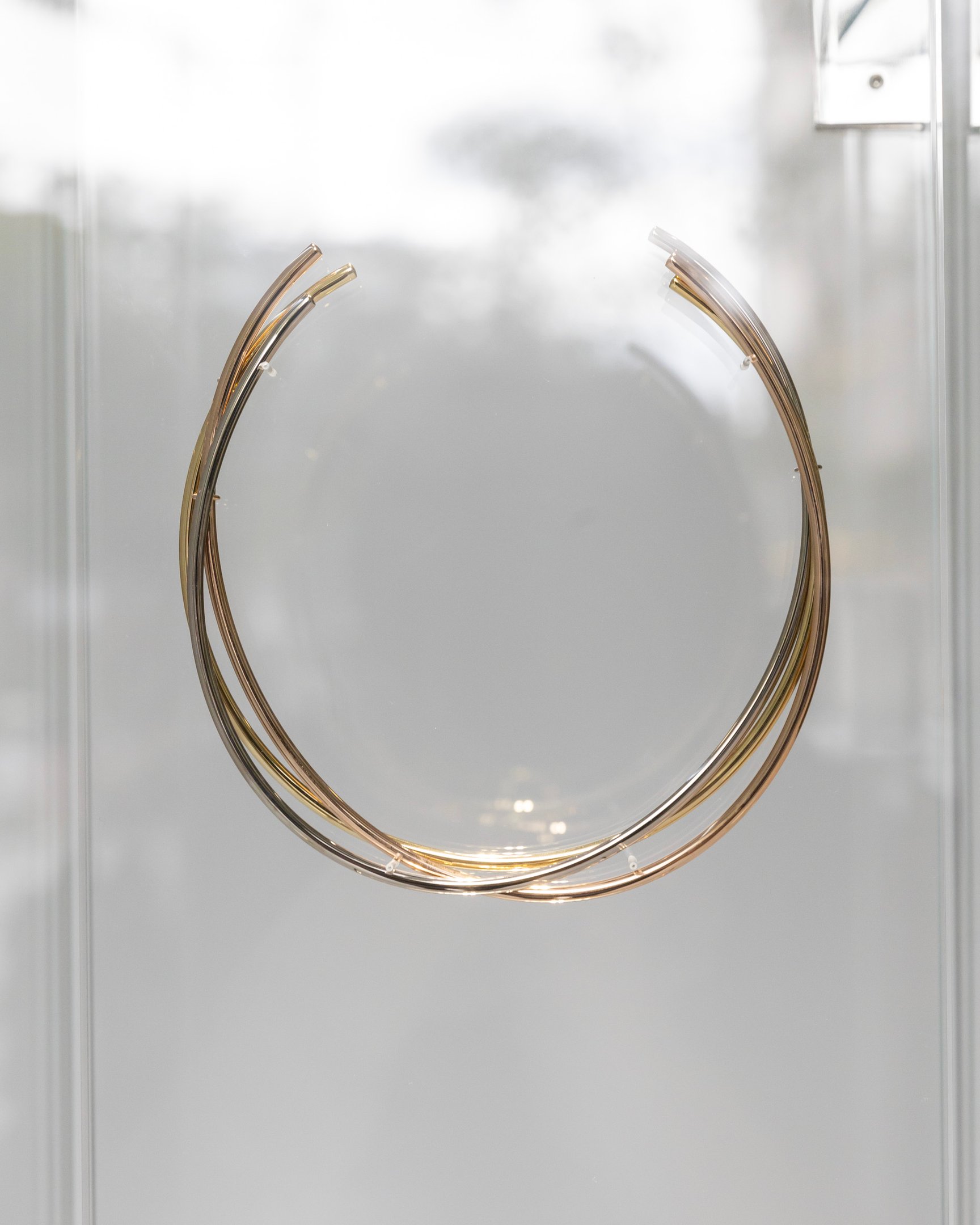コレクションは1924年に誕生したホワイト、イエロー、ピンクの3連のゴールドが絡み合ったカルティエのアイコンジュエリー「トリニティ」をサカイ阿部千登勢とカルティエのクリエイティブスタジオの対話によって再解釈。リング(2型)やネックレス、バングル、シングルイヤリング、シングルイヤリング/リングの全6型を展開する。