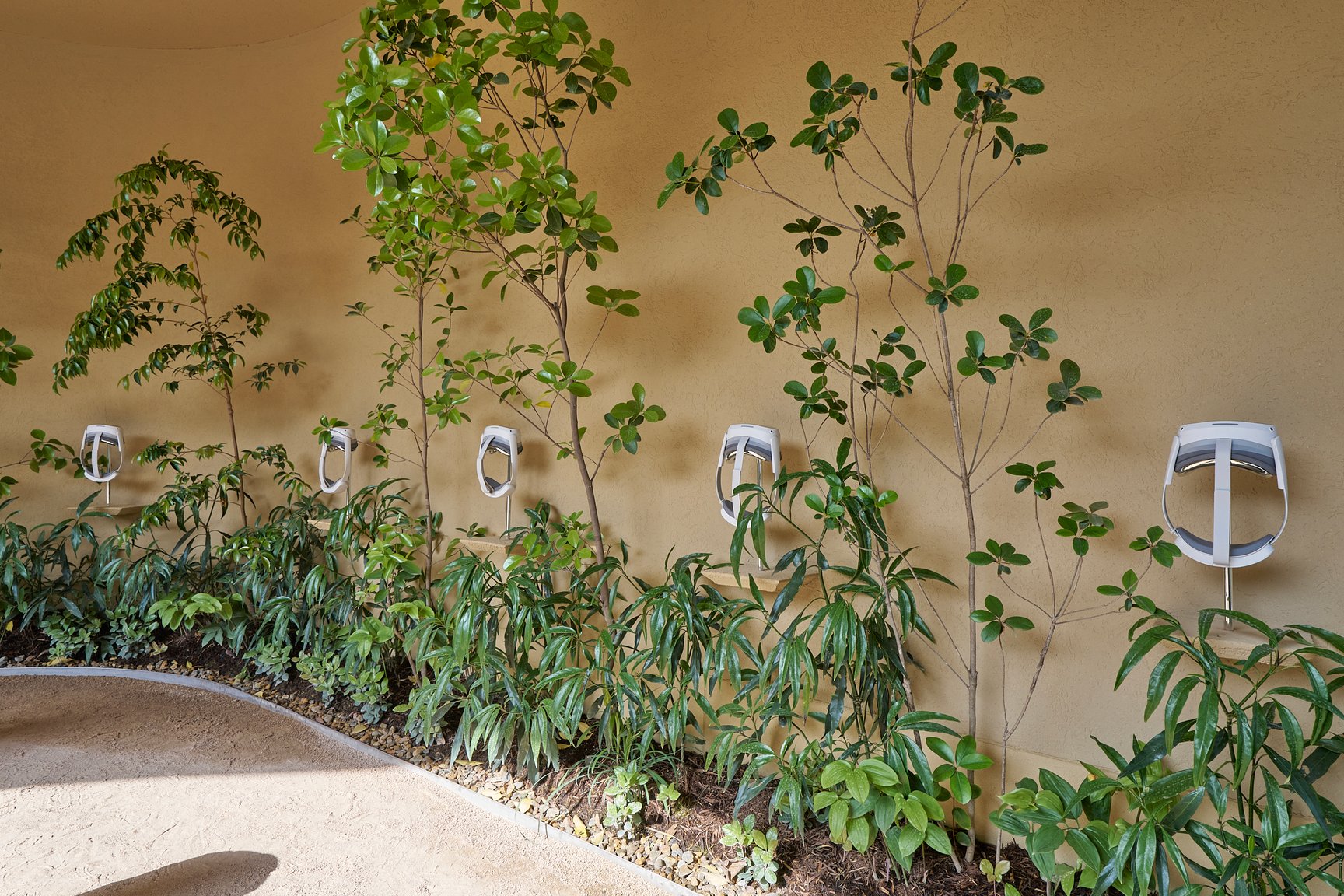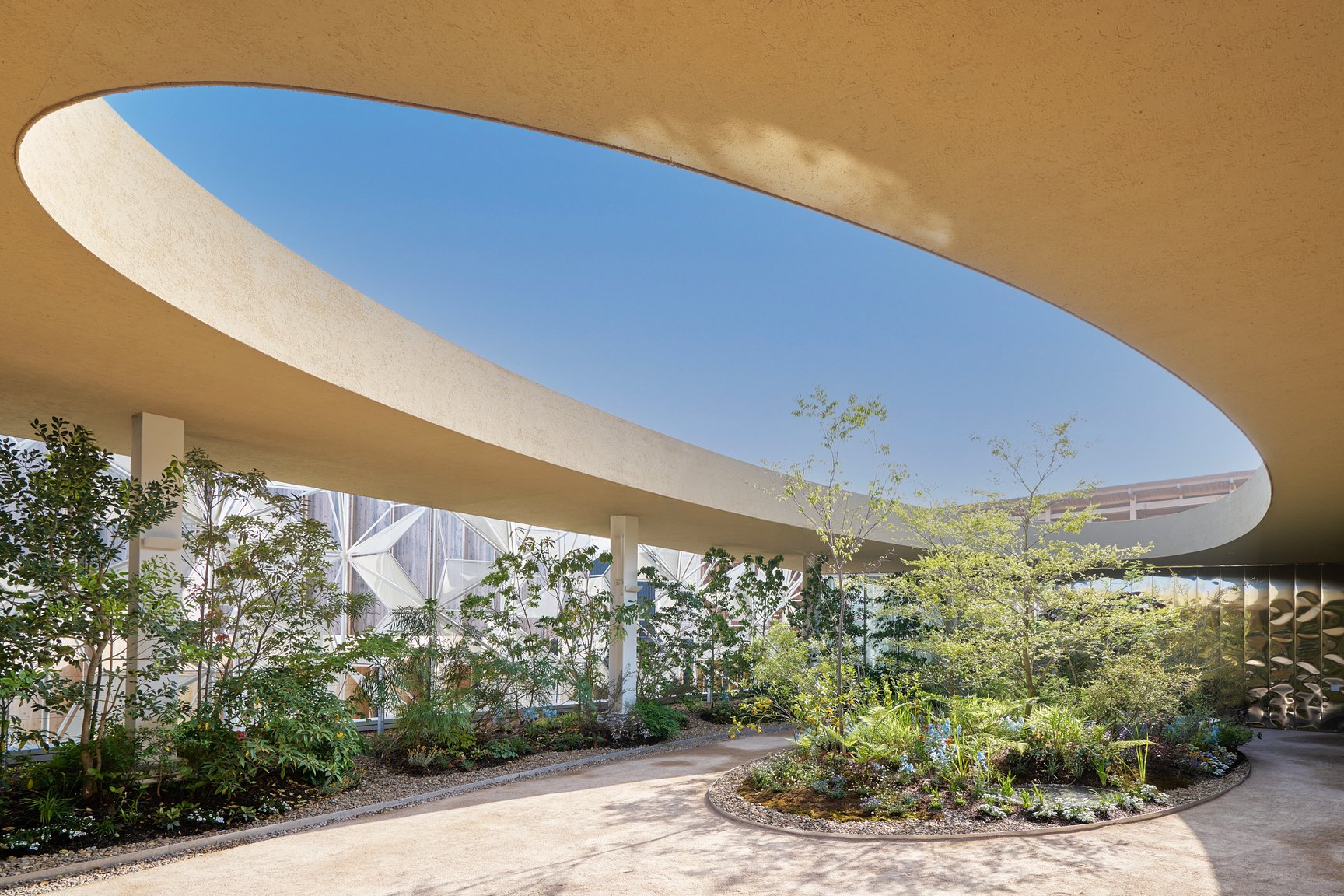 2階へと続く階段を登ると、吹き抜けの庭園「UPPER GARDEN」が開放的に広がります。景観デザイナーの萩野寿也が手掛けた館内の植栽は、地域の植物を中心に構成され、木々は万博終了後には地元の山に還されるそう。