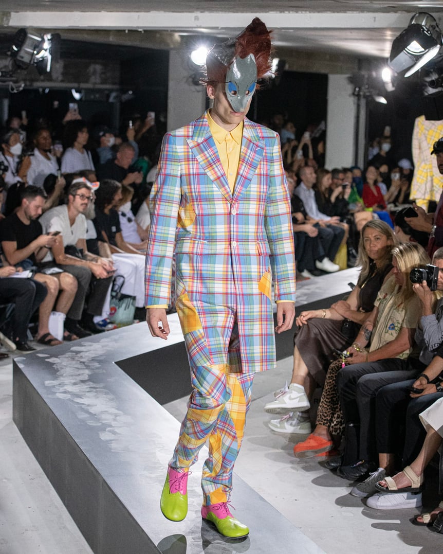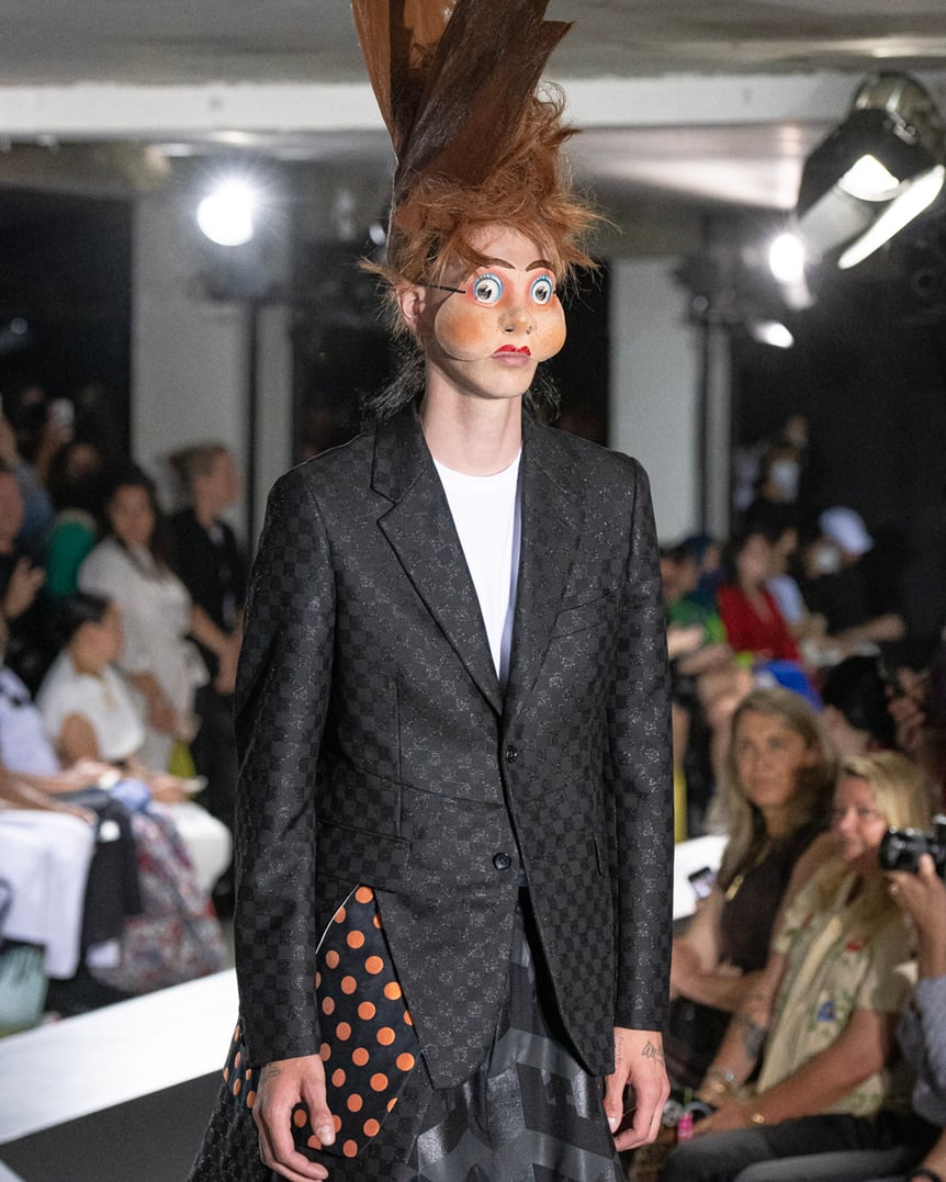 スカートのように裾が広がったテーラードジャケットや、膨らんだパンツ。そしてマルチカラーのダイヤチェックやドット、ストライプ柄が目に留まると、道化師の装いを想像させた。何人かのモデルは、すれ違う時に細いランウェイを降りたり登ったり。その度に裾がフープのごとく弾む。コミカルなようでいて、どこかダークな不気味さが漂っている。
