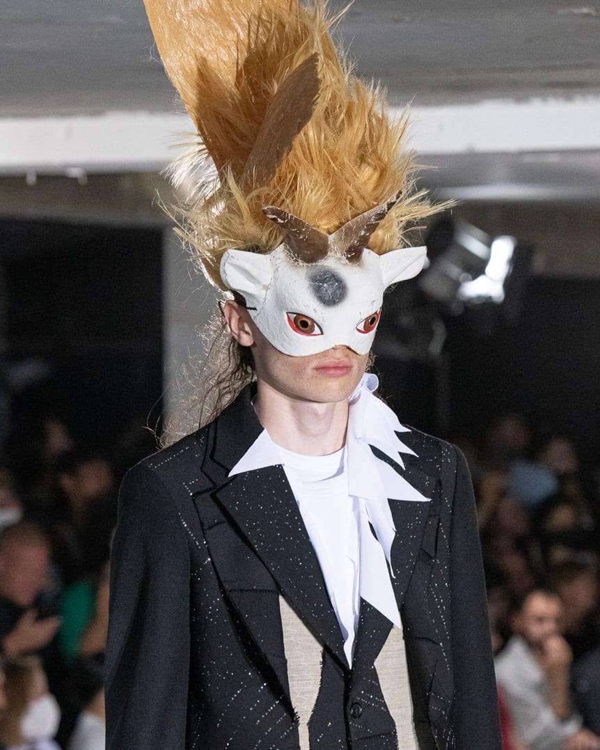 ファーストルックから異様な雰囲気を感じたのは、映画「サイコ」のテーマ曲と、モデルの顔の一部を覆うマスクのせいだろう。目を見開いていたり、笑っていたり、狐やうさぎといった動物など、100年以上前のアンティークマスクも含まれているという。