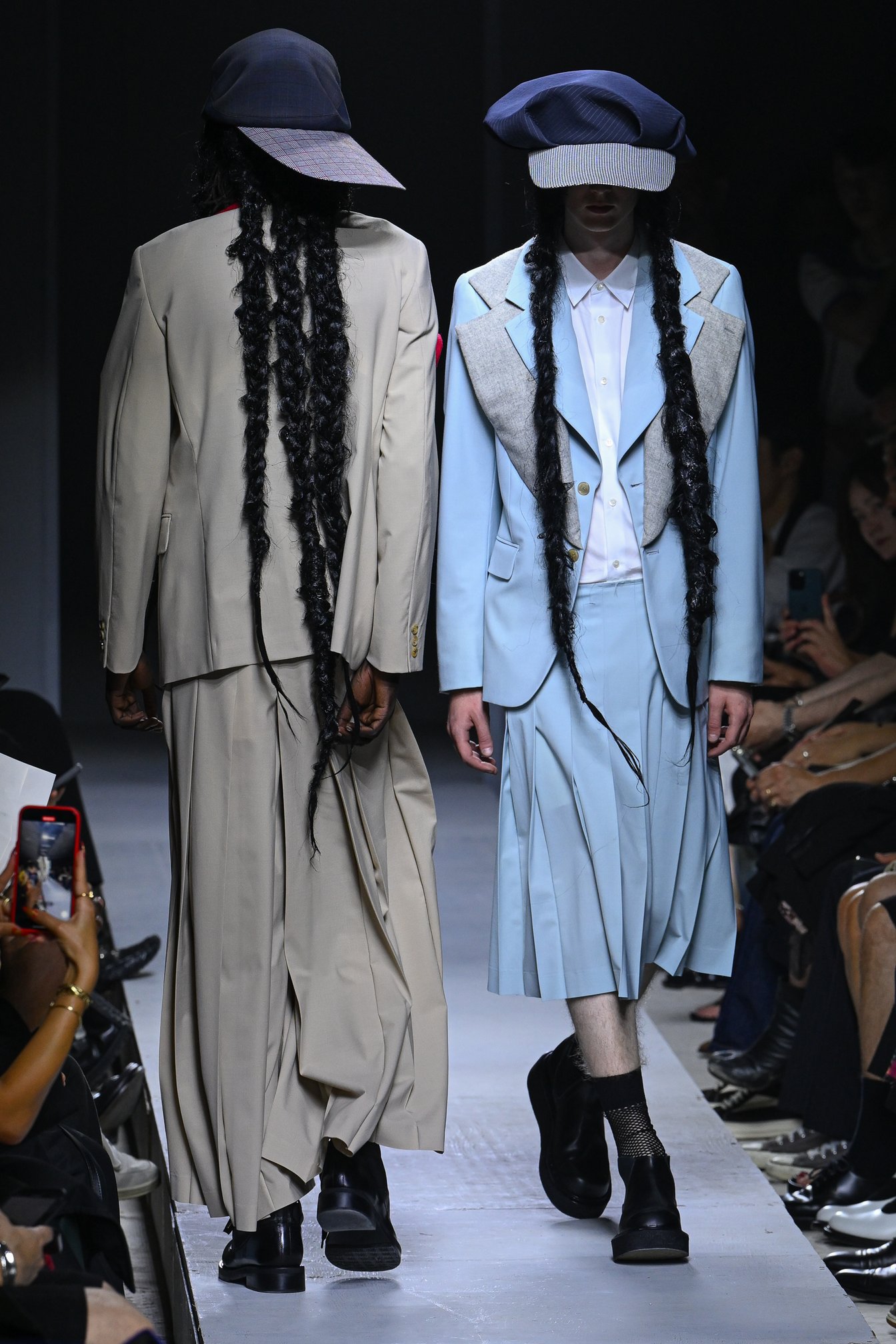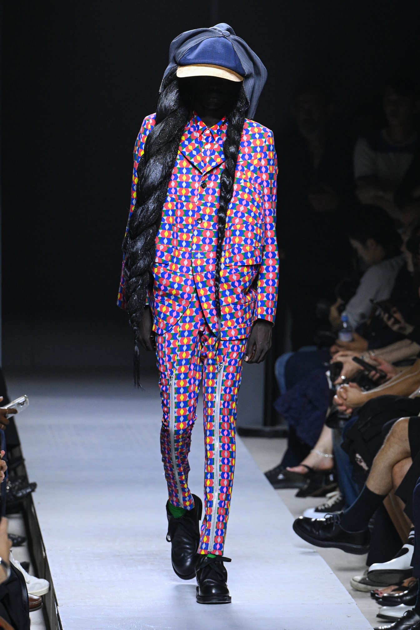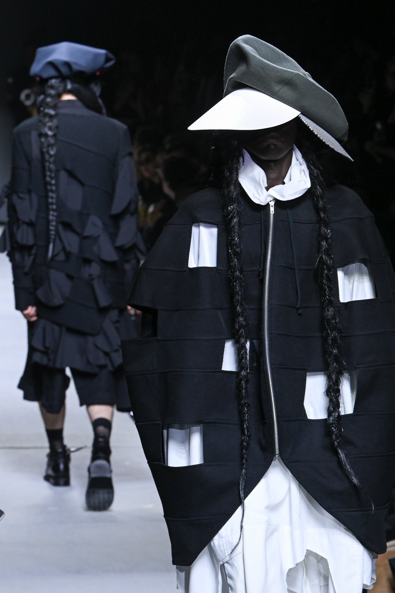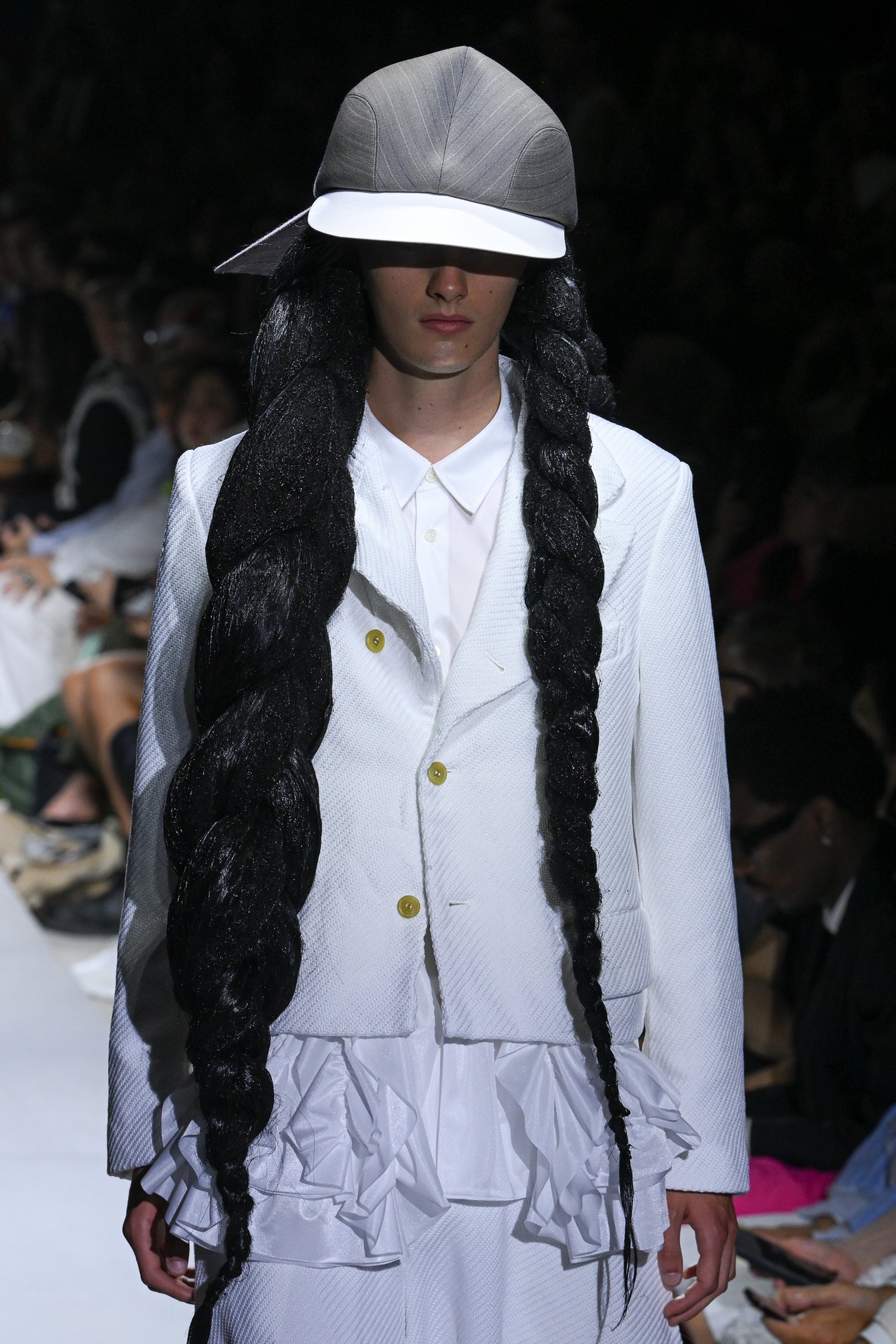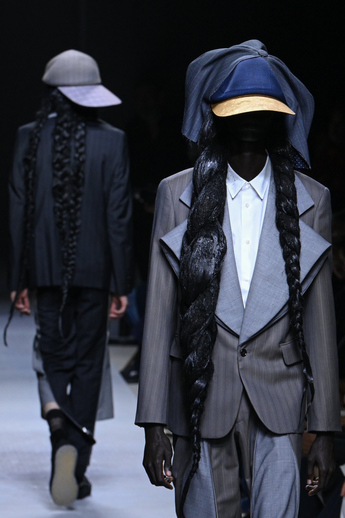 ショーはトゥヴァ共和国出身のサインホ・ナムチラク(Sainkho Namtchyla)によるホーミー(喉歌)が響き、祈りの儀式のようだった。モデルの顔を隠すように覆う巨大な帽子と、非対称に編み込まれた極太の三つ編みヘア。スーツというメタファーに、川久保玲が求める真の強き存在が顕現した。