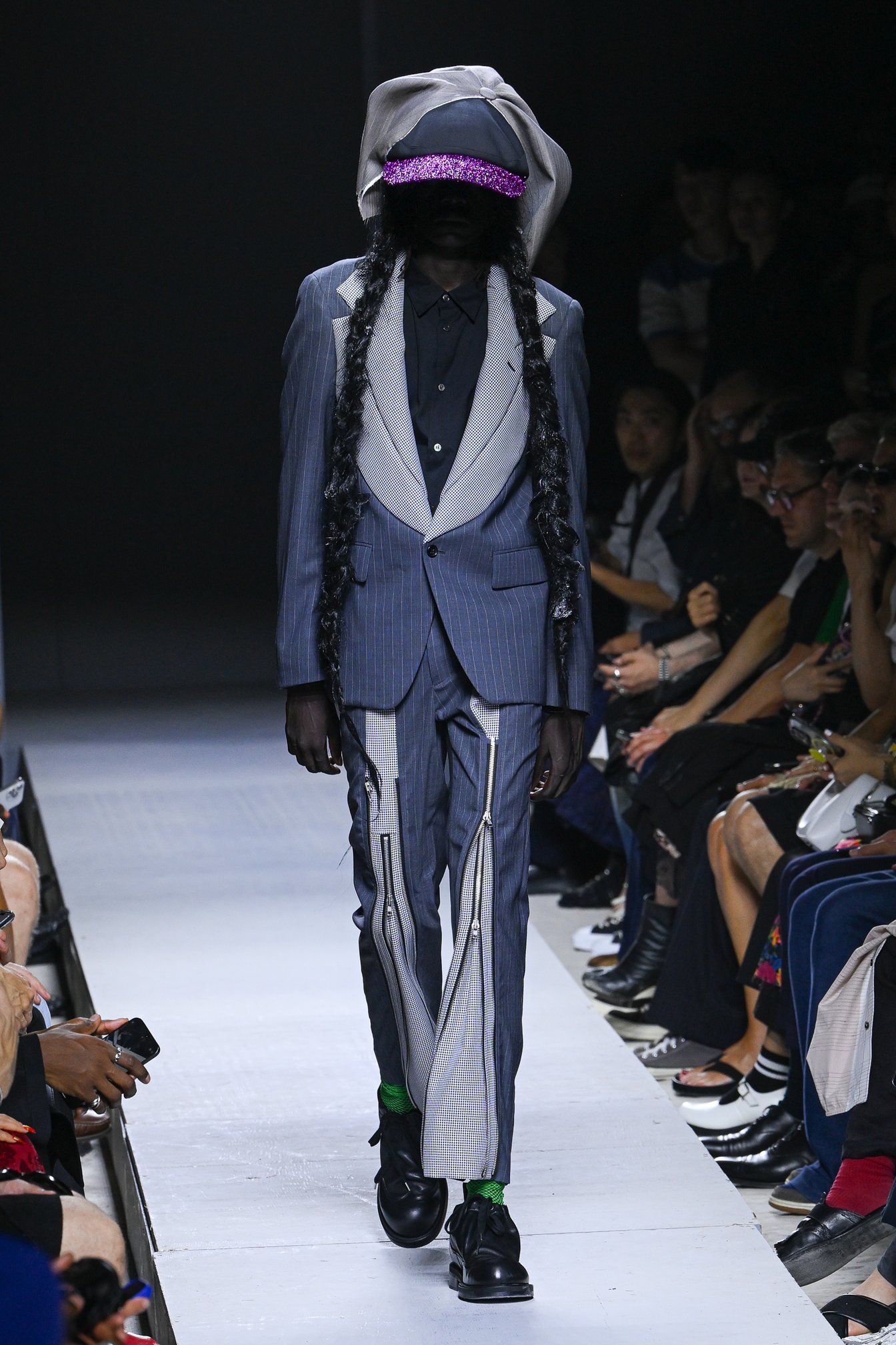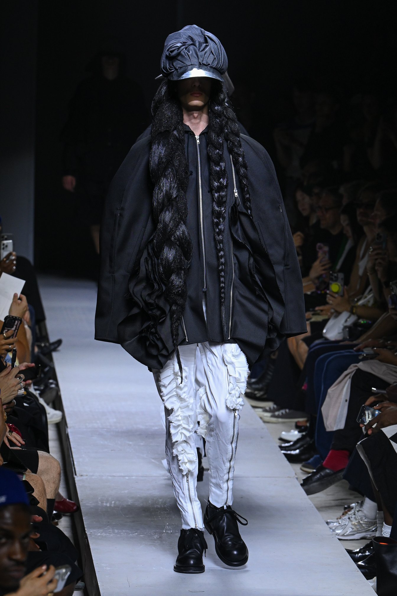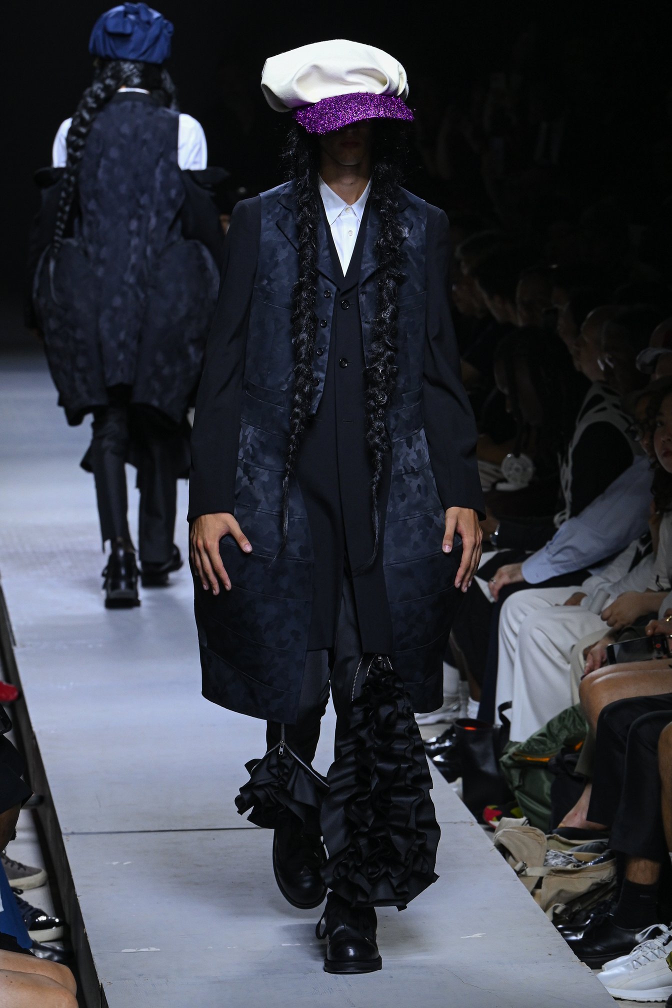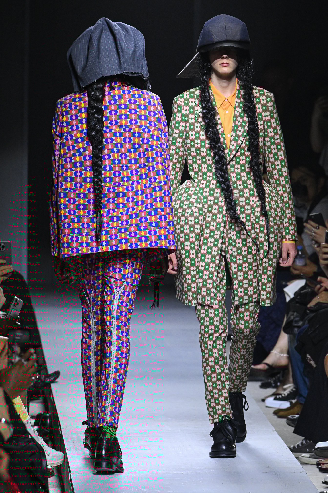 ショーはトゥヴァ共和国出身のサインホ・ナムチラク(Sainkho Namtchyla)によるホーミー(喉歌)が響き、祈りの儀式のようだった。モデルの顔を隠すように覆う巨大な帽子と、非対称に編み込まれた極太の三つ編みヘア。スーツというメタファーに、川久保玲が求める真の強き存在が顕現した。