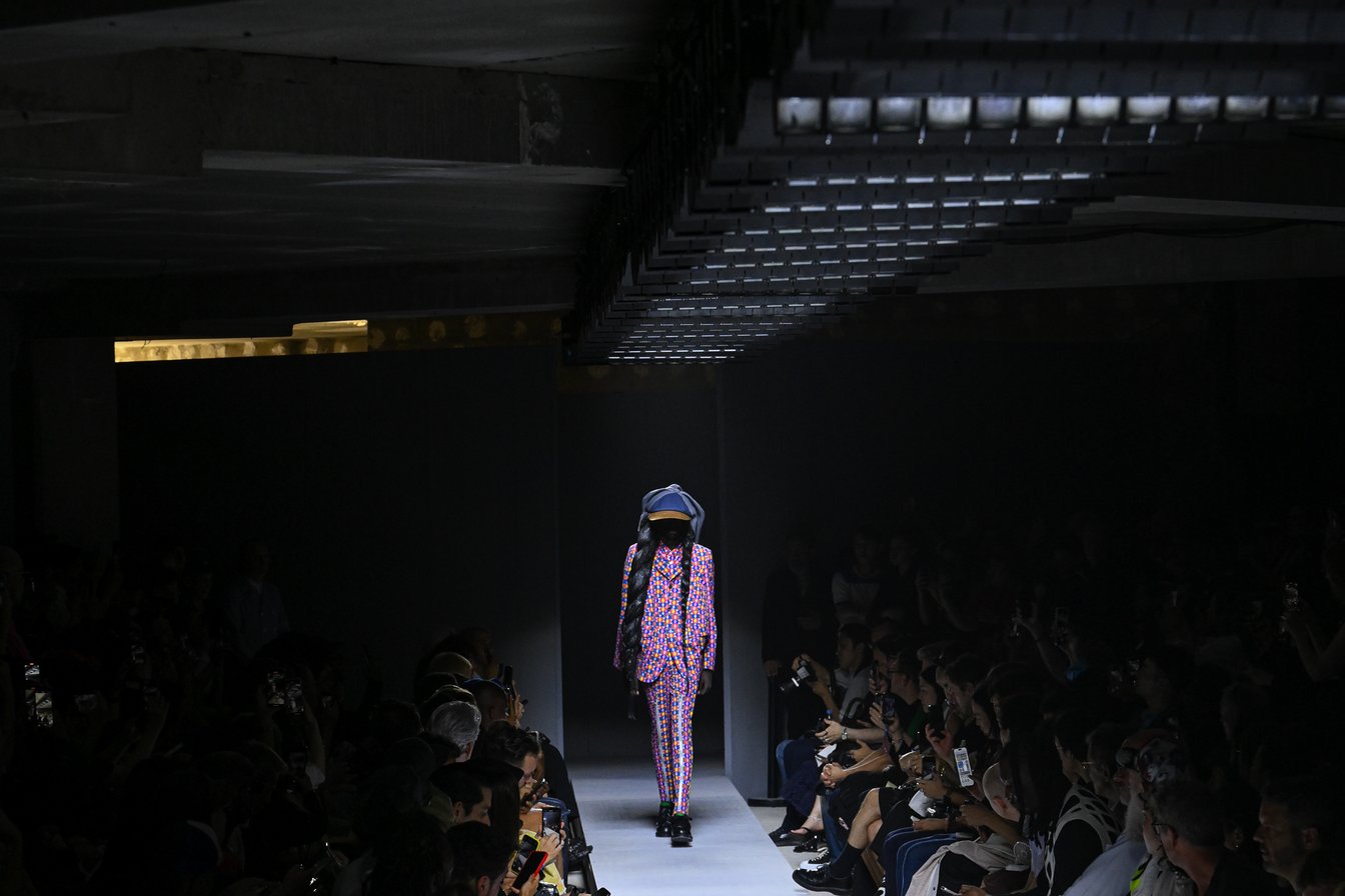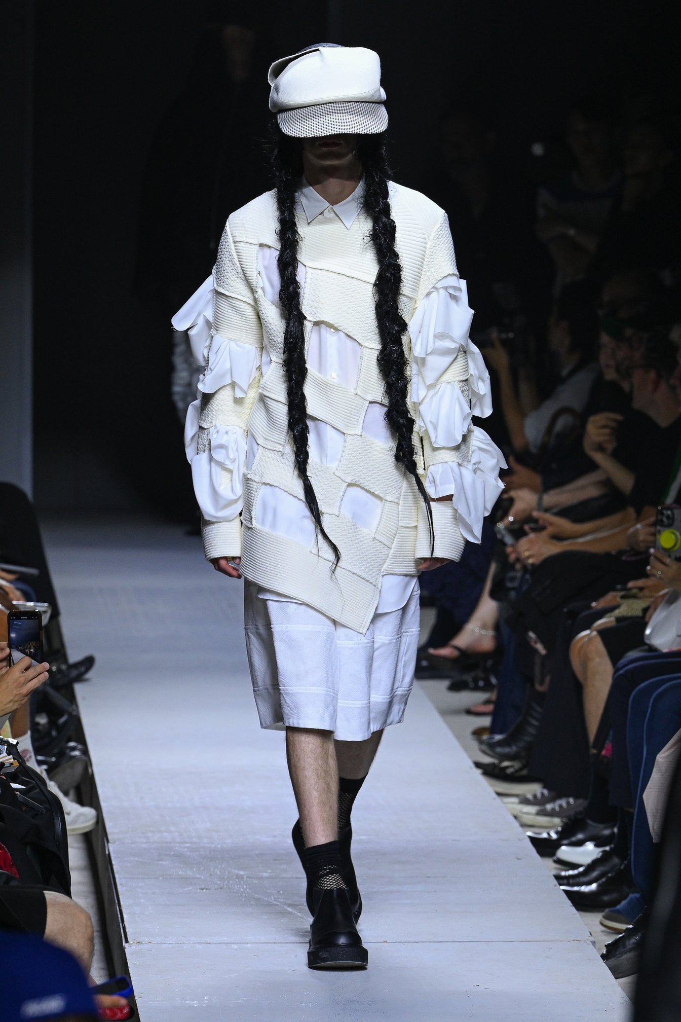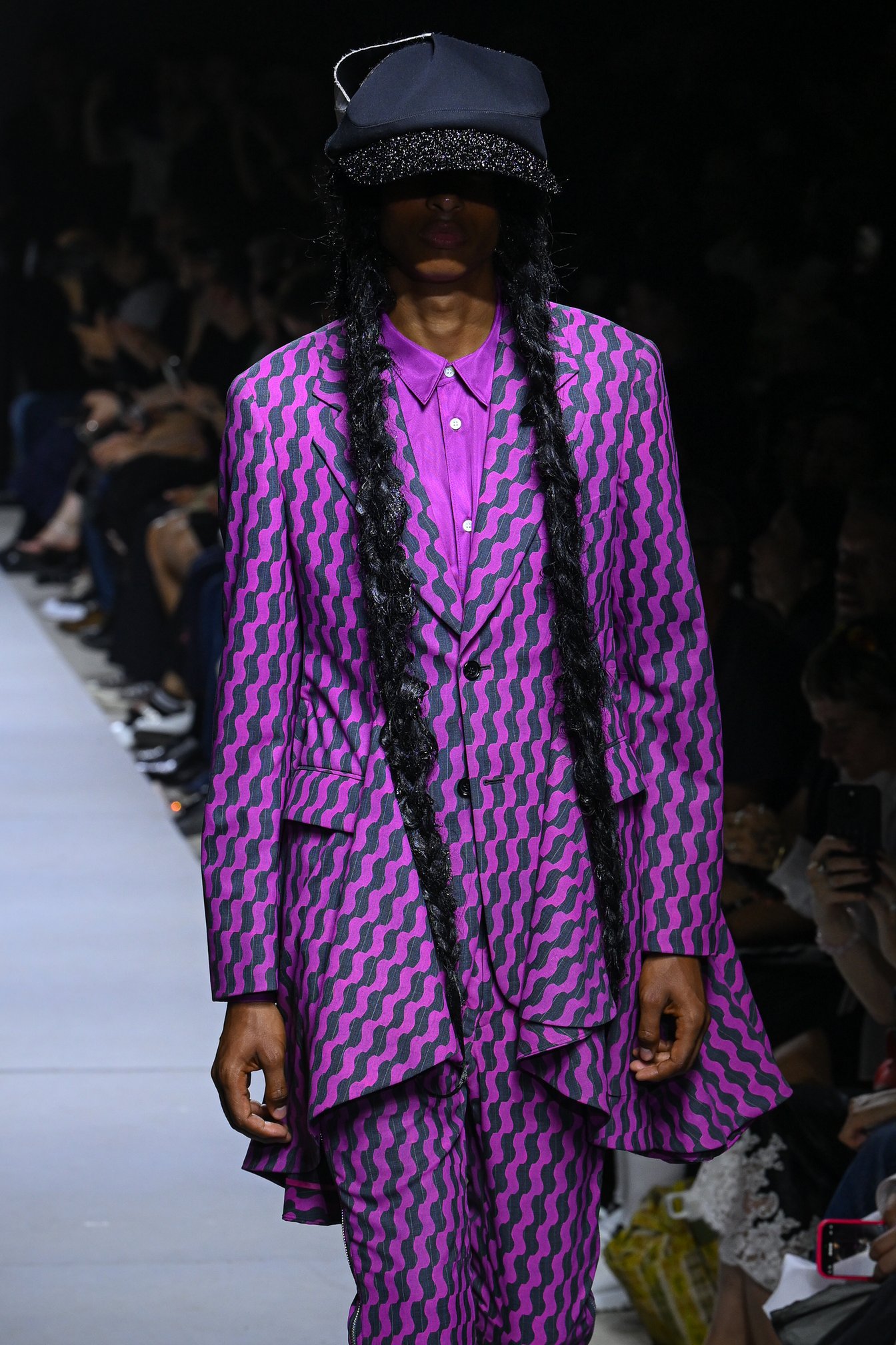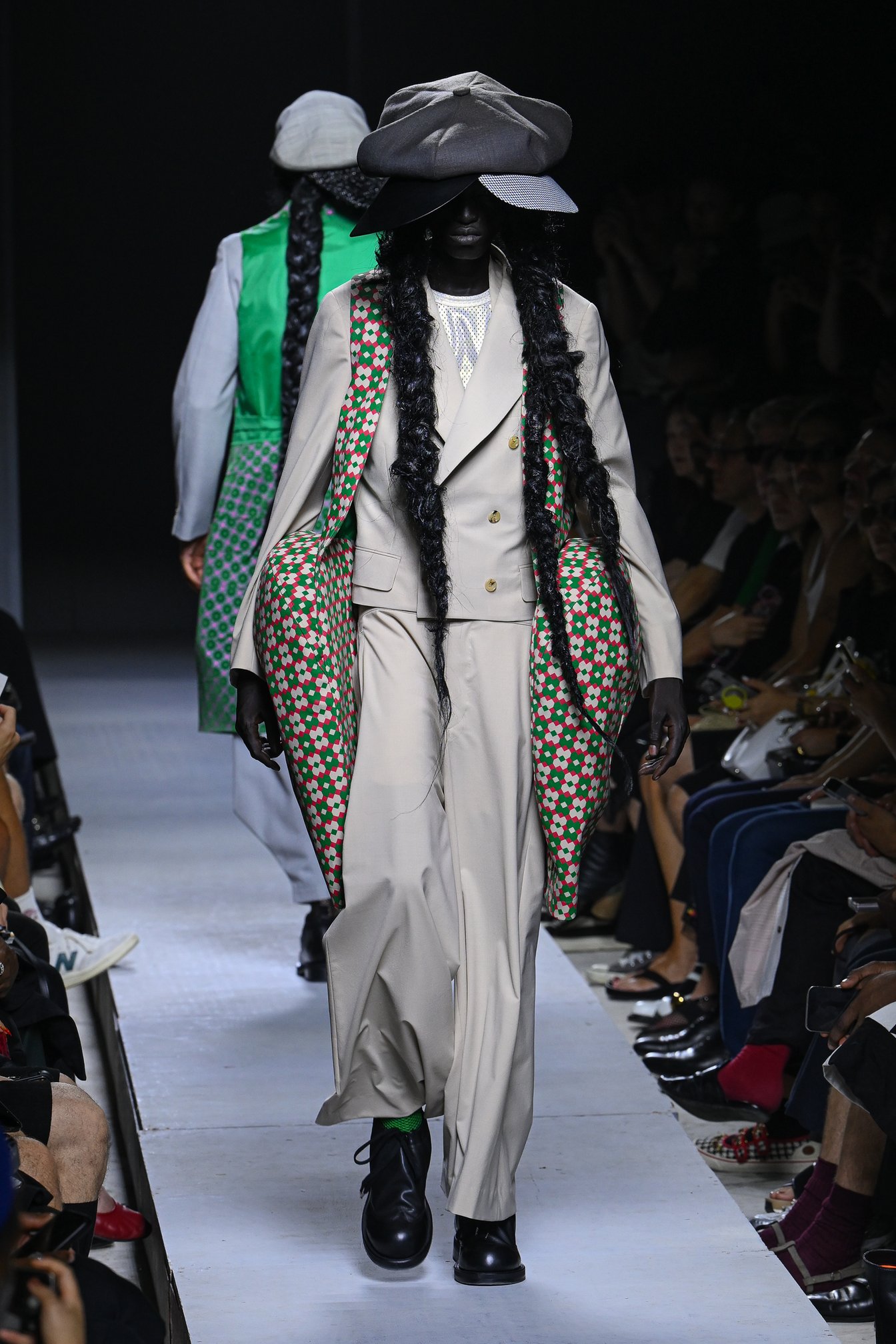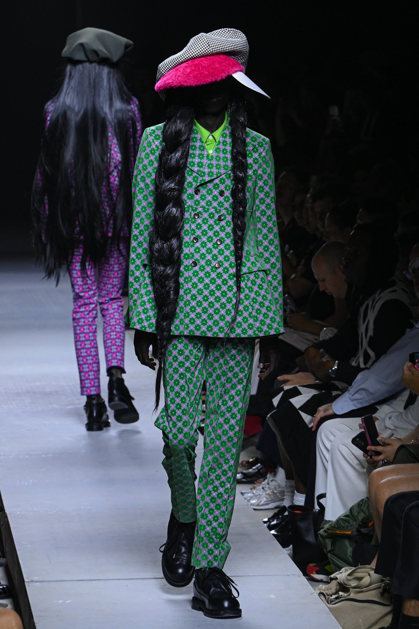 ショーはトゥヴァ共和国出身のサインホ・ナムチラク(Sainkho Namtchyla)によるホーミー(喉歌)が響き、祈りの儀式のようだった。モデルの顔を隠すように覆う巨大な帽子と、非対称に編み込まれた極太の三つ編みヘア。スーツというメタファーに、川久保玲が求める真の強き存在が顕現した。