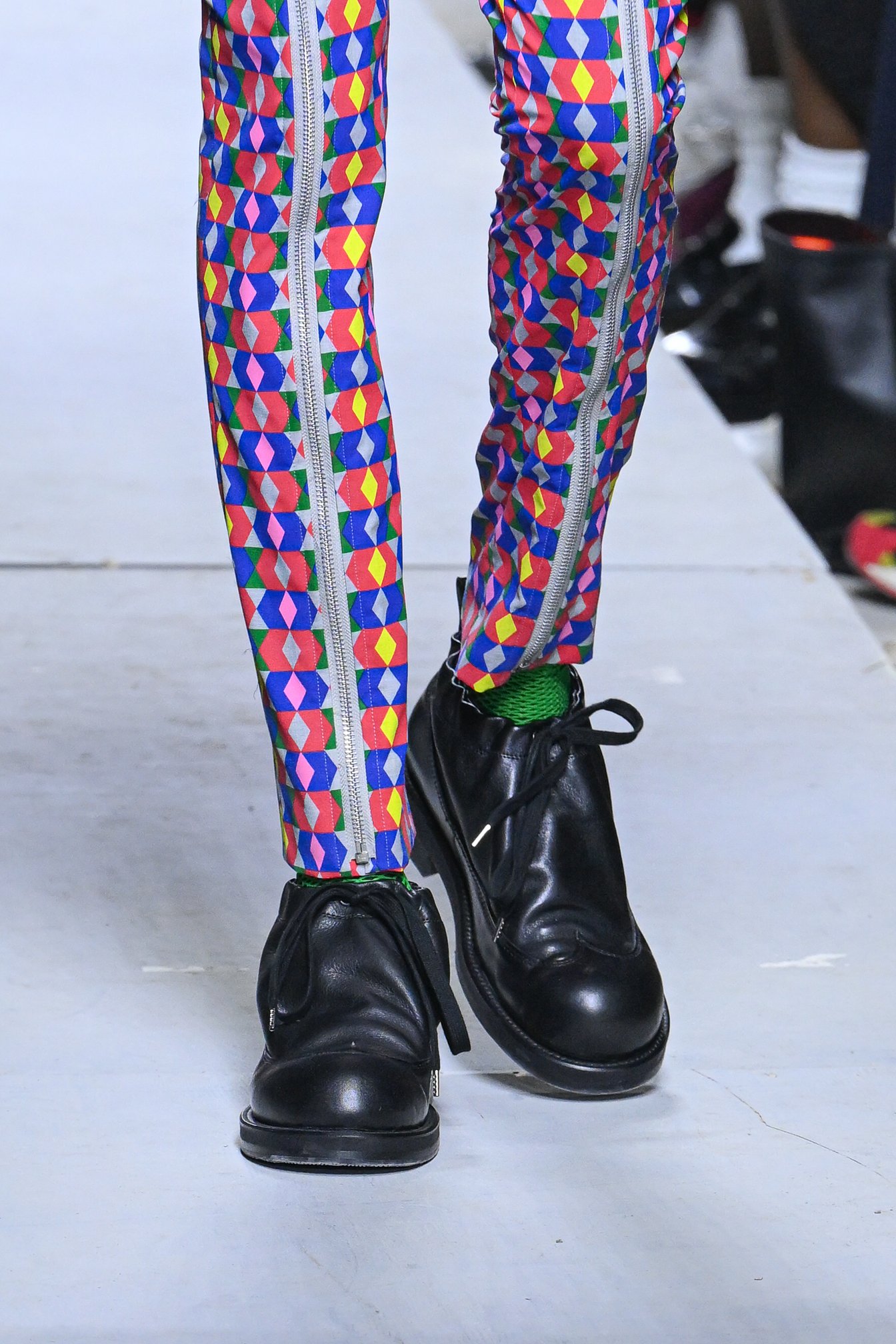 ファーストルックは前回の「TO HELL WITH WAR」コレクションと同様の重厚なムードを漂わせつつも、主役は軍服からスーツへ。シルエットはタイトになり、オリーブグリーンから鮮やかなオプティカルプリントにガラリと変化した。ジャケットは複数の細長いパーツを繋ぎ合わせた立体的な仕立てで、パンツは足首から膝上まで締め上げるようにジッパーが走っている。