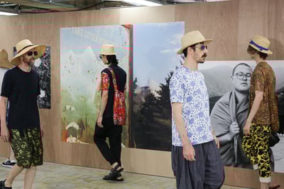 「ミュールバウアー(Mühlbauer)」とのコラボレーションによるストローハットと変形パターンのサルエルパンツを組み合わせたスタイリングが象徴的な今シーズン。ブータンの民族衣装「キラ」や「ゴ」の柄を連想させるテキスタイルを得意の切り替えで差し込み、ワークウェアがベースにはあるものの、サンダルやハット、サルエルパンツのスタイリングによってなんとも形容し難いコレクションを作り上げた。