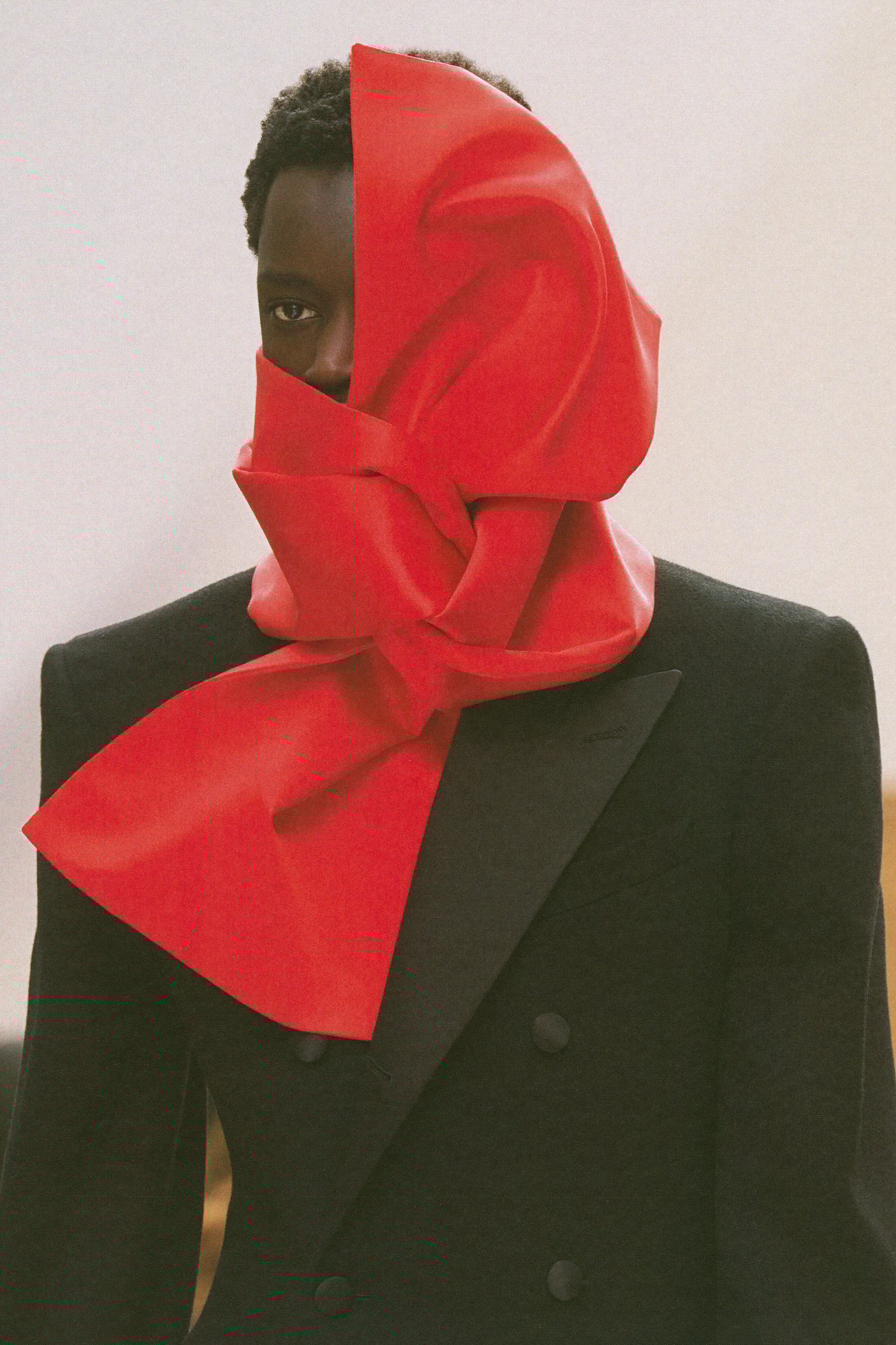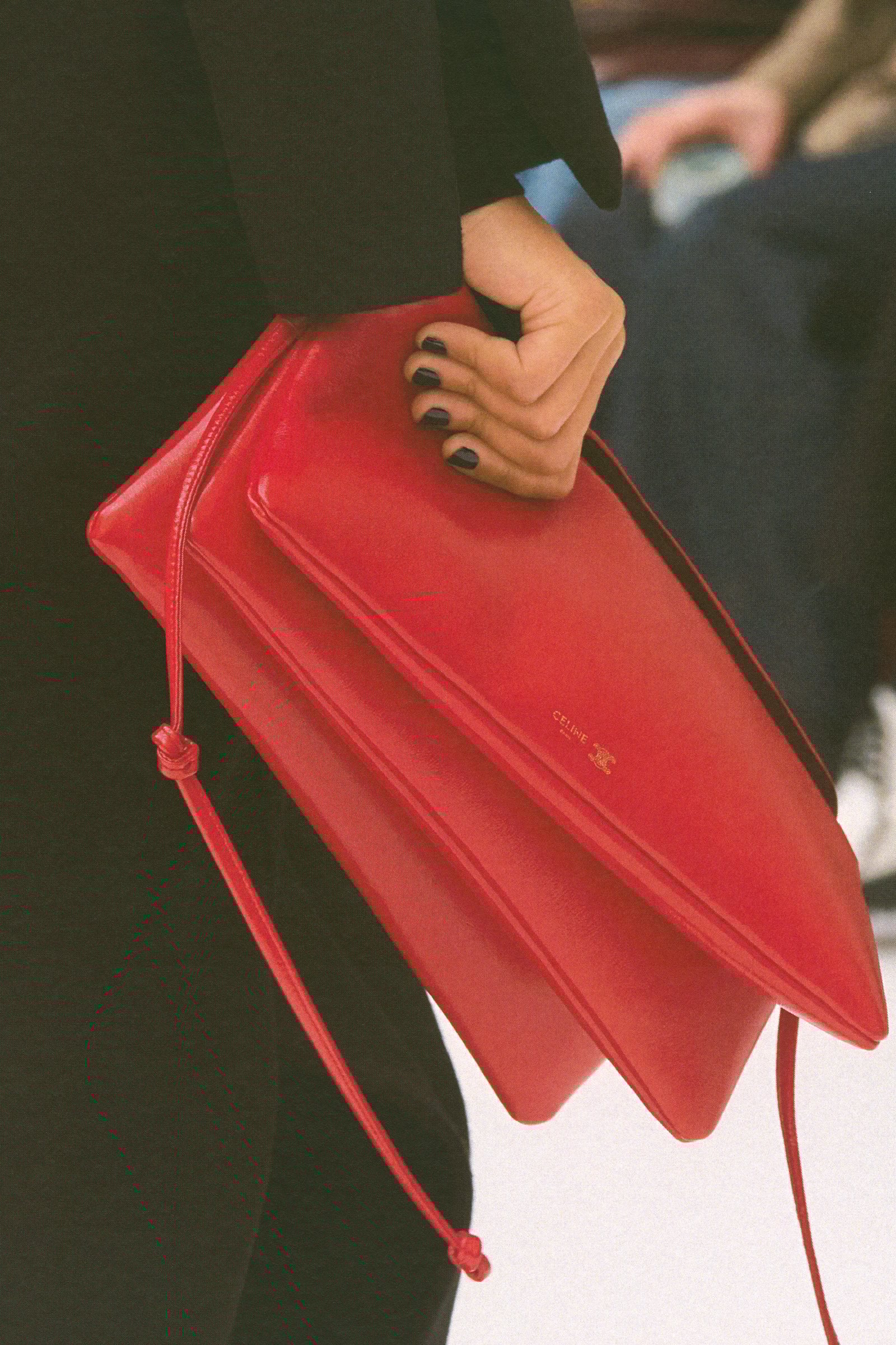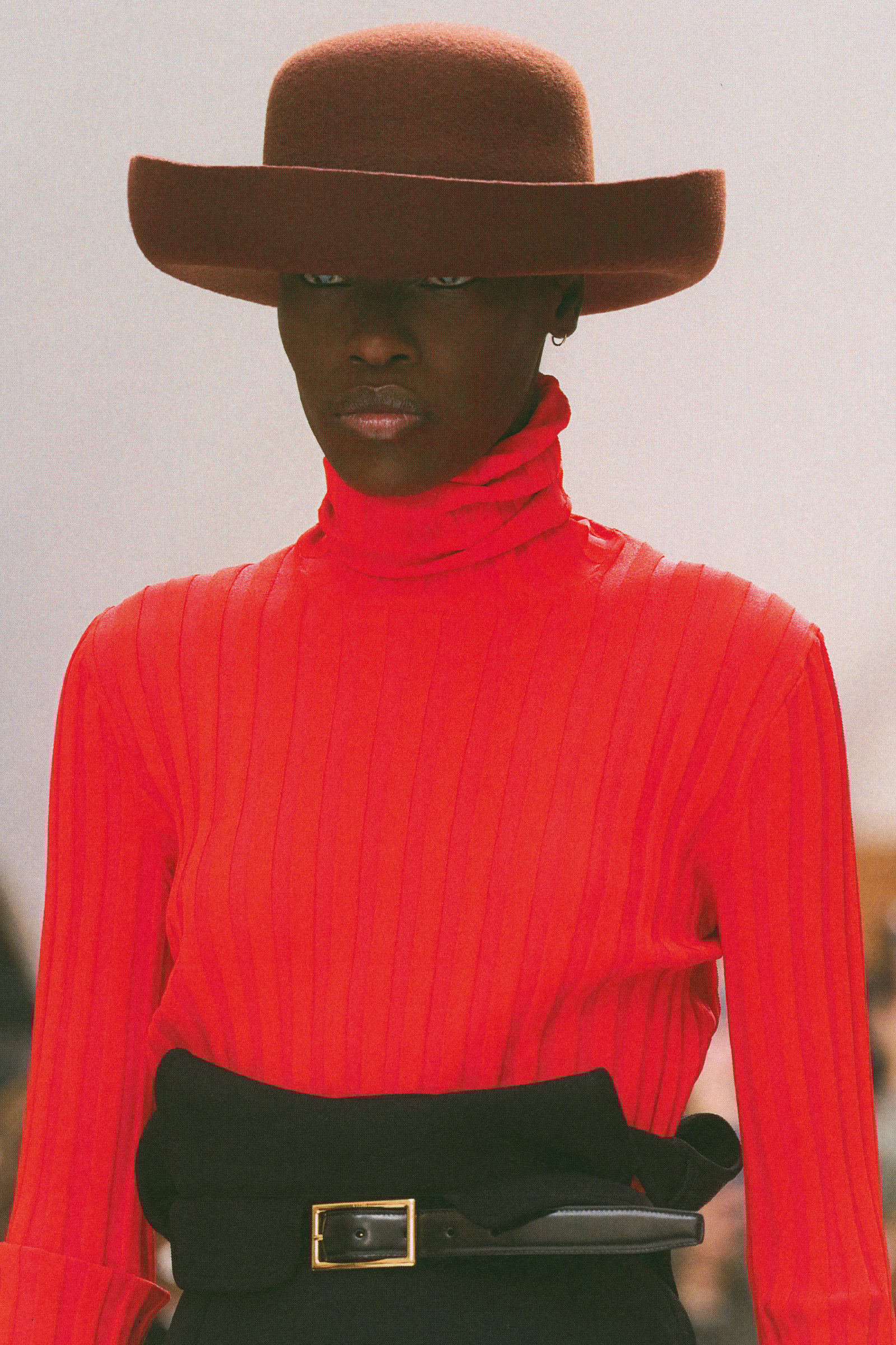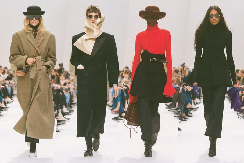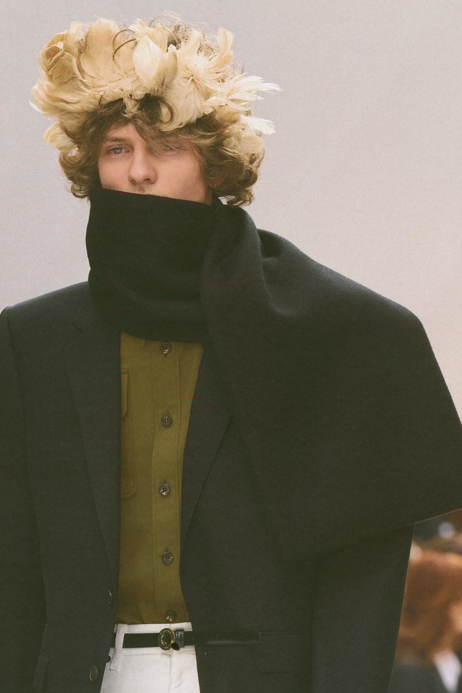 ハットやフェザーのヘッドピース、首元から顔まわりを覆う立体的なスカーフ、大ぶりのネックレスが、かっちりしたテーラリングに少しのずれや遊び心を注入。バッグに加えてストールやジャケットを抱えるスタイリングも、服をただ美しく見せるためではなく、着る人の所作や空気といった着こなしを提案しようとする姿勢につながっていた。バッグでは、細長のレクタングルサイズのトリオバッグが初登場したほか、ソフトトリオンフも加わり、スマートでモダンなムードと実用性の両面が加えられた。