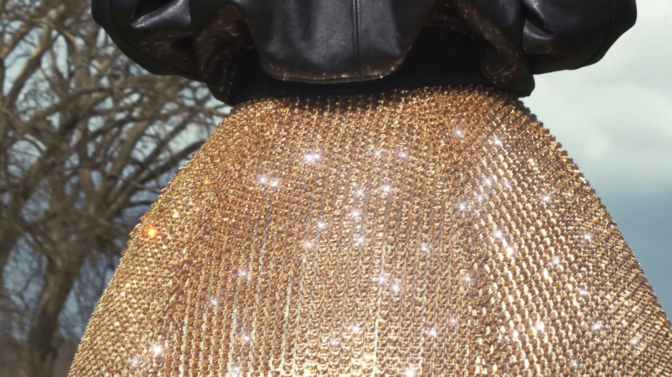 ランボーら象徴主義が隆盛を極めた1850年代後半に誕生したクチュールアイテムとして、ラスト数ルックを飾ったキラびやかなクリノリンスカートが、まるで読後感のごとく重くのしかかる。ほか、ラメ入りパンツやスパンコール使いのボトムスが散見し、ショーの大半をデニムが占めた前夏を上位互換した。原著の「イリュミナシオン」は日本語での「イルミネーション」だが、これは個人的なこじつけなので失念して結構。