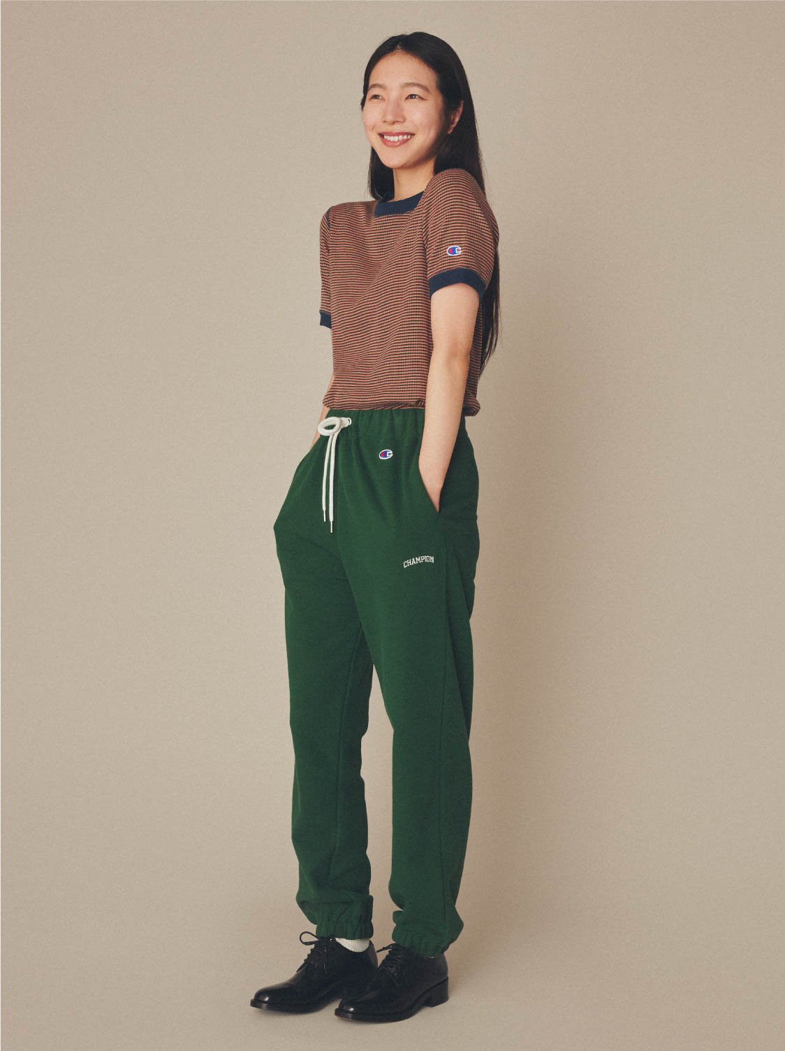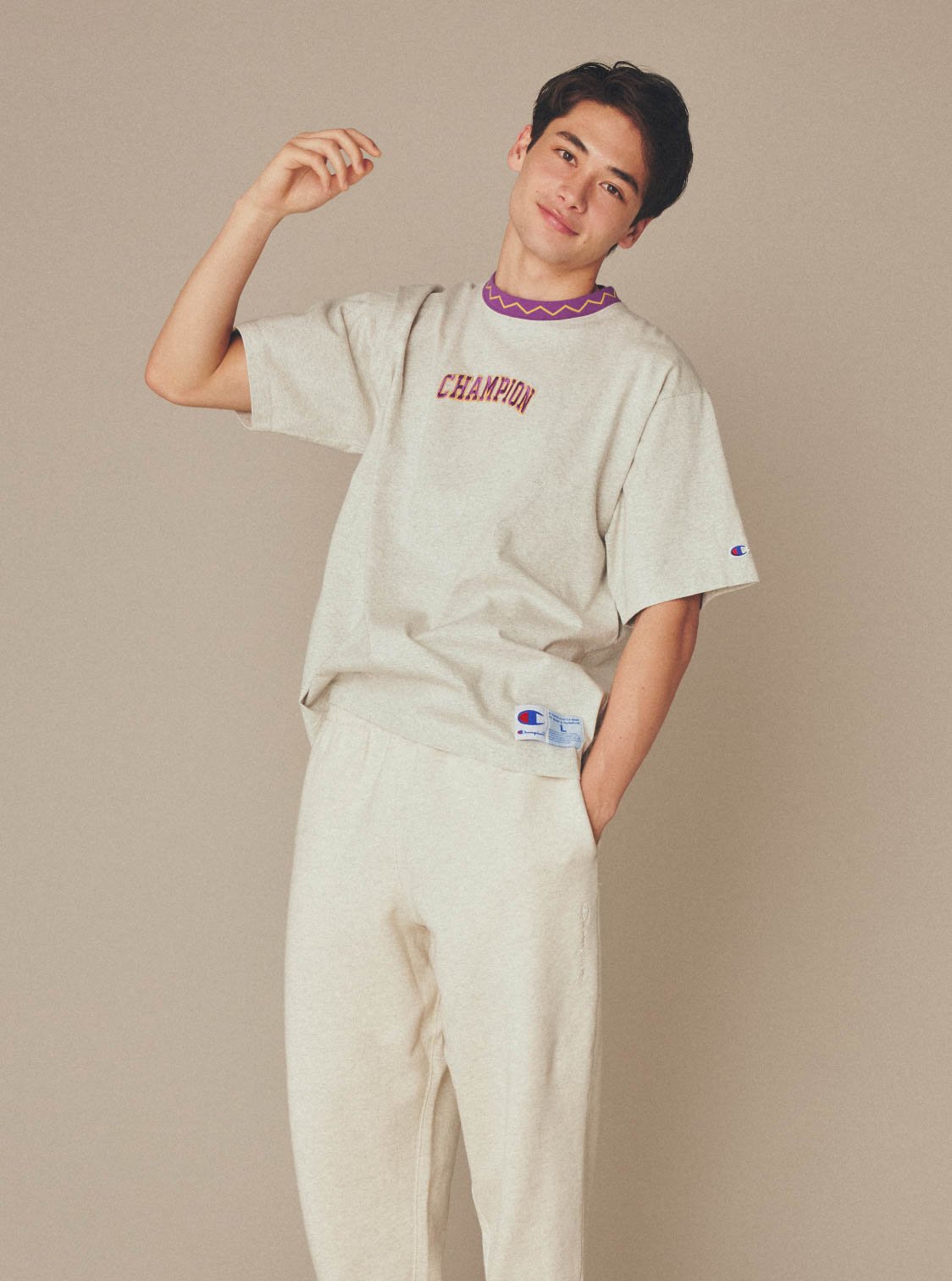 「365日Championのスウェットのセットアップを着て運動をしています」と話すショーンさんが着るのは、1990年代のアメリカメジャースポーツのゲームシャツのデザインを元にしたジャカードネックリブが特徴的な1枚。オーバーサイズのTシャツに同系色のスウェットパンツを合わせたワントーンコーデで、襟元とロゴのアクセントカラーを際立たせる。