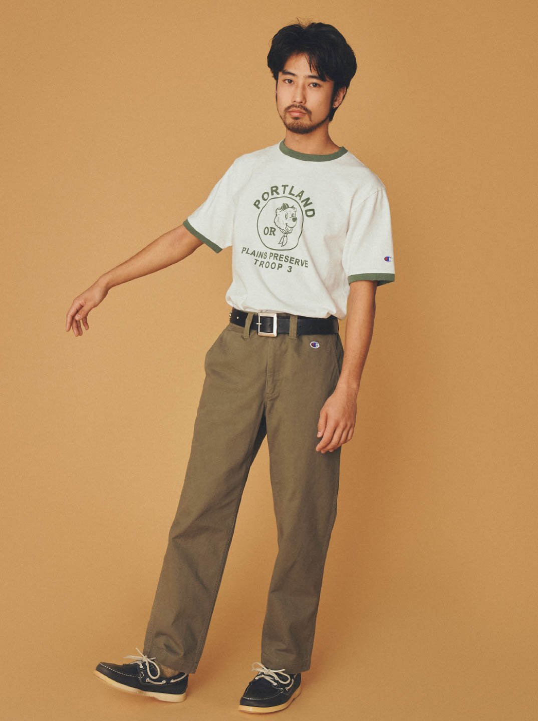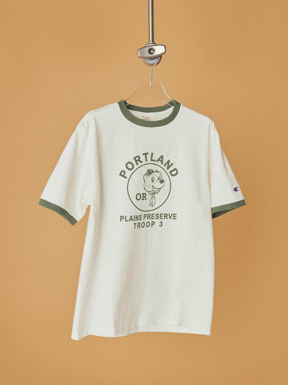 豊かな自然で知られるオレゴン州「PORTLAND」の文字とボーイスカウトを象徴するキャラクターをプリントしたグラフィックTは、薄手の生成りコットンを使用したクラシックなムードに、襟と袖口にダメージ加工を施しユーズド感を表現。タックインしたオールドスクールな着こなしに、私物のベルトを加えてクールな印象に。