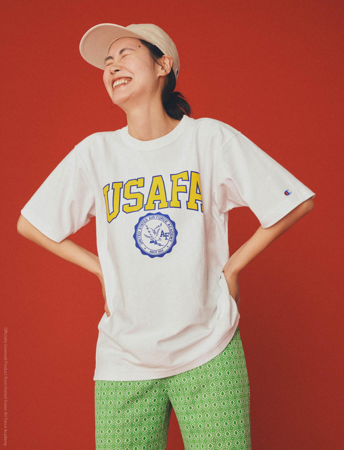 レトロな雰囲気があるロゴTは、色や小物選びで70’sな雰囲気に。目を惹くイエローとブルーの「USAFA」ロゴには、鮮やかなグリーンのパンツを合わせて爽やかにまとめ、ベージュのキャップで少しだけ落ち着きを与えた。
