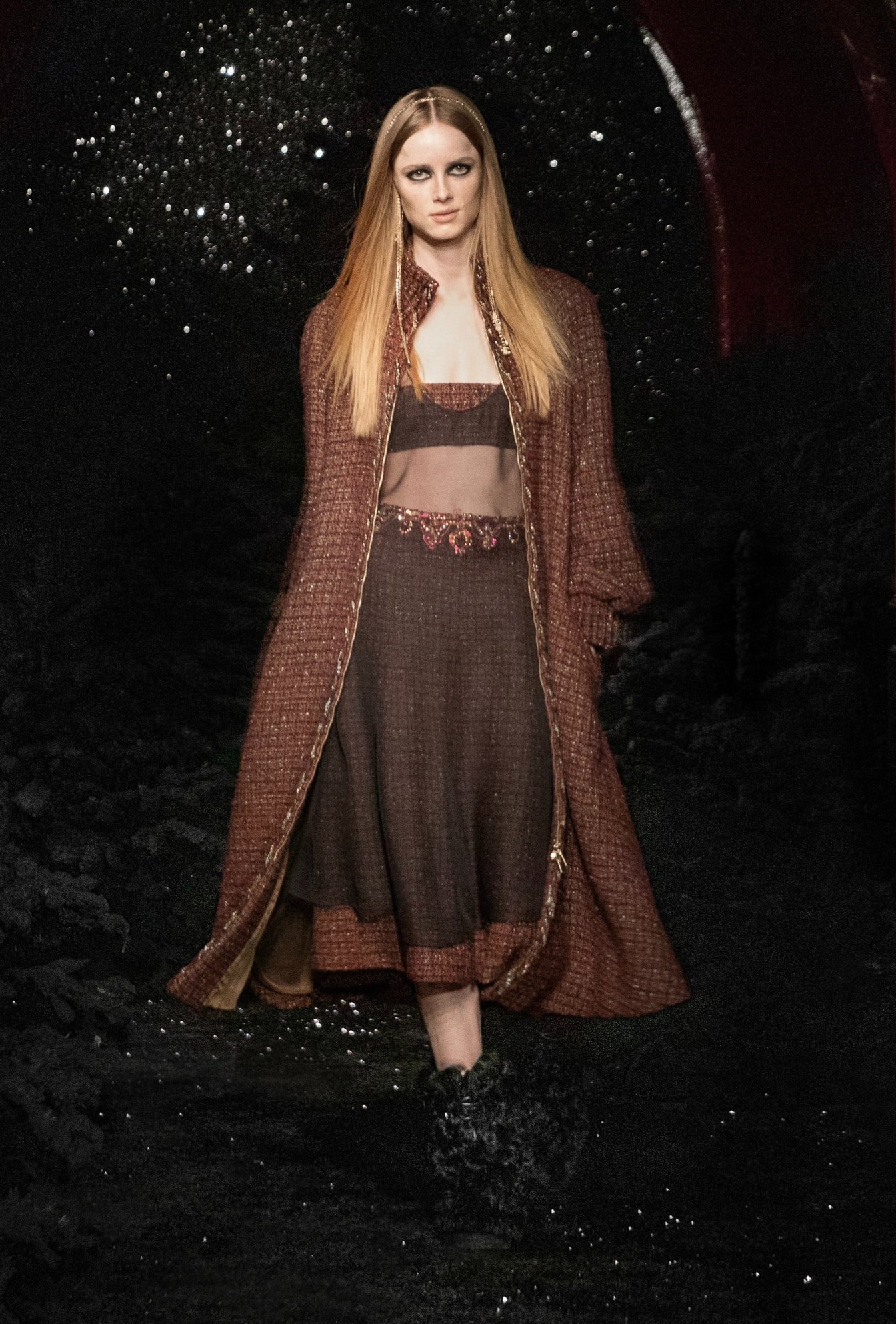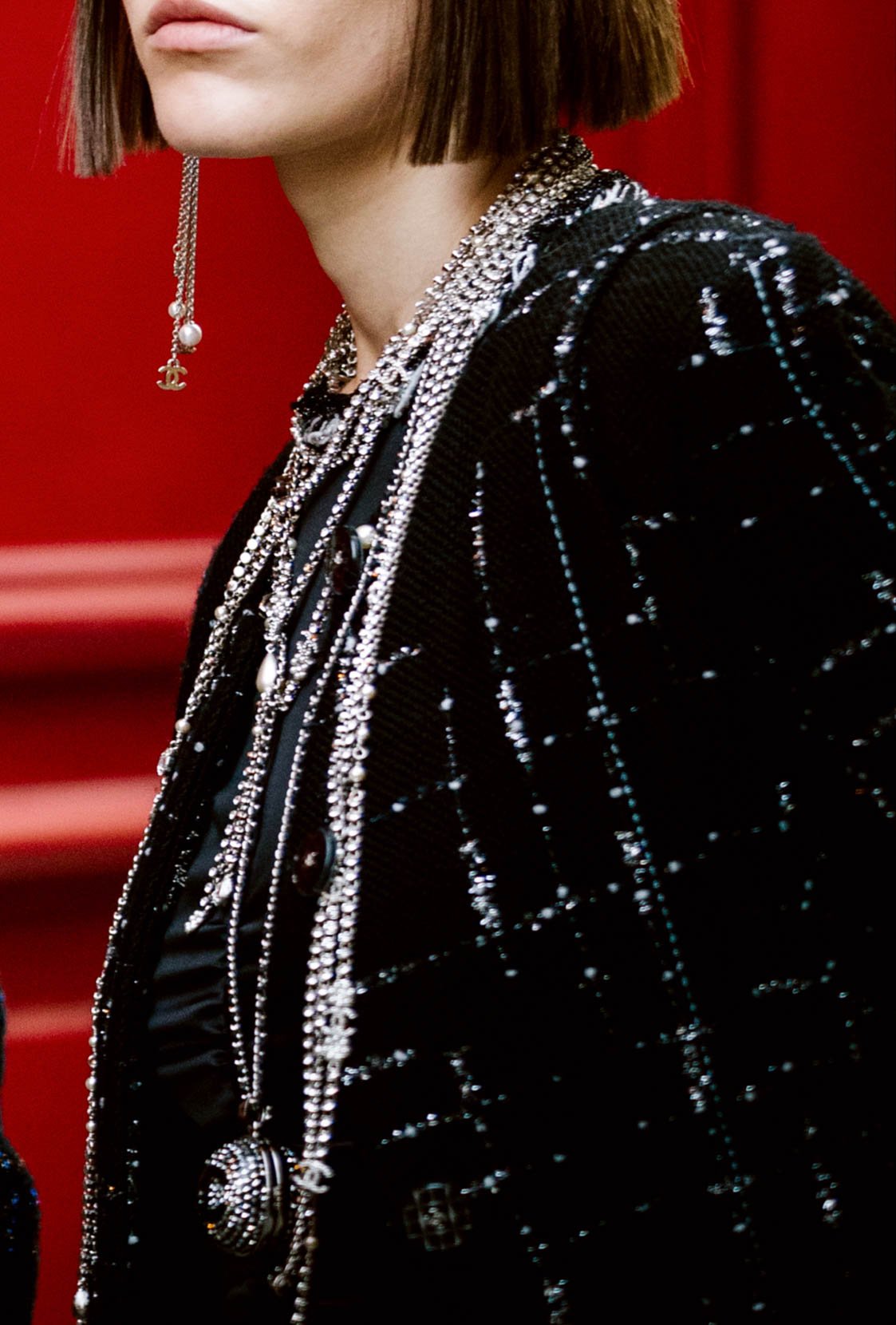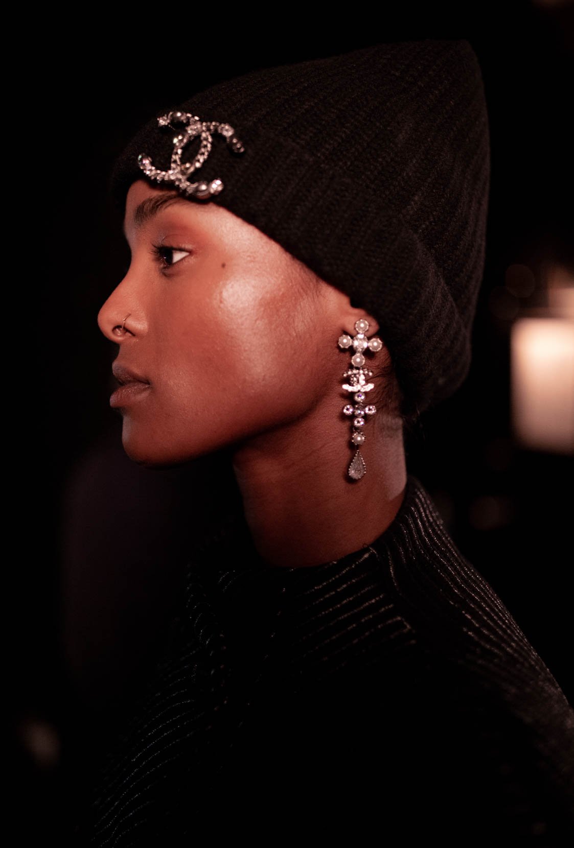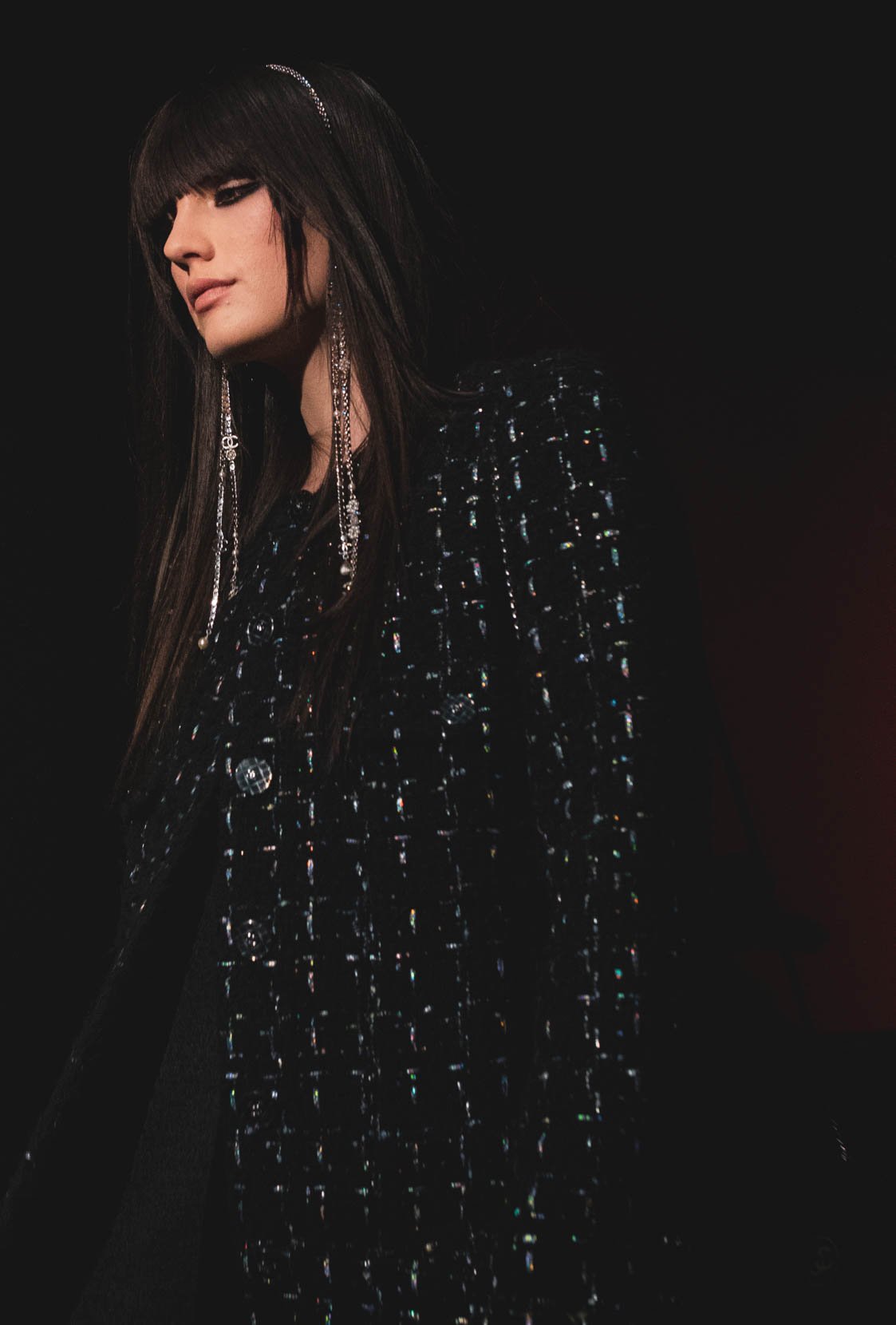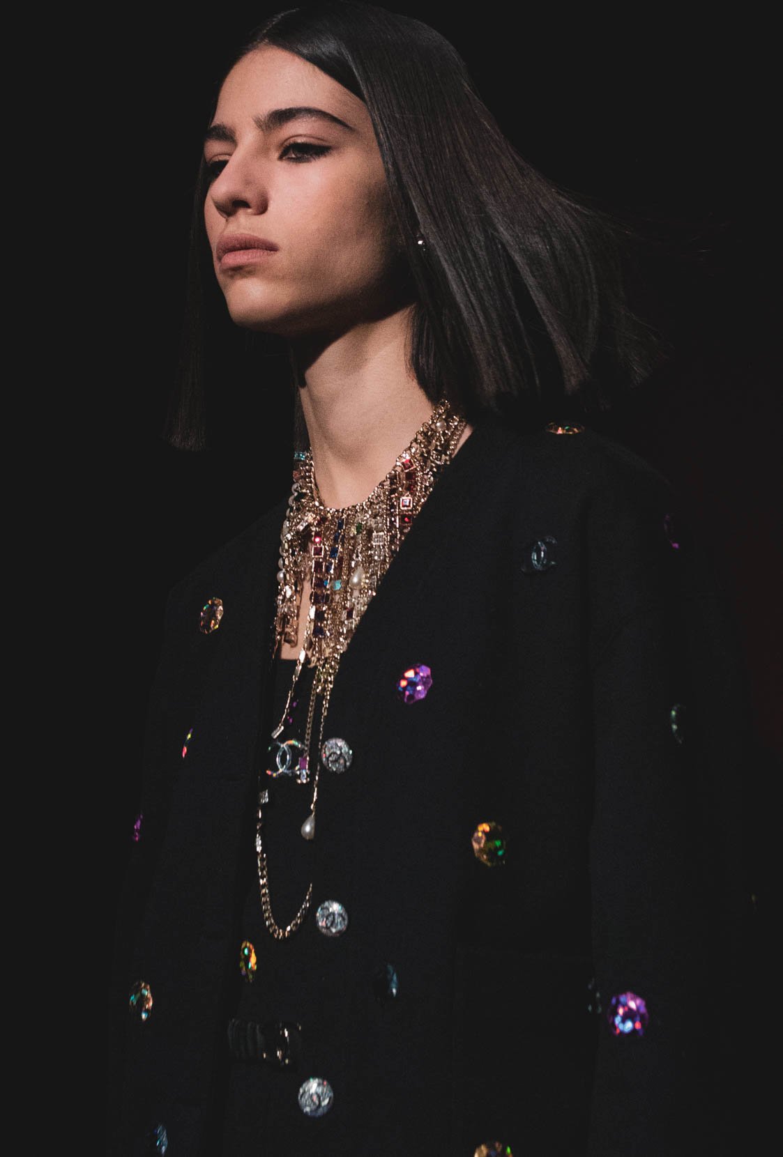 がらんとしたパリの街をモデルたちが歩き、屋外でランウェイが始まるのかと思いきや、扉の中に......。ショーフィルムが撮影された場所は、パリ・サンジェルマン地区で1960年代から続く伝説的なクラブ「カステル」。多くのアーティストやシンガーなどの著名人も好んで訪れた場所だという。クリエイティブディレクターのヴィルジニー・ヴィアール(Virginie Viard)が、シャネルのホームである改装中のグラン・パレを離れ、この場所を選んだのは、ボリューミーな冬のアイテムを敢えてコンパクトな空間で見せることでコントラストを表現したかったから。プライベート感が溢れるコージーな空間で、モデルたちが自分たちで着替えを行い、メイクアップをしてショーを行う姿はまるでガールズナイトのようで、このアイデアはカール・ラガーフェルド(Karl Lagerfeld)との過去の会話からヒントを得たものだという。