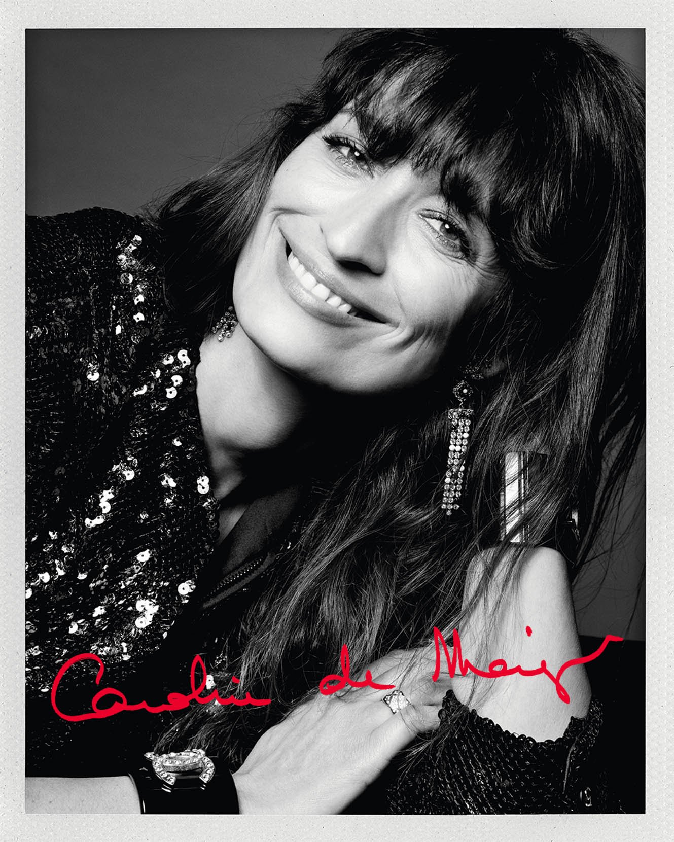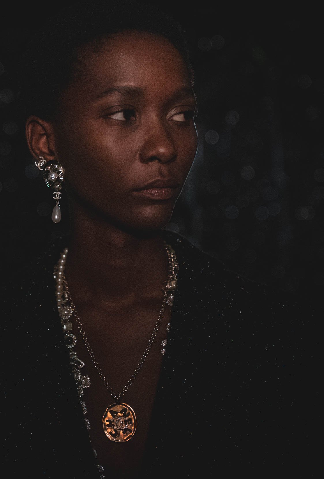また、それぞれのスタイルにメゾンのエッセンスを加えるアクセサリーの数々。幾重にも重ねたネックレスやロングピアスと合体したようなきらびやかで繊細なカチューシャ、パールのサスペンダーやセンシュアルなガーターリング、ネックレスのように首から掛けられるミノディエールなど。