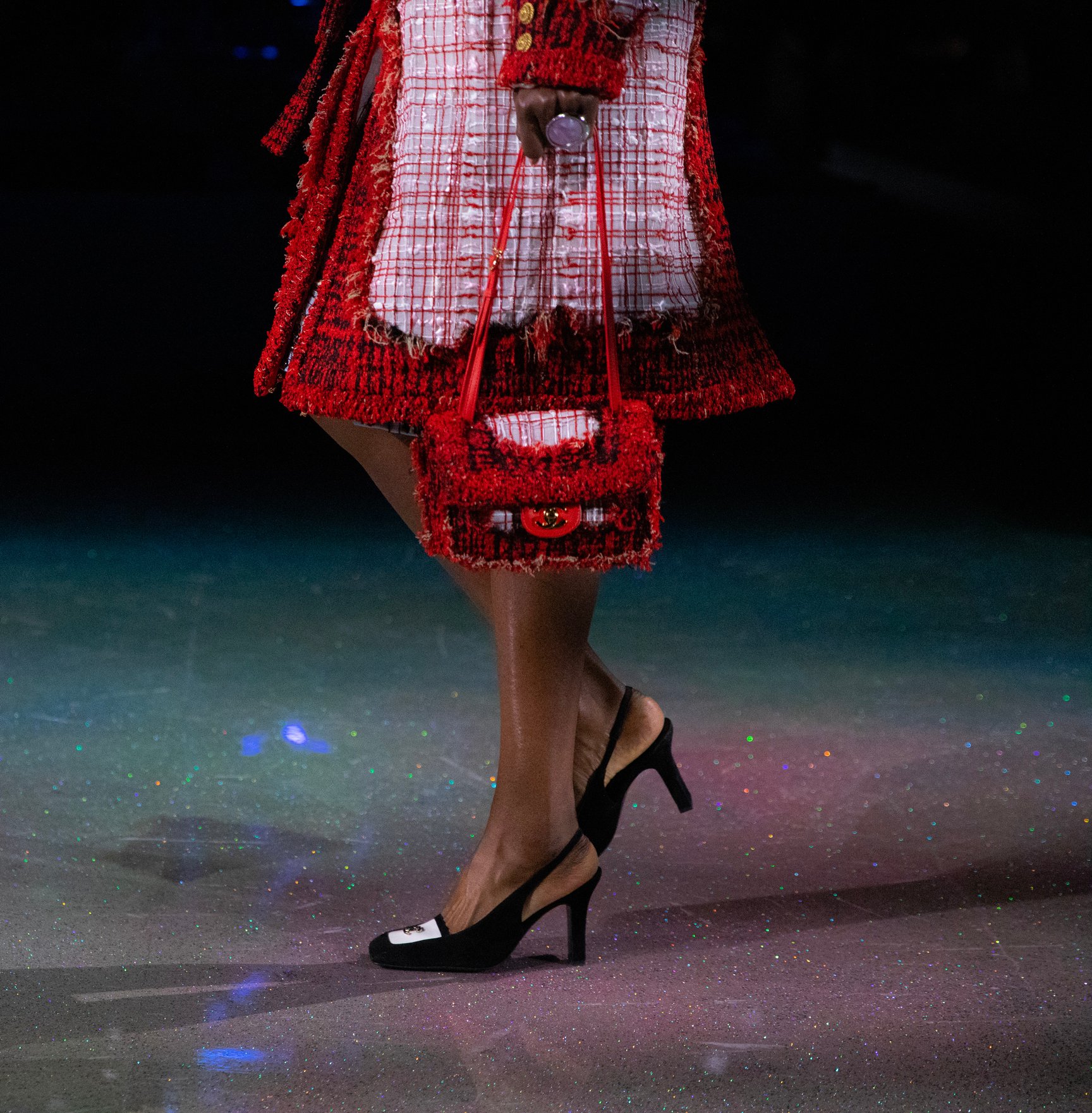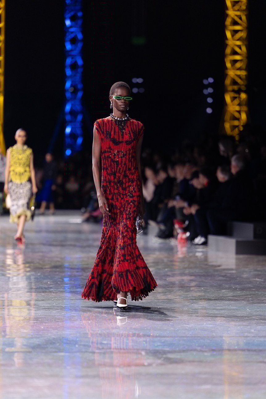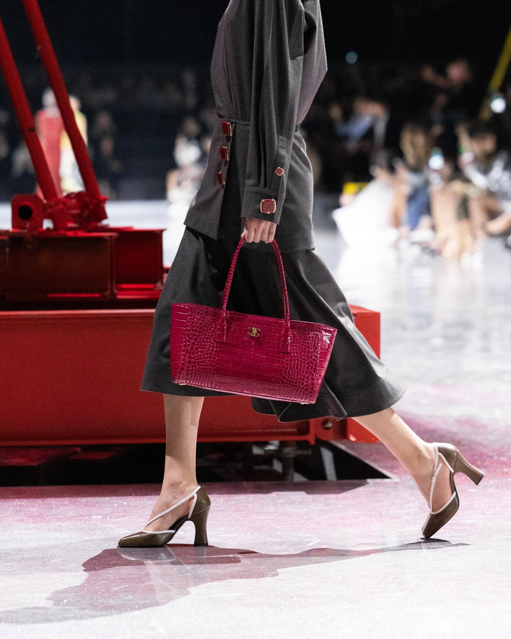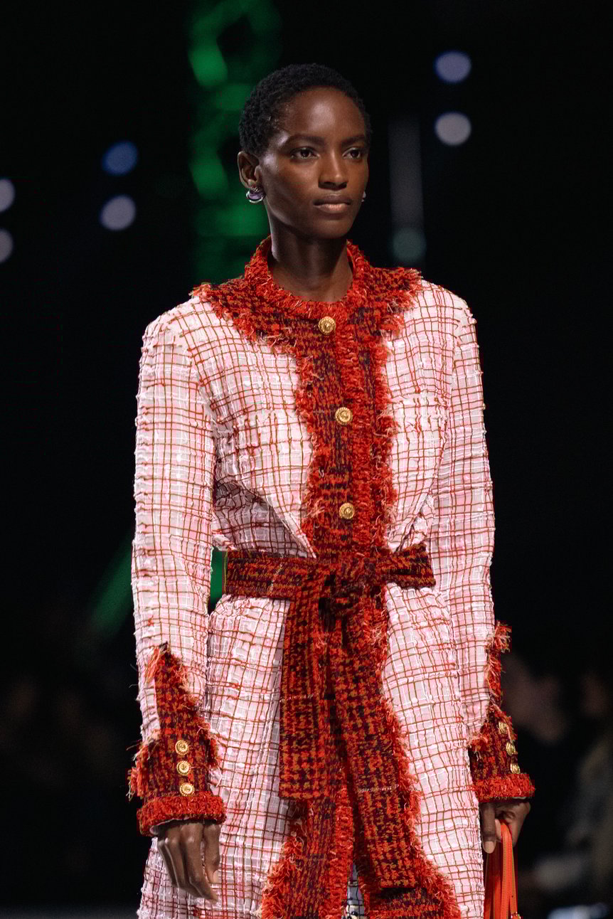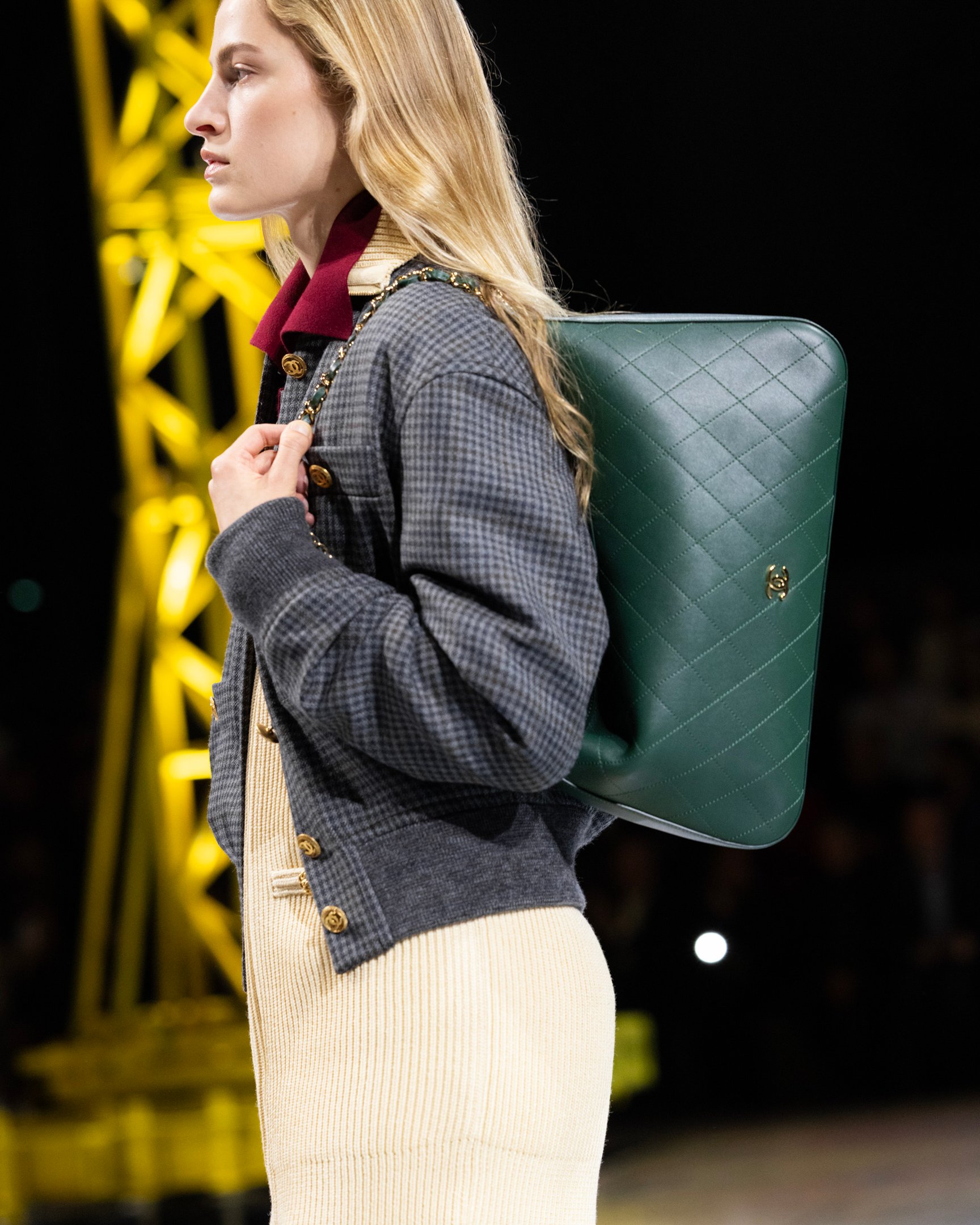 ランウェイに惑星が浮かぶ宇宙を表現した前回を引き継ぎ、さまざまな色が混ざり合った銀河のような床が広がる。そこに立ち並ぶのは、赤、青、黄とカラフルに彩られた巨大なクレーン。「The functional and the artificial. The construction of a new suiting language.(=機能と人工。新たなスーツの言語の構築)」という公式インスタグラムの投稿のとおり、新たなシャネルを"構築"していくマチューのアプローチと重なる。