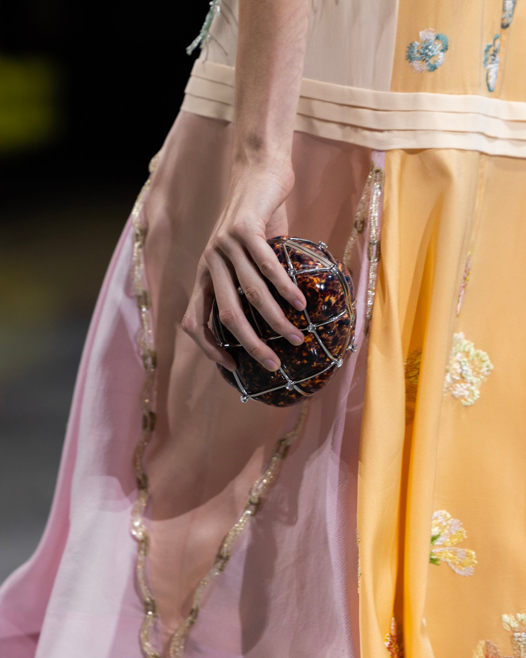 バッグは実用性と遊び心を取り入れ、ガブリエルのソファから着想を得たスエードバッグ、キネティックなクラスプをあしらった最新バッグなど、幅広く提案。ザクロ型のイヴニングバッグは、遊び心と色気をまとう夜の装いを完成させた。