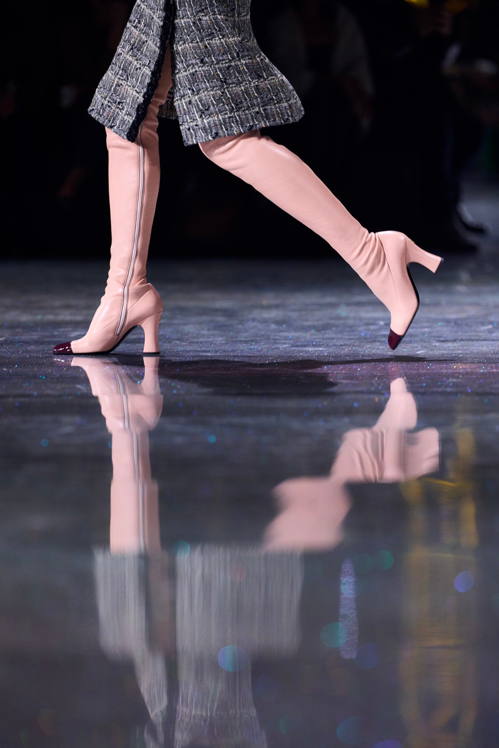 エナメルとレジンのアクセサリーは、印象派の絵画のような輝きを放つ。パステルカラーで展開された、セカンドスキンのようにフィットするソフトレザーのバイカラーブーツも印象的だ。