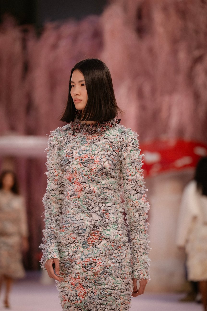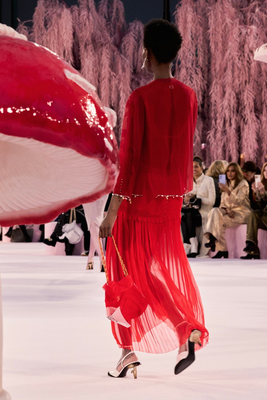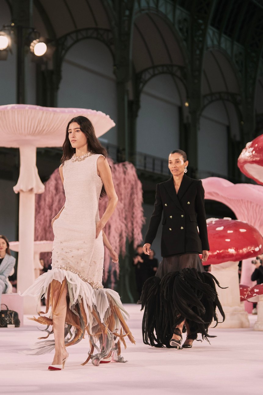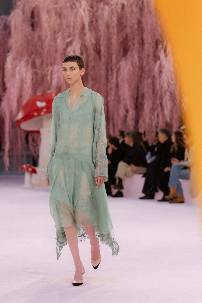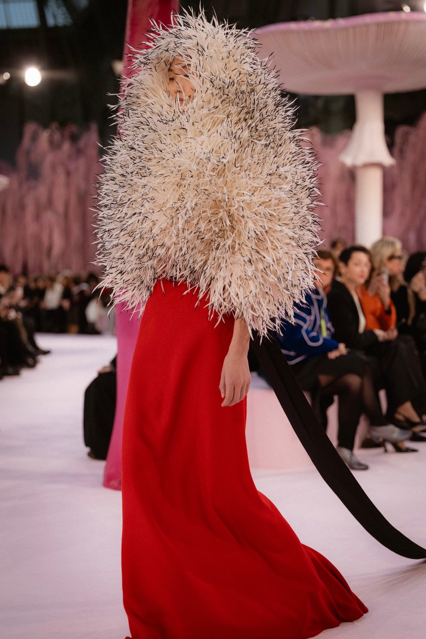 グラン・パレのガラス張りの丸屋根の下、ショー会場には桃色の柳の木々と巨大なキノコが立ち並び、おとぎ話のような空間が広がっていた。昨年10月のプレタポルテコレクションで表現した壮大な宇宙空間の演出から一転し、ミクロの世界がオートクチュールの繊細な手仕事と共鳴する。