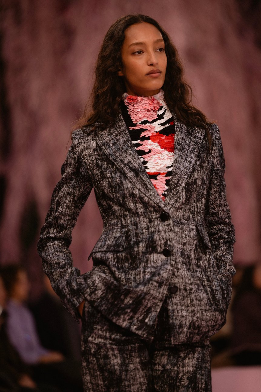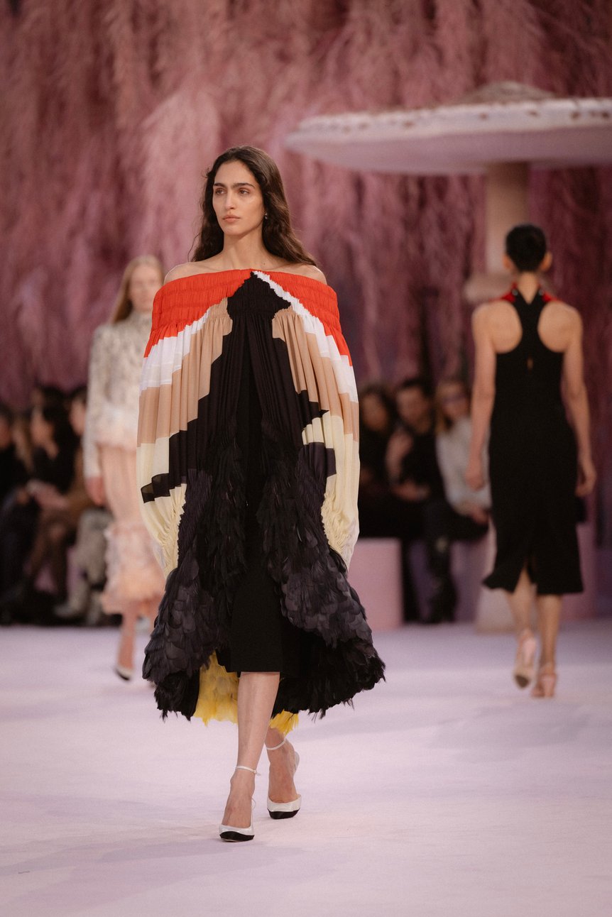 サヴォアフェールの核にあるのは、1915年以来、カンボン通り31番地のアトリエで受け継がれてきた精密さだ。卓越した手仕事が、総刺繍のオーガンザ、グラデーションのツイード、きらめくビーズ刺繍といった結晶となって、シンプルなテーラードやドレスを飾る。羽のように見えて実はシルクなどのテキスタイルで表現していたりと、目を惑わせるほどの繊細さ。ドラマティックなフォルムと多彩な色使いが、さまざまな鳥たちの姿を想像させた。