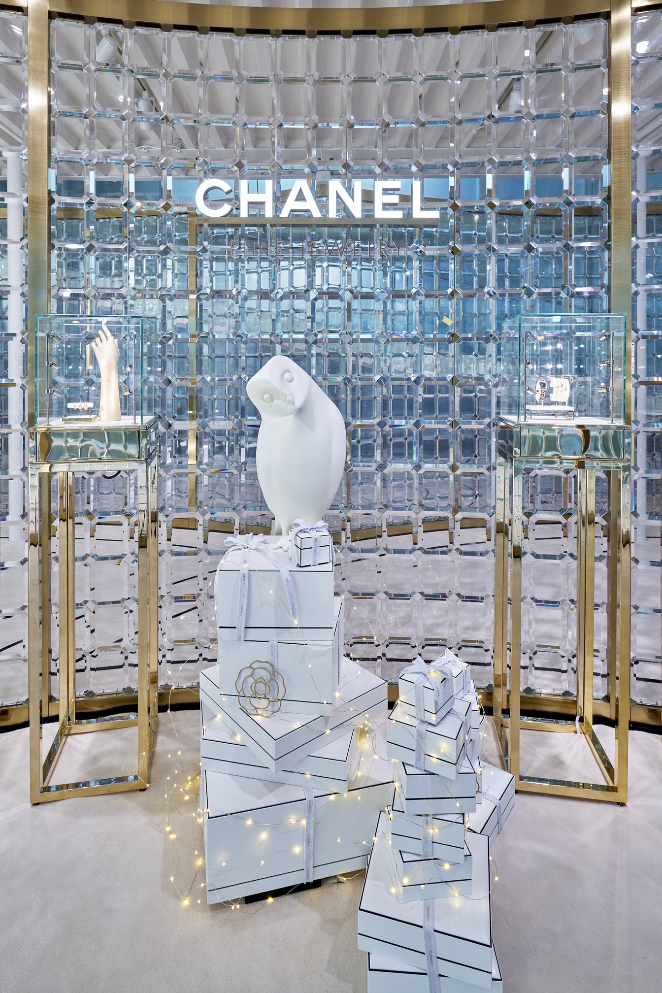 シャネルのホリデーを彩るディテールも見逃せません。フェスティブなムードに没入できる、ゆったりとしたソファーの周りはギフトボックスで飾られ、スノードーム型のディスプレイも。フロアに目を落とすと、ここにもシャネルを象徴するモチーフの数々が散りばめられています。週末限定で、コーラス隊によるクリスマスソングの歌唱も行われ、一層華やかな空間に。