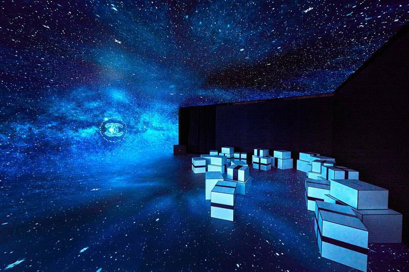 そしてその先の扉が開くと、4Dでシャネルの星空へと旅立つ体験空間へ。壁、天井、床に設置されたLEDスクリーンに映し出される、光に操られた街に降る雪、そして星、さらには5つのシンボルが映し出される。大きなギフトボックスに座って鑑賞すると、スペクタクルに合わせて振動が。約3分間、シャネルの世界へ没入。