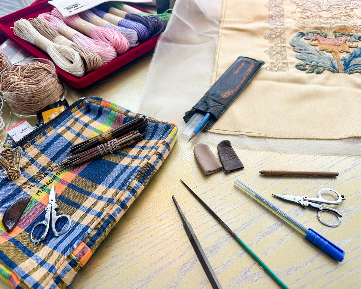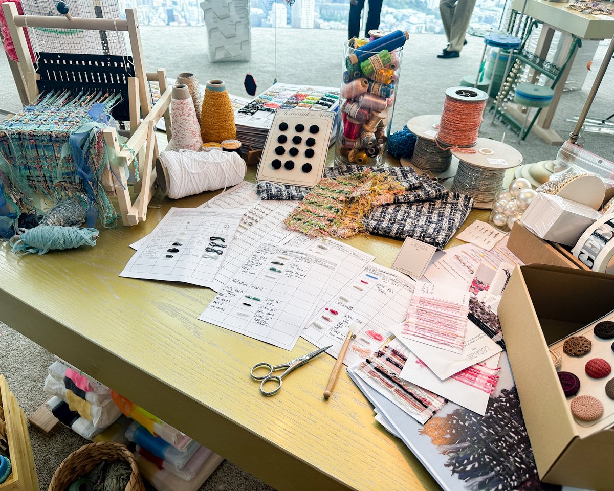 会場を進むと現れるのは、メゾンの創造に欠かせないルサージュの工房。製図や織物職人、刺繍職人、パタンナーなど、さまざまな工程の作業台が並び、実際に職人たちが使用している道具なども展示されている。美しいドレスやバッグ、靴が完成するまでの道のりを、手仕事によって辿るような空間だ。