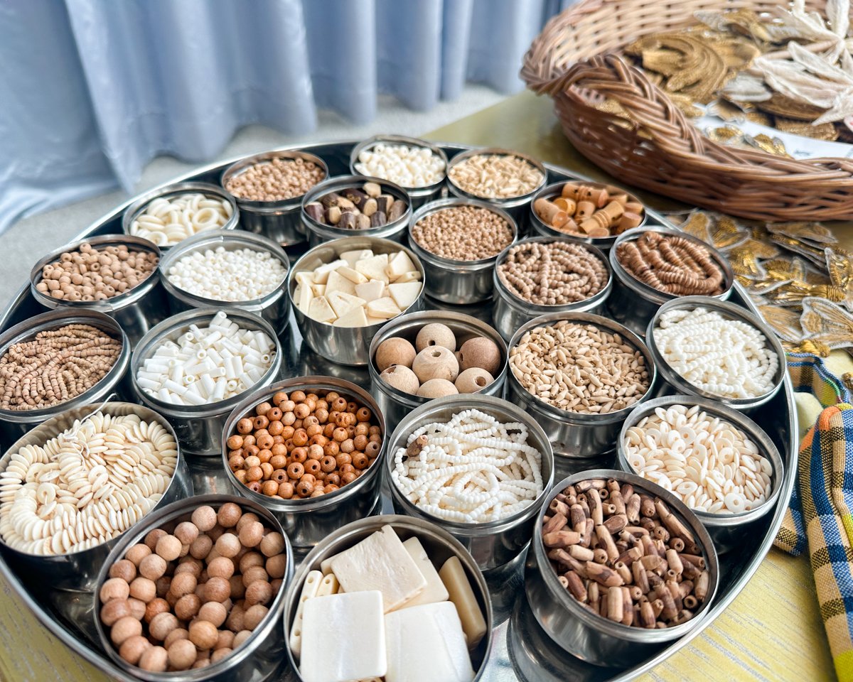 膨大な原材料や道具、サンプルが作業台の上に並べられ、壁に掛けられた写真や天井から吊るされたオブジェクトとともに、ゲストを包み込む。会場を進むにつれて、自然と職人たちの繊細な技術への興味関心が掻き立てられる。