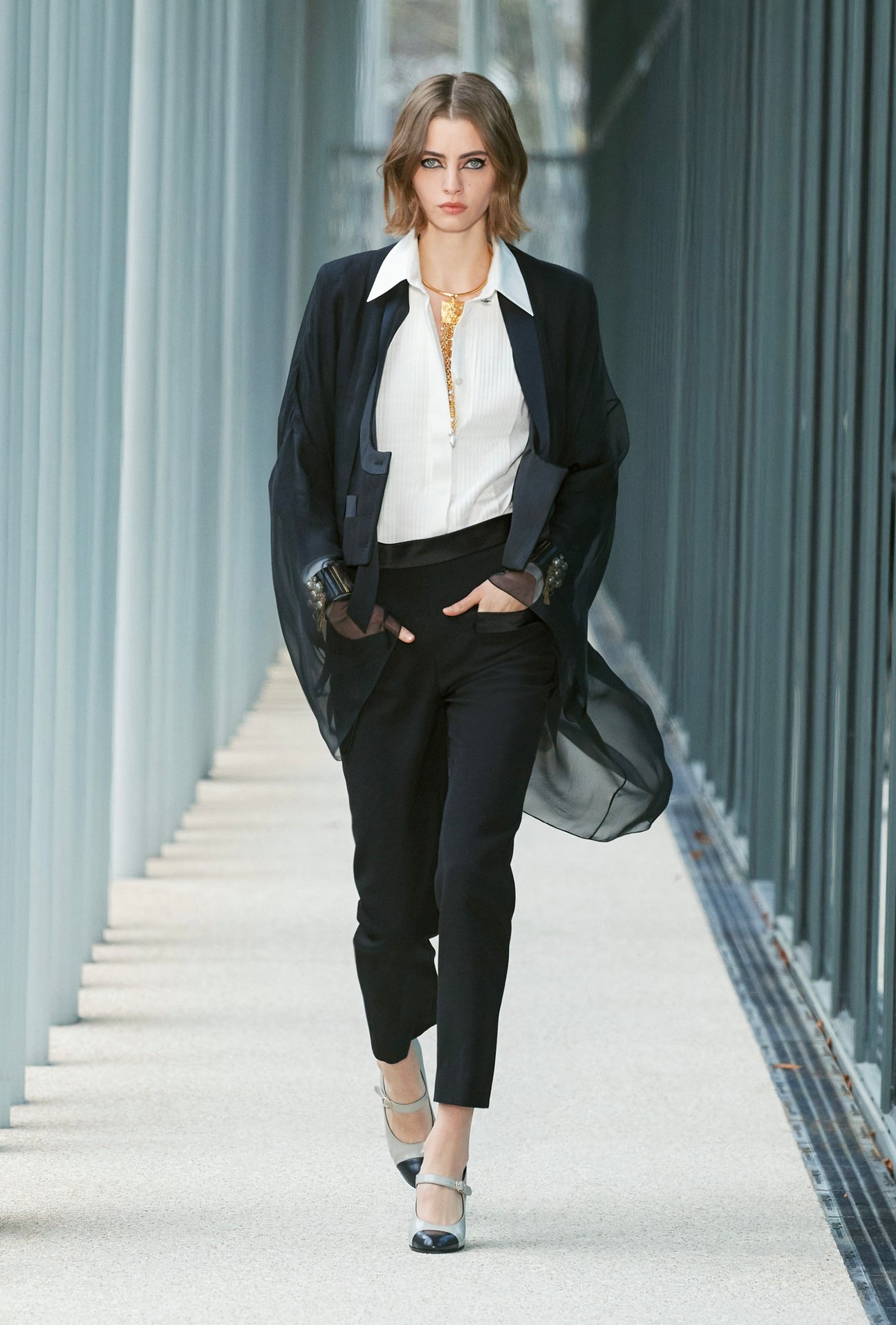 アーティスティック ディレクターのヴィルジニー・ヴィアール(Virginie Viard)が手掛ける今回のメティエダールコレクションは、都会的で洗練されたスタイルの随所に、職人たちが技巧を凝らした装飾が施されている。ファーストルックをはじめとするシルバーのスパンコール刺繍はアトリエ モンテックスが手掛けたもので、le19Mの白い系を張り巡らせたような外観からインスピレーションを得ているという。