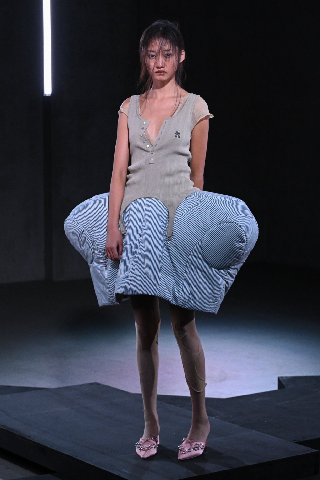 一方で、ヒップや下半身を歪にデフォルメしたようなシルエットのパファー素材を使ったスカートやワンピーススタイルも象徴的。今にもはち切れそうなボリューム感も相まって、内に蠢くものが解き放たれる、「メタモルフォーゼ」を予兆させる。