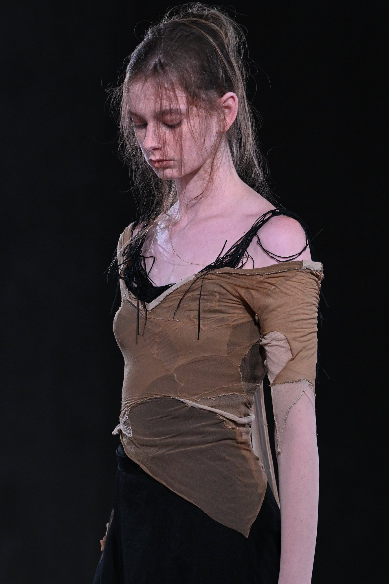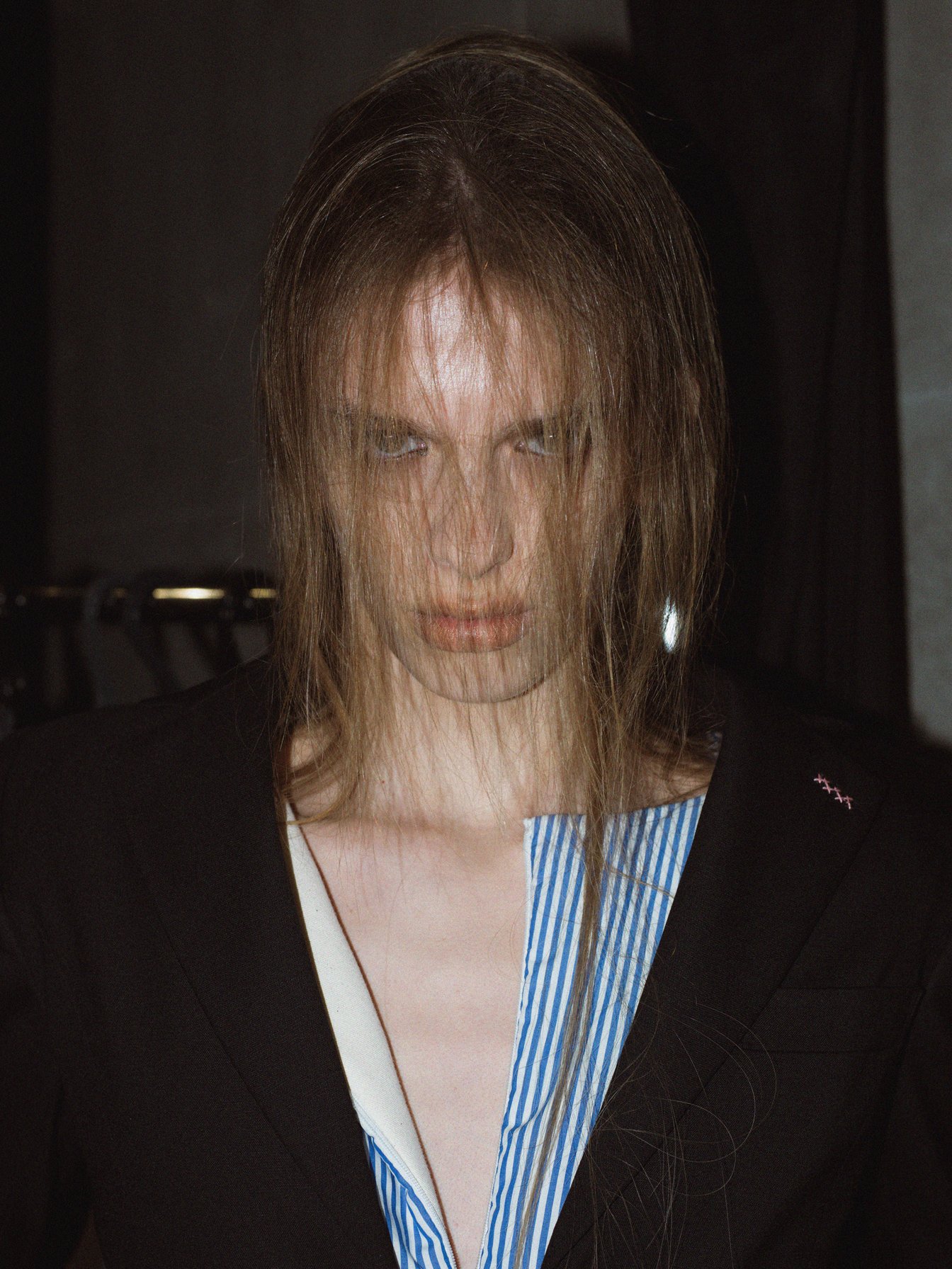 全てのルックを、たった4人のモデルの交代で見せたのも、一般的なバレエの豪勢な公演と対比的な空気を醸し出した。ヘアはセットの途中、あるいは「まだ外に出る予定ではなかった段階」で登場してしまったかのような、乱れた様子も。前髪は無造作なのに、その奥には、決して虚ではない意志のある瞳が光る。