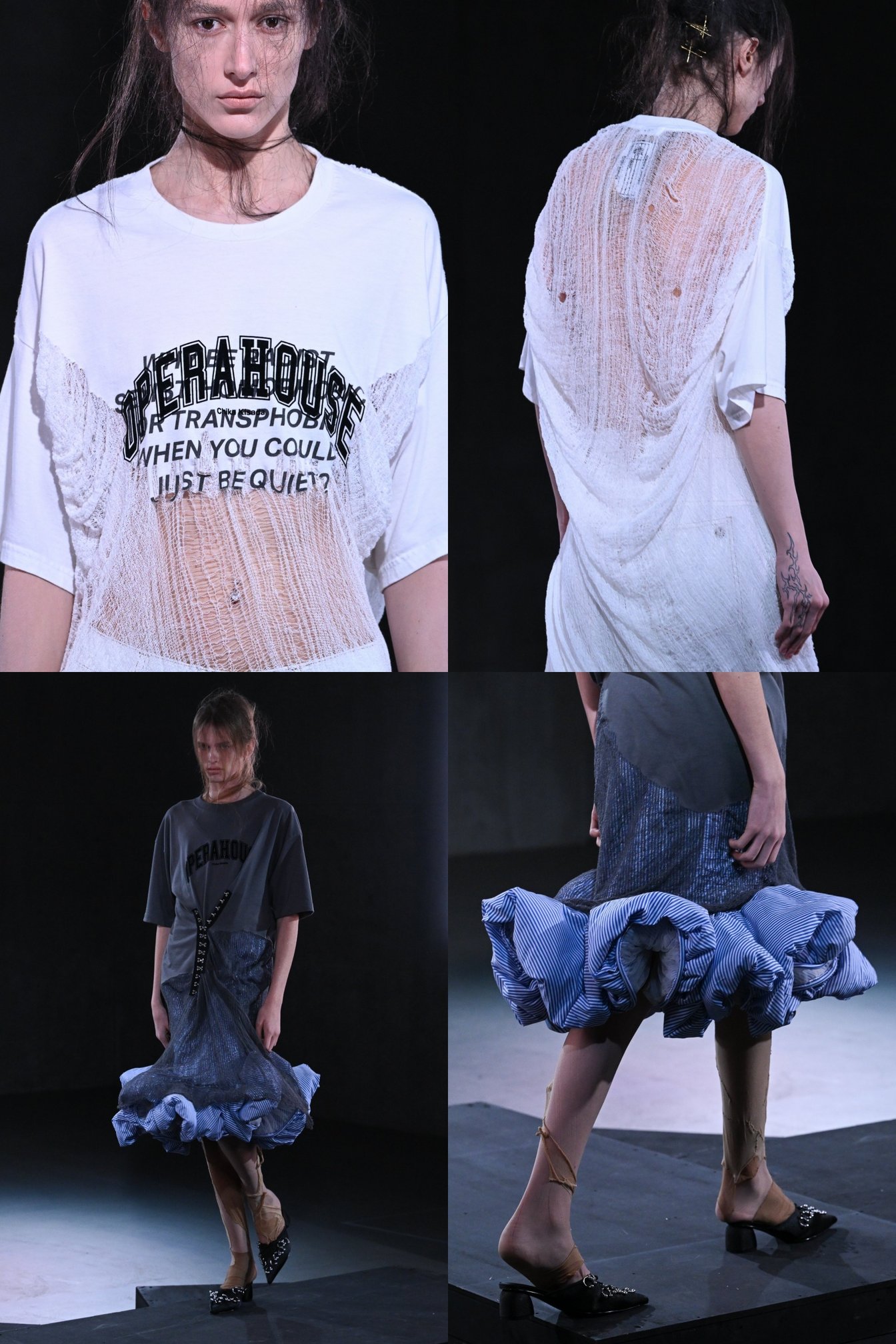 肌が透けるほど薄く解かれたTシャツは、インパクトのある見た目に反して、丁寧な処理によって作られていることが想像できる(このアイテムも林とのコラボピース)。そしてロックT調に描かれた「OPERAHOUSE(オペラハウス)」の上には、心身の特異性に対する攻撃を非難する強いメッセージがさりげなく記されている。