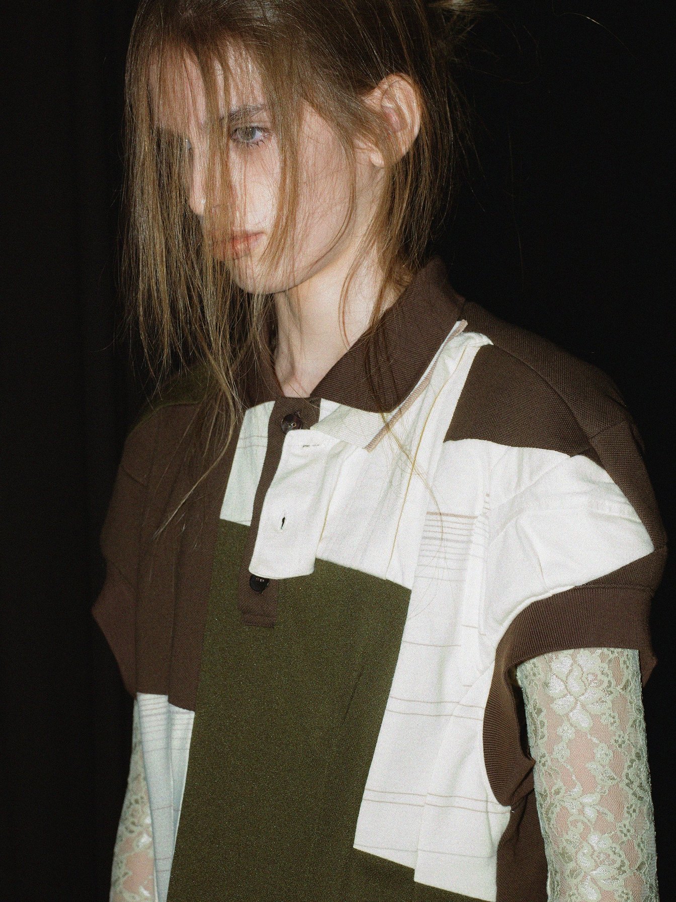 ファーストルックを筆頭に頻出した、破れやひきつれを施したインナーやレッグウェアのレイヤードによる、皮膚が剥がれ落ちたようなディテールは、ボロボロに見えるが、実は生まれ変わるための「脱皮」の過程にも感じさせる。このクラッシュ&レイヤードのアイテムは、アーティストの林ひかりとのコラボレーションによるもの。そして、これらがエッジが効いたレイヤードスタイルとして完成されているのは、幾左田のショーで常連のスタイリスト小嶋智子だからなせる技だろう。