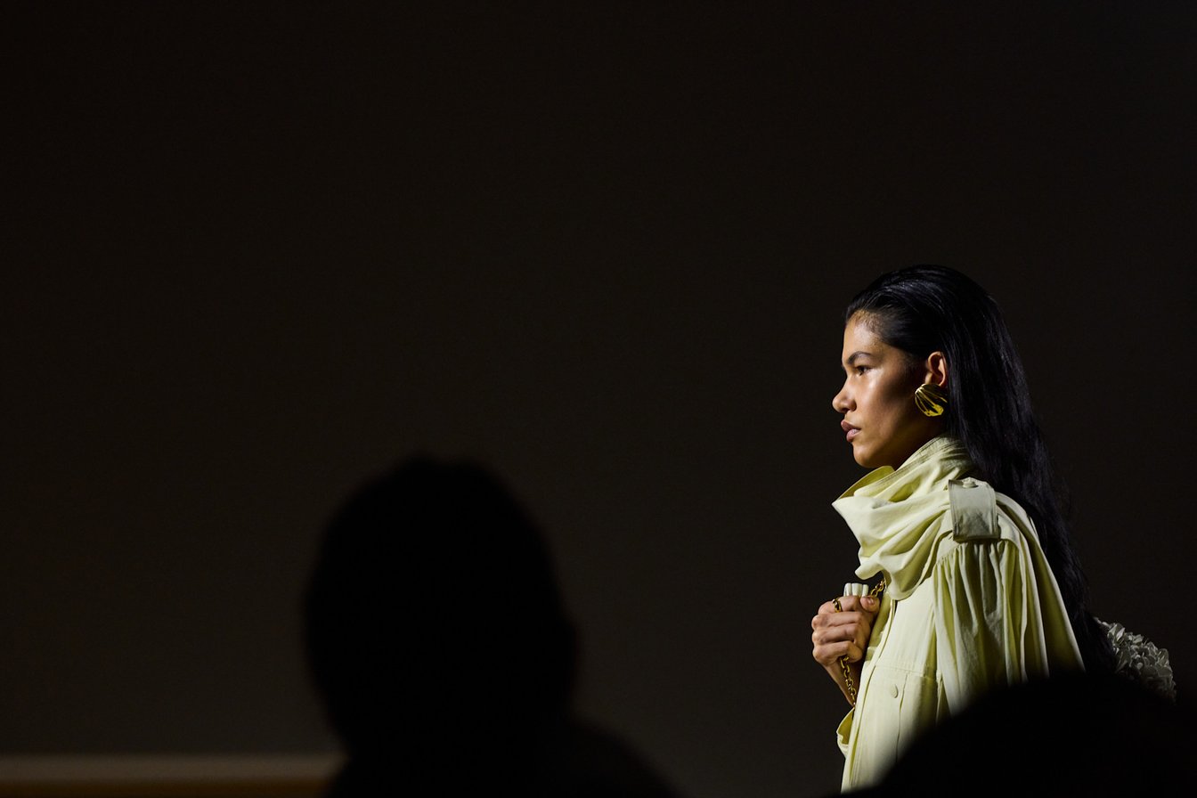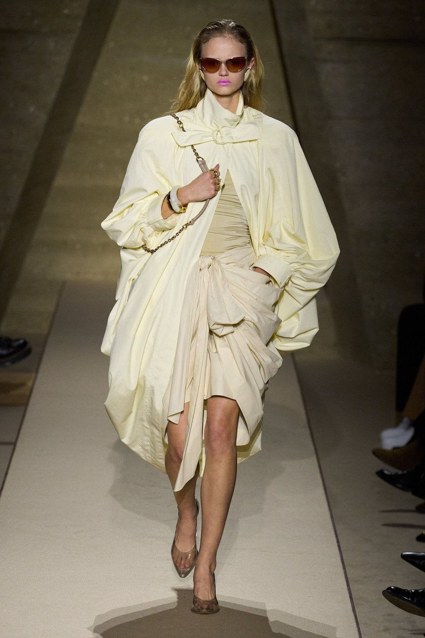 ショー前半では1950〜60年代のアーカイヴに残るフローラルプリントを再描画し、立体的なドレーピングを施したドレスが軽やかにランウェイを彩った。厚手のショルダーパッドが入ったトレンチコートはたおやかでゆったりとしたドレーピングをまとい、アーモンドやレモン、カーキといったクロエらしいカラーリングで登場。
