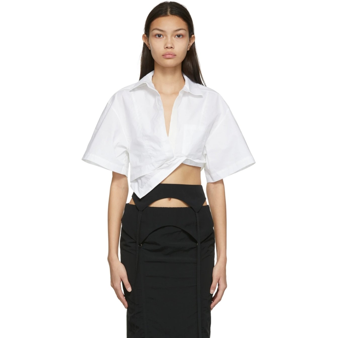 アシメントリに仕立てられたホワイトの半袖シャツは「ジャックムス(JACQUEMUS)」から。オーソドックスなアイテムをキッチュに組み立てる本ブランドならではのアイテムです。立体的な造りなので華奢見え必須なのも嬉しいポイント。